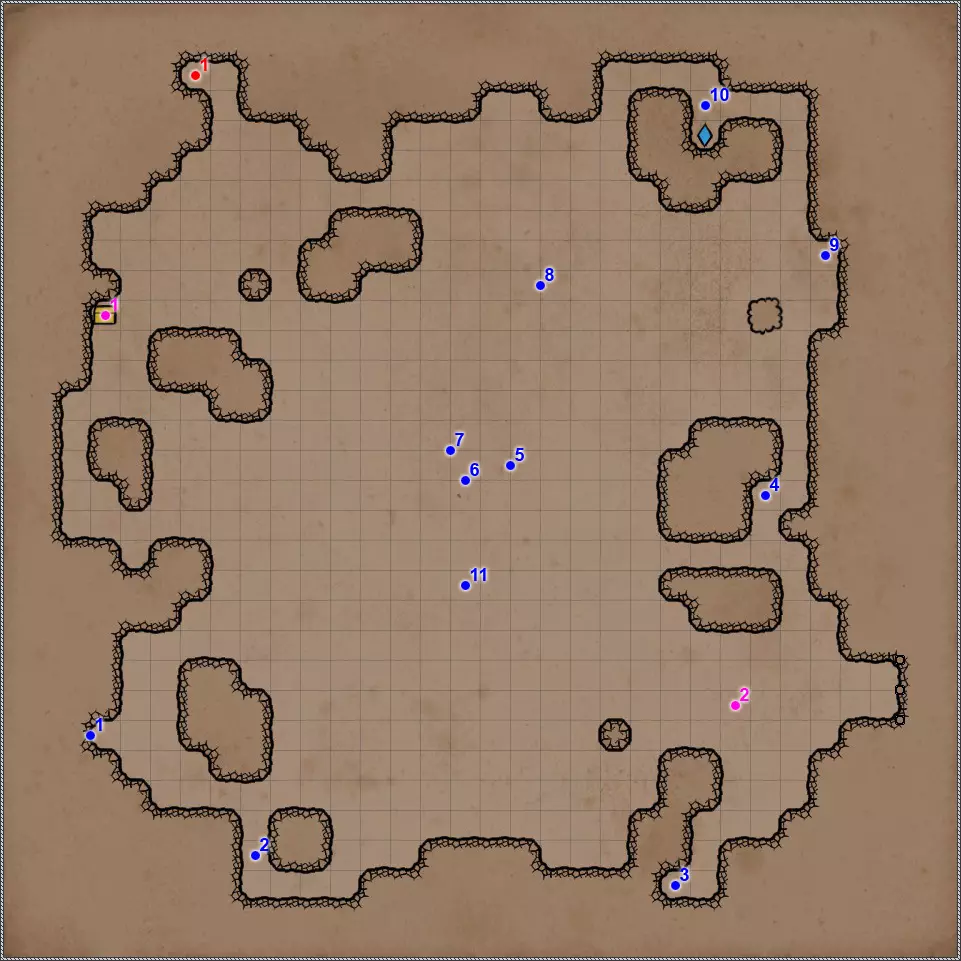 开关/谜题 锁孔。需要【圆钥匙】(出自【细根隧道】,物品编号4)。 拉杆。打开西侧的格栅。 拉杆。打开通往地图主要区域的通道。 将4颗【能量宝石】放在祭坛上,以获得【火焰精华】(元素精华5种中的1种)。 召唤阵。需要站在阵中并使用【召唤号角】(出自【死水手洞穴】,物品编号6)。随后会出现【召唤石】,击败它们后格栅将打开。活石怪是相当棘手的敌人,如果你队伍中没有法师或能造成魔法伤害的武器——普通武器几乎无法对它们造成伤害。 按钮。打开格栅以及格栅后的石墙。