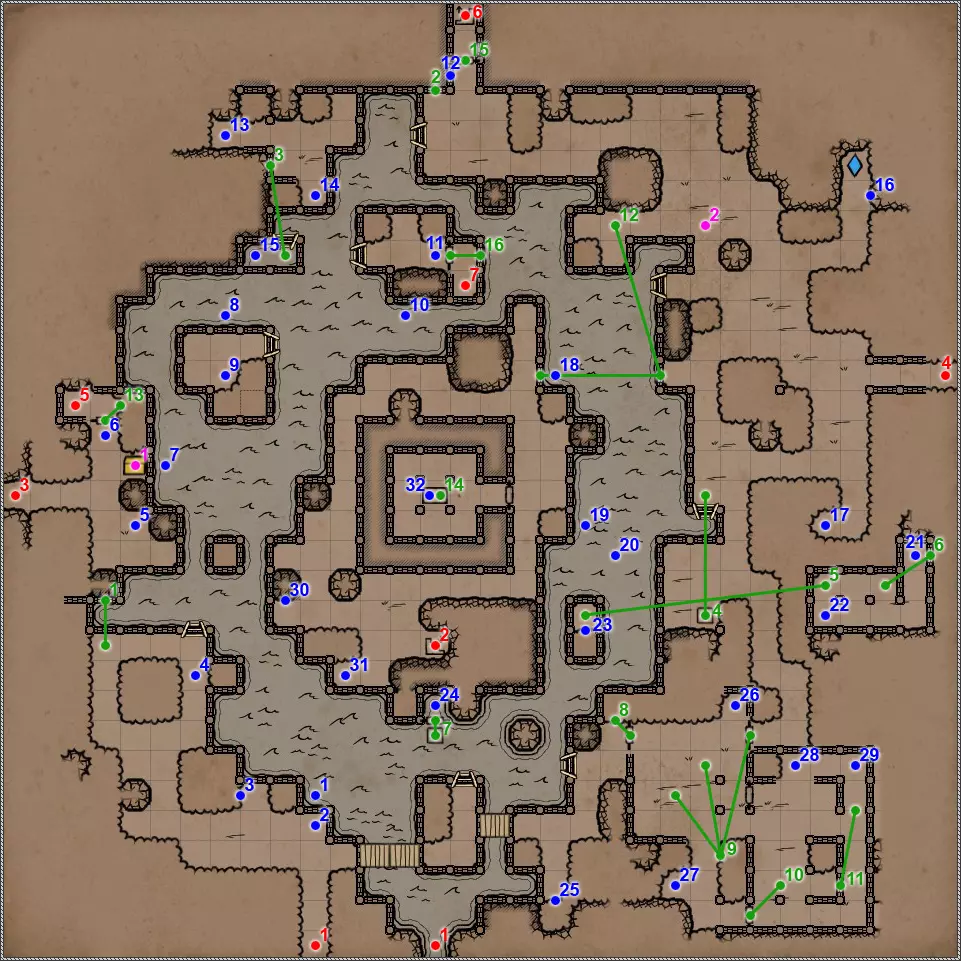 开关/谜题 按钮。 锁孔。需要铁钥匙(物品11)。 两个压力板。站在北侧压力板上,并在南侧压力板上放置物品——门将打开。 简单谜题。需要在石板上摆放物品,形成十字形状。物品之后可以取回。 按钮。将打开通往小区域的传送门。 压力板。通过格栅在其上放置物品。 锁孔。需要华丽钥匙(物品27)。 雕像。将【细剑】(物品编号28)放入她手中,以打开通往【死亡水手洞穴】的通道。 秘密(77个中的第2个):雕像。将【细剑】(物品编号28)放入她手中,以打开墙壁中的秘密通道。 无名宝箱:需要一把【金钥匙】。 按钮:打开通往地图主要区域的通道。 召唤阵:需要站在阵中并使用【召唤号角】(死亡水手洞穴,物品编号6)。会出现毒蛇根,击杀它们后你将获得力量宝石(2个中的1个),并打开通往细枝根森林的通道。