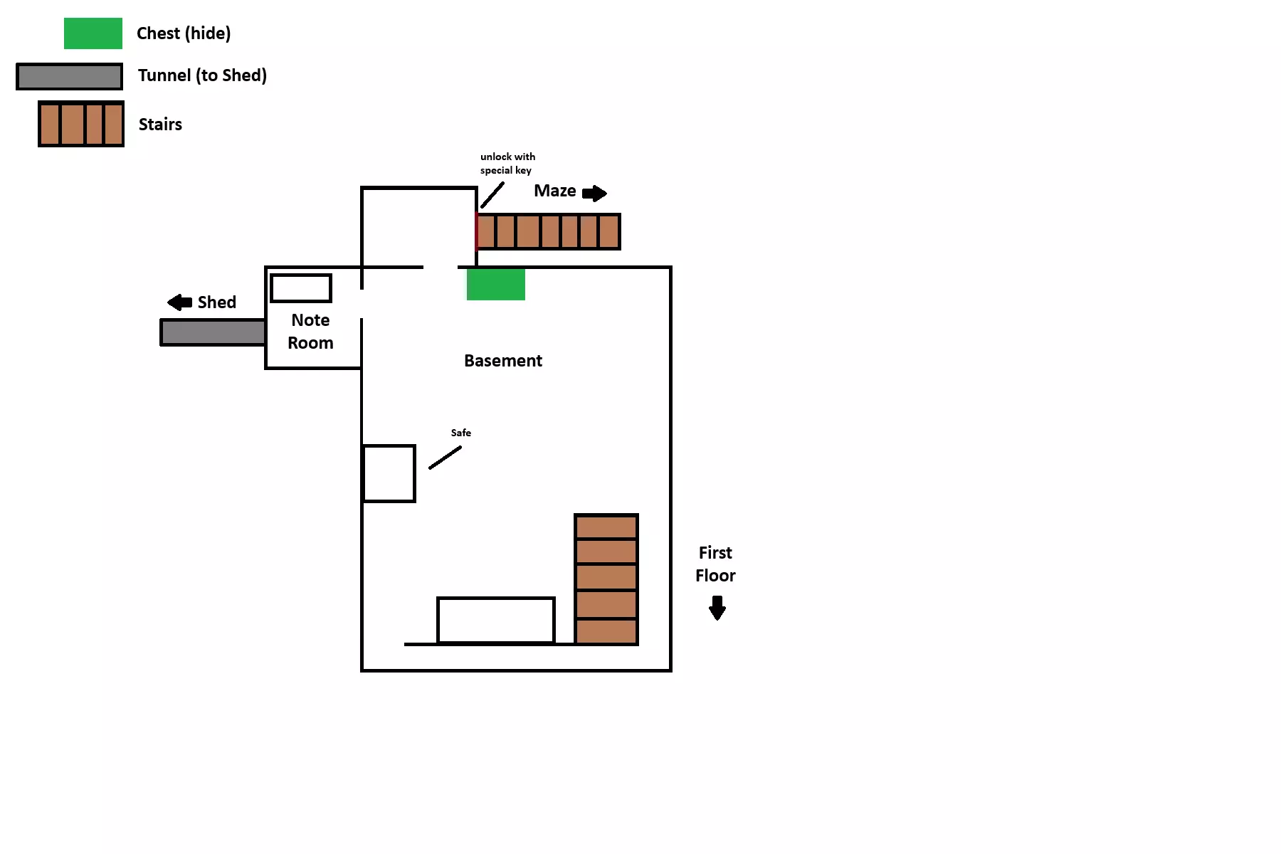 猎枪枪管在开关室内。 汽车钥匙在蜘蛛室内的架子上。 汽油罐在隐藏阁楼室内。 扳手在隐藏阁楼室内的桶上。 地下室: