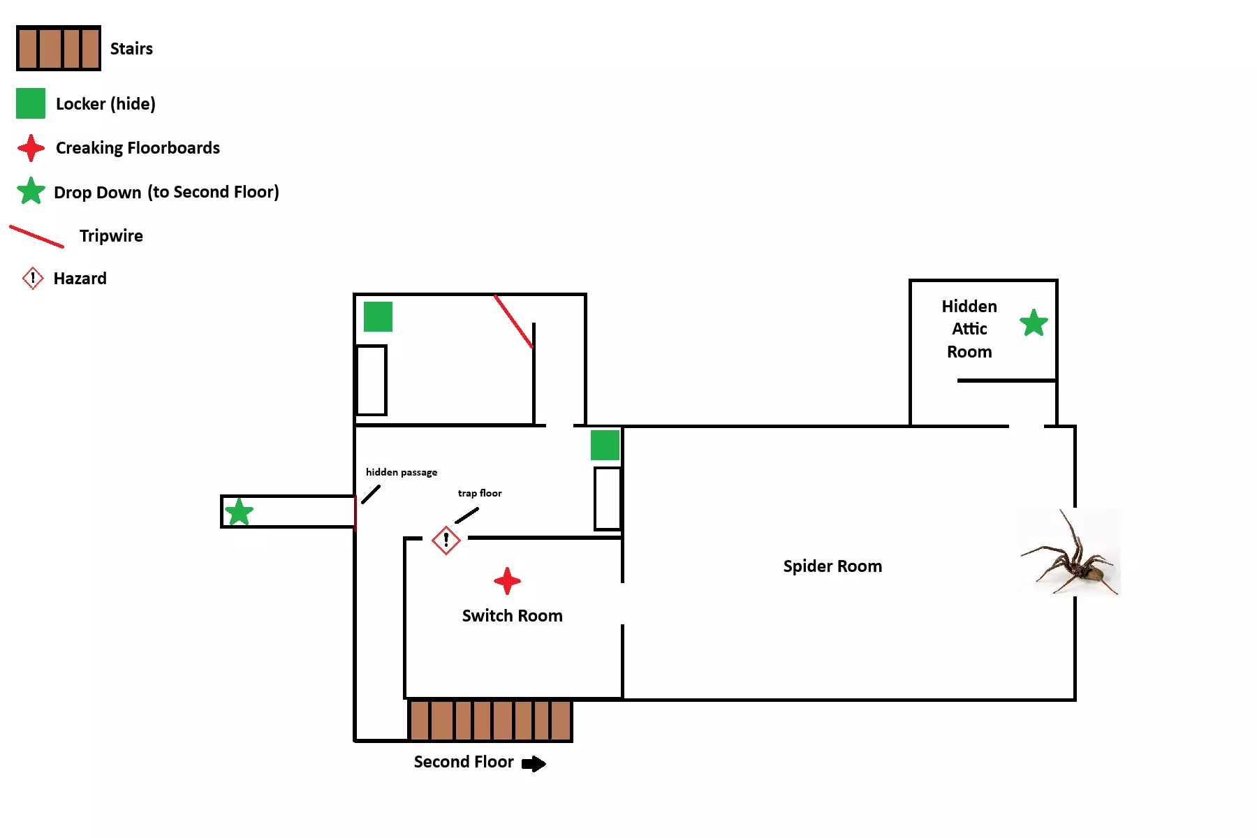 扳手在有绊线的房间里 接线盒在蜘蛛房间 VHS录像带在蜘蛛房间的高柜子里 汽车轮子在蜘蛛房间旁边的隐藏房间里 地下室: