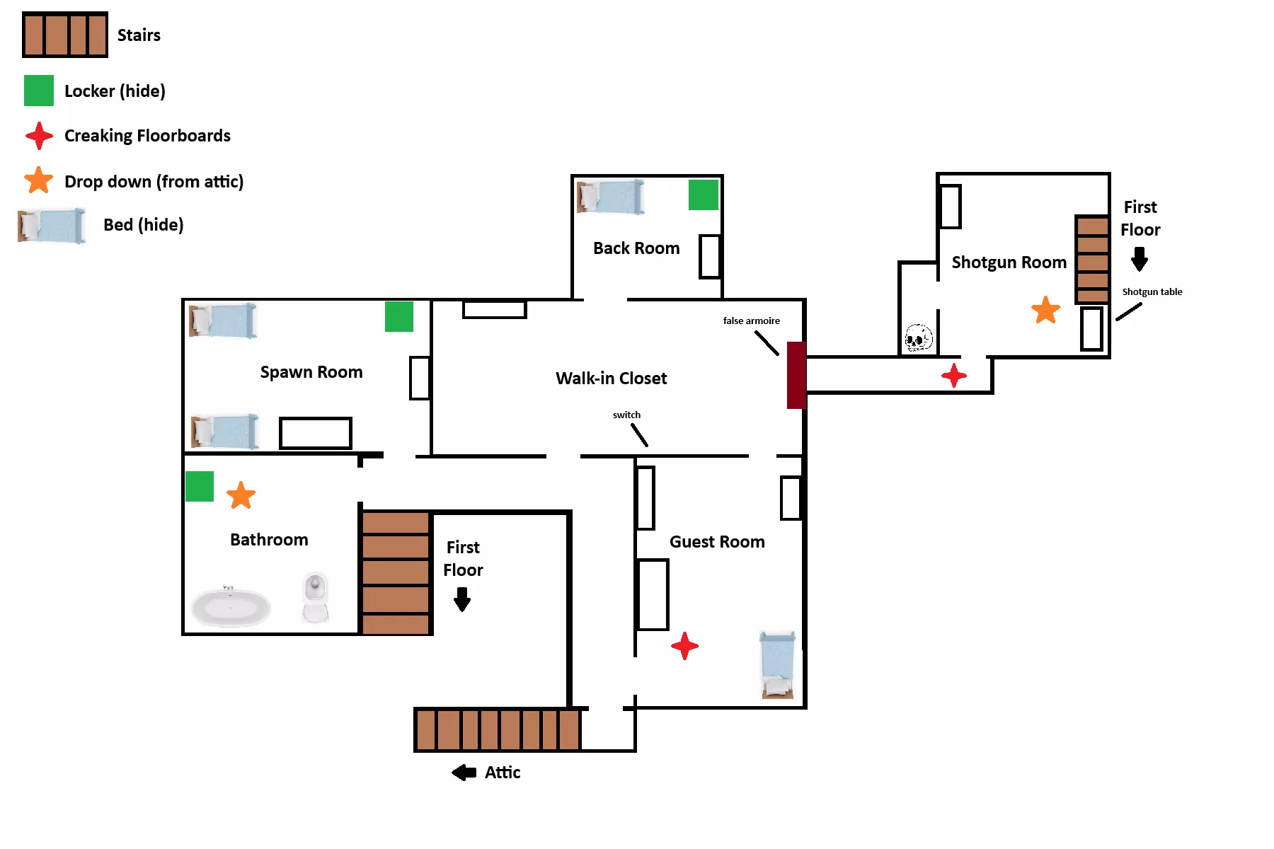 螺丝刀在密室的抽屉里。 猎枪前护木在客房的柜子里。 汽车电池在猎枪室的骷髅柜里。 猎枪子弹在猎枪室的桌子上。 阁楼: