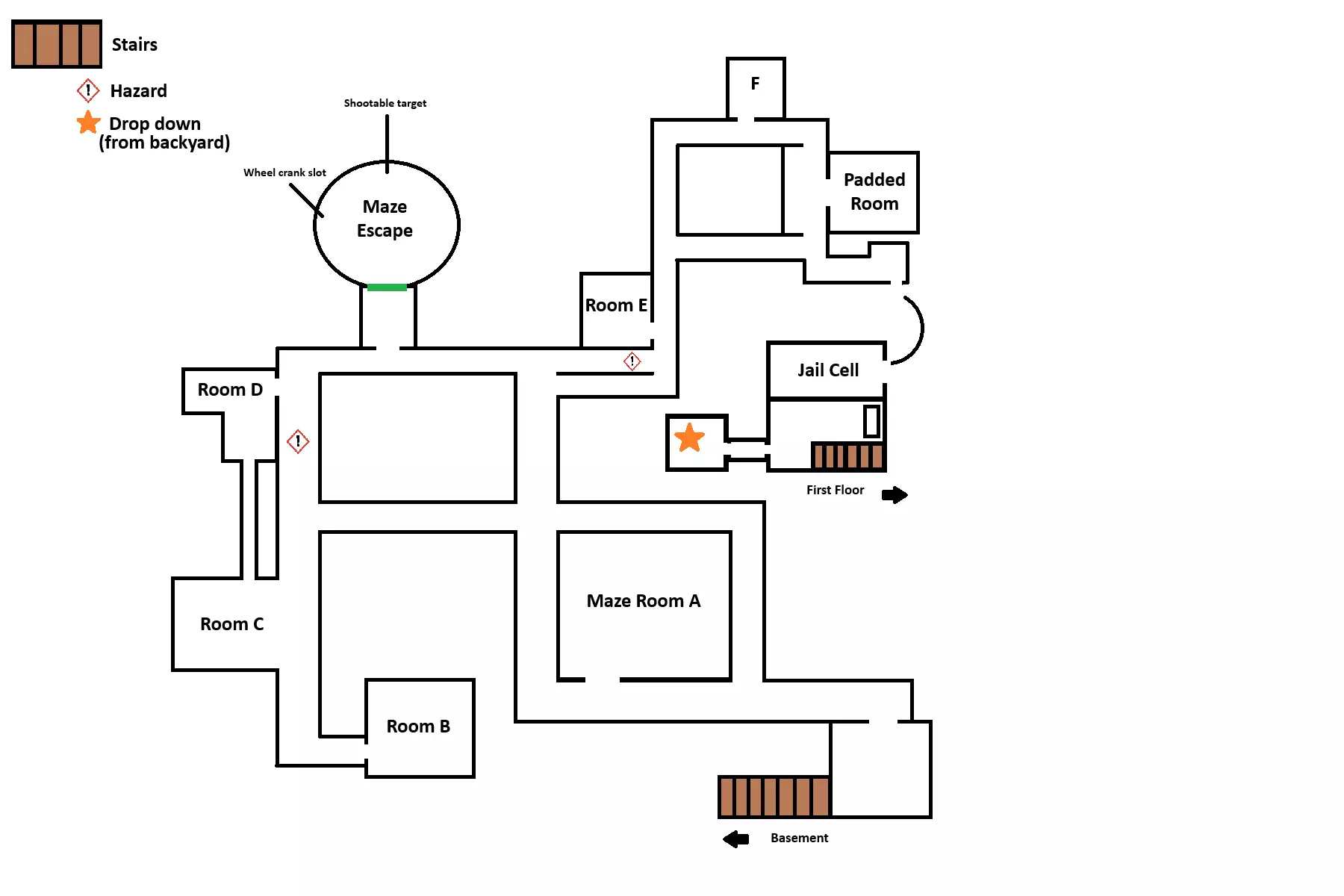 物品位置(Seed C) 一楼: 车轮位于从后院跳下进入的房间内。 保险箱钥匙位于迷宫C房间内。 电线盒位于迷宫逃生前的房间内。 汽油罐位于迷宫E房间内。 锤子位于软垫房间内。 汽车电池位于牢房内。