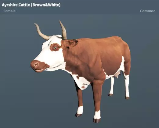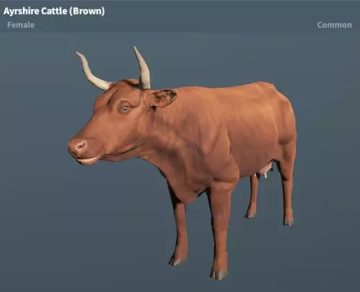 艾尔郡牛(棕白棕)稀有度:普通 性格:温顺 地图:陆地基地、新星基地、尸骸港、琥珀山