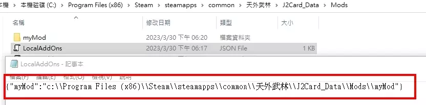 可以修改LocalAddOns.json添加一个本地模组,这里使用【myMod】来展示。