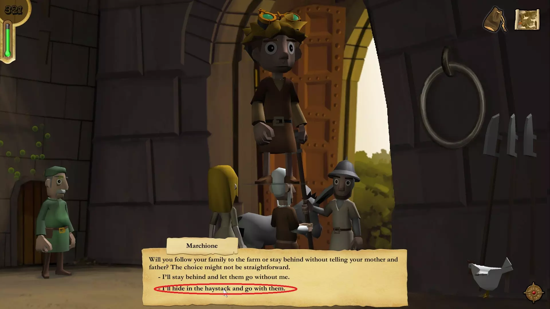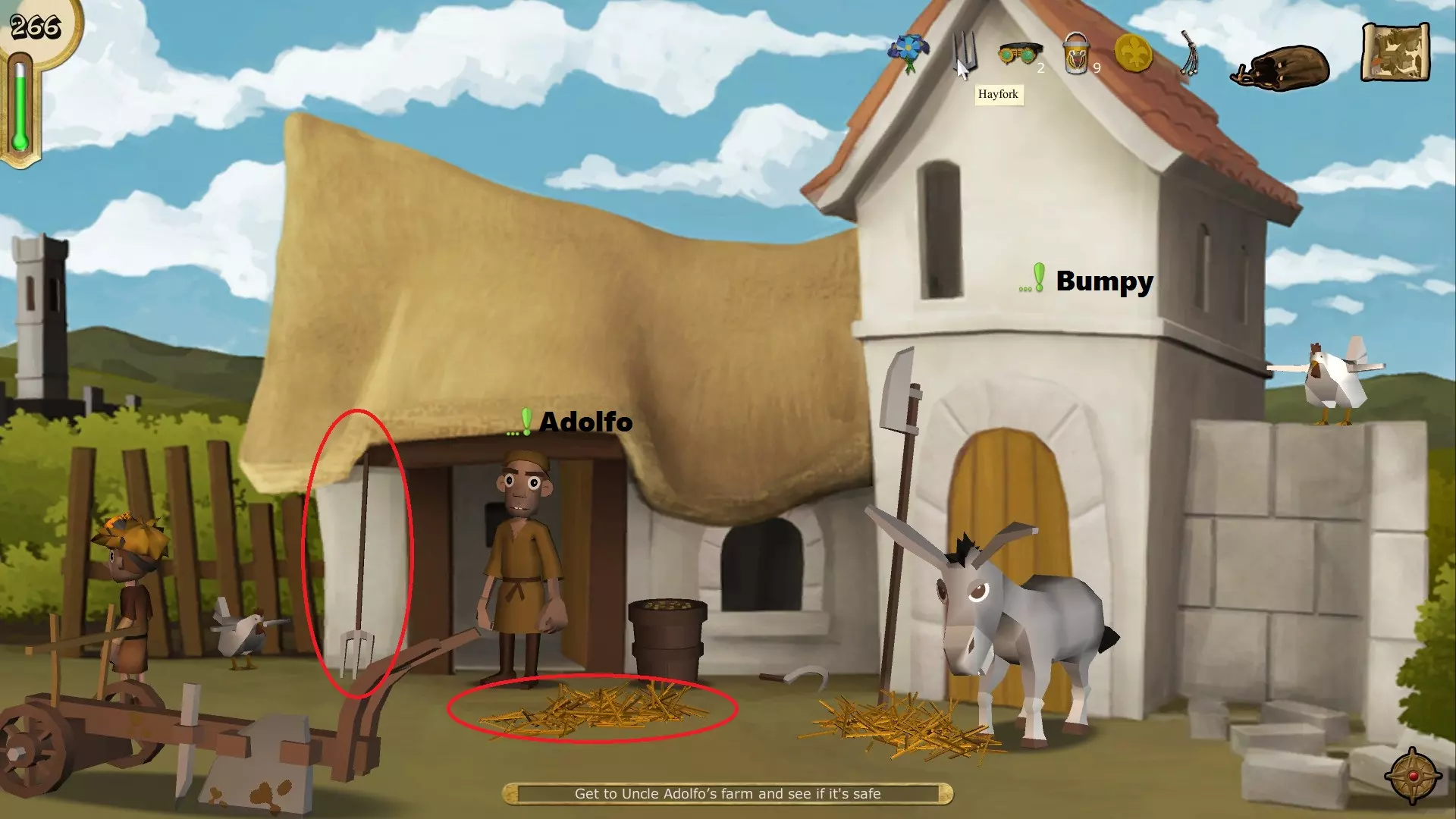 拿起干草叉,用它对着干草使用两次,即可获得干草堆。与阿道夫对话,然后与邦皮对话(现在一切准备就绪,我们出发吧)。玩最后一个迷你游戏,然后进入你的家,最后一次与你的父亲对话。