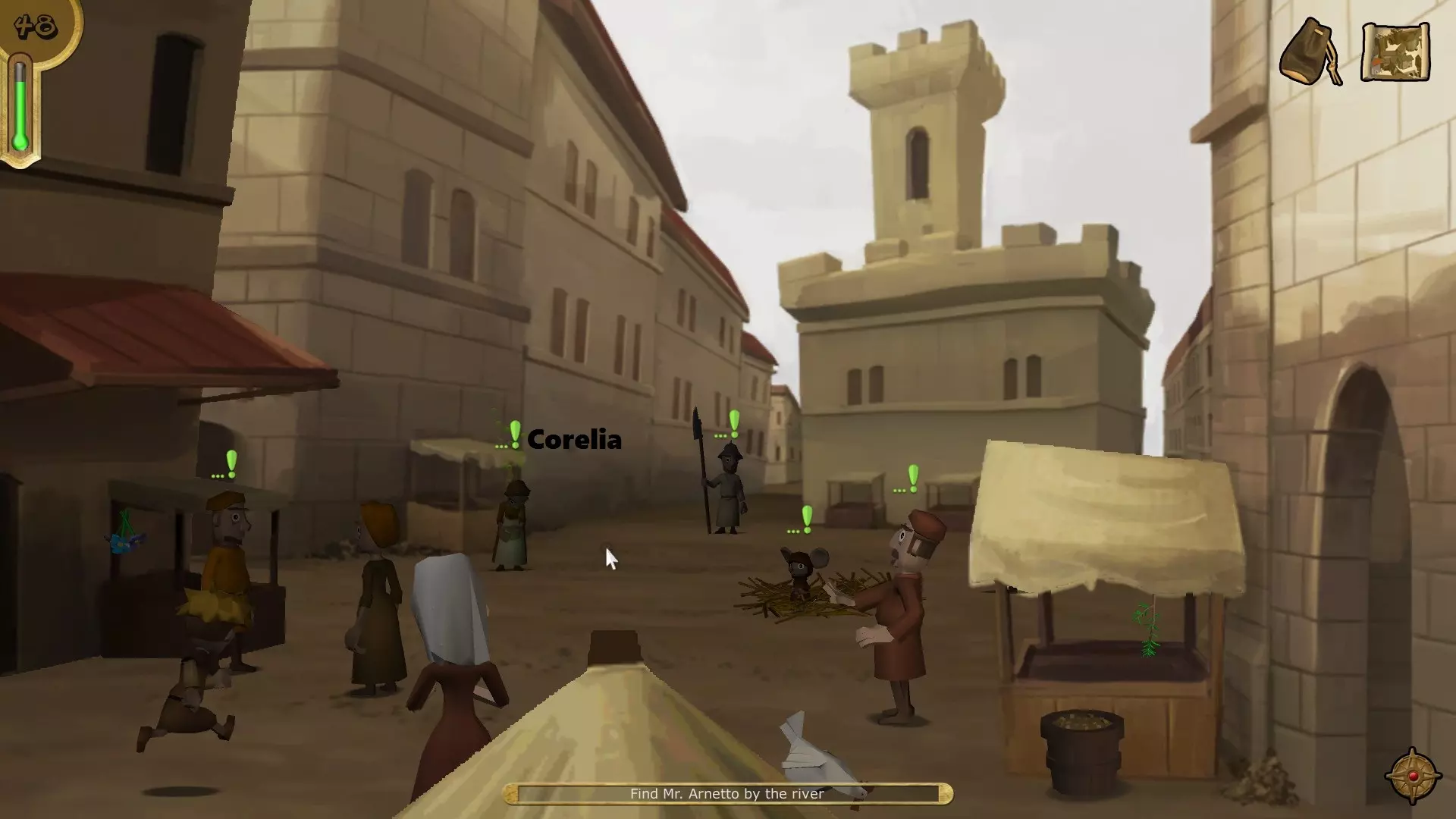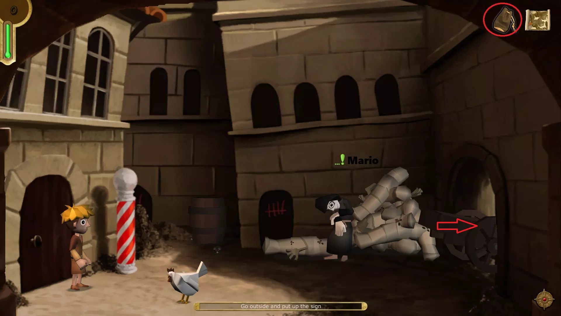 打开你的物品栏,将老鼠药对老鼠使用。 成就解锁 - Rats! 然后将护目镜对自己和米尔斯沃思博士使用。 成就解锁 - Epidemica 注意 - 米尔斯沃思博士就是瘟疫医生。截图中没有显示他,但他的位置仍有标记。 微型杀手与瘟疫净化 回到你家外面的庭院,和马里奥对话(我能帮忙吗?/我会帮你)以开启另一个小游戏。然后返回市场。