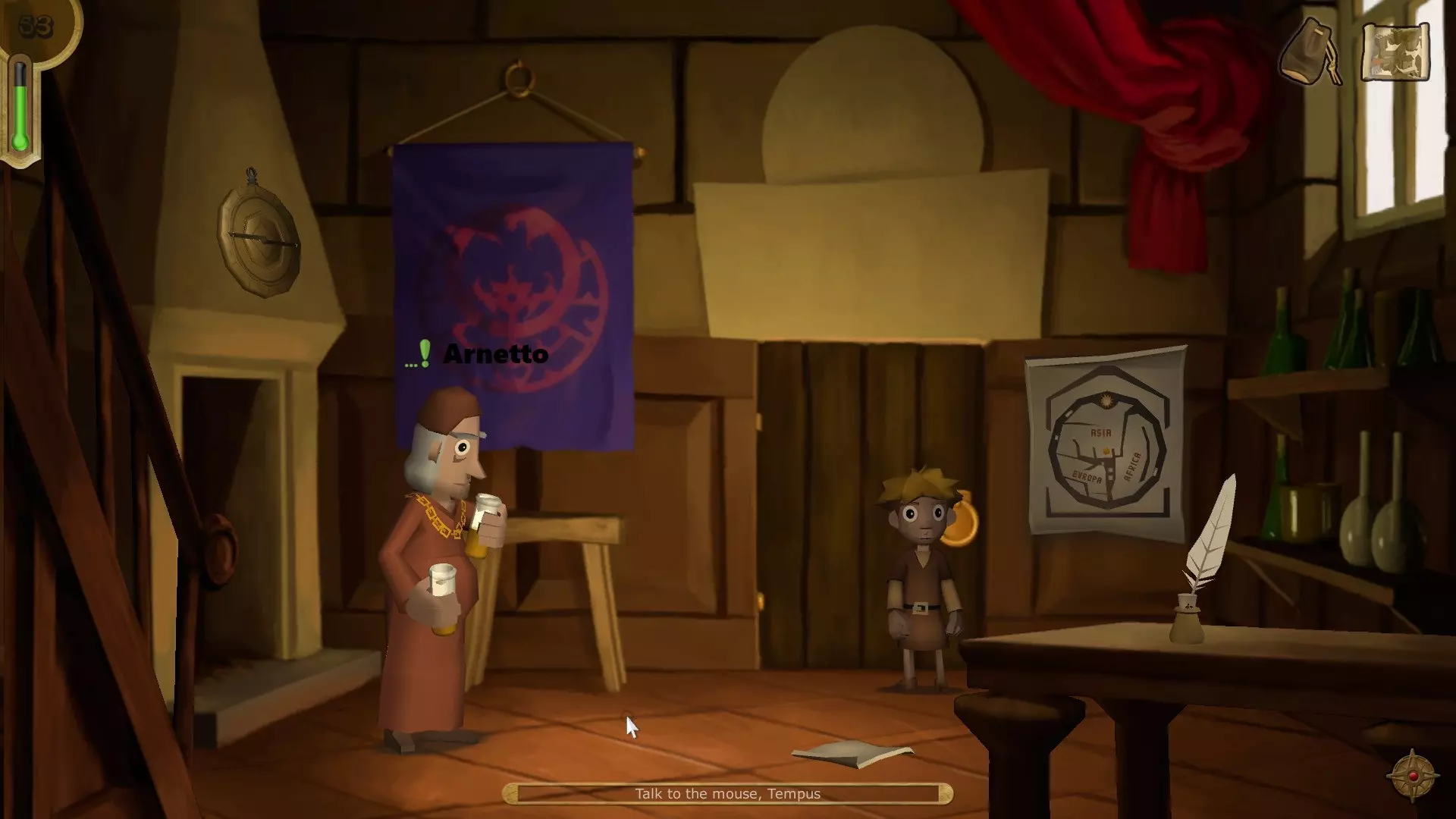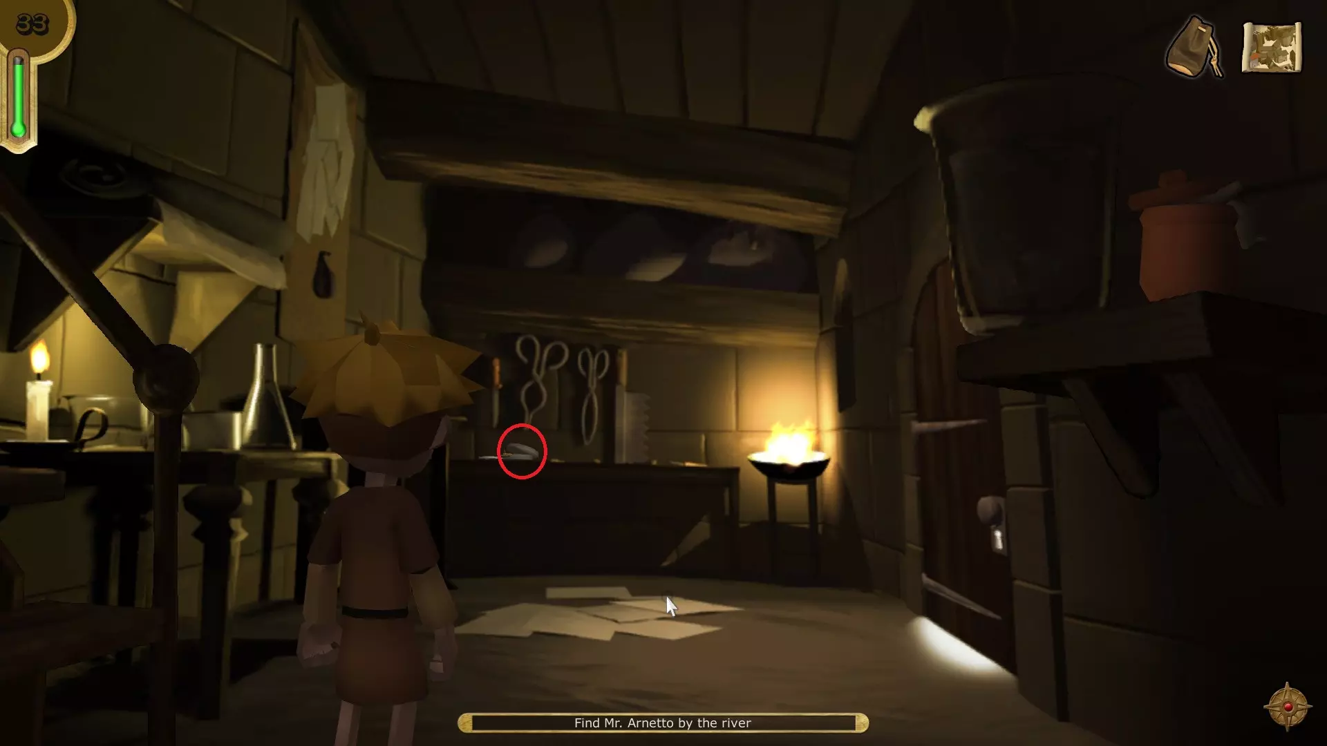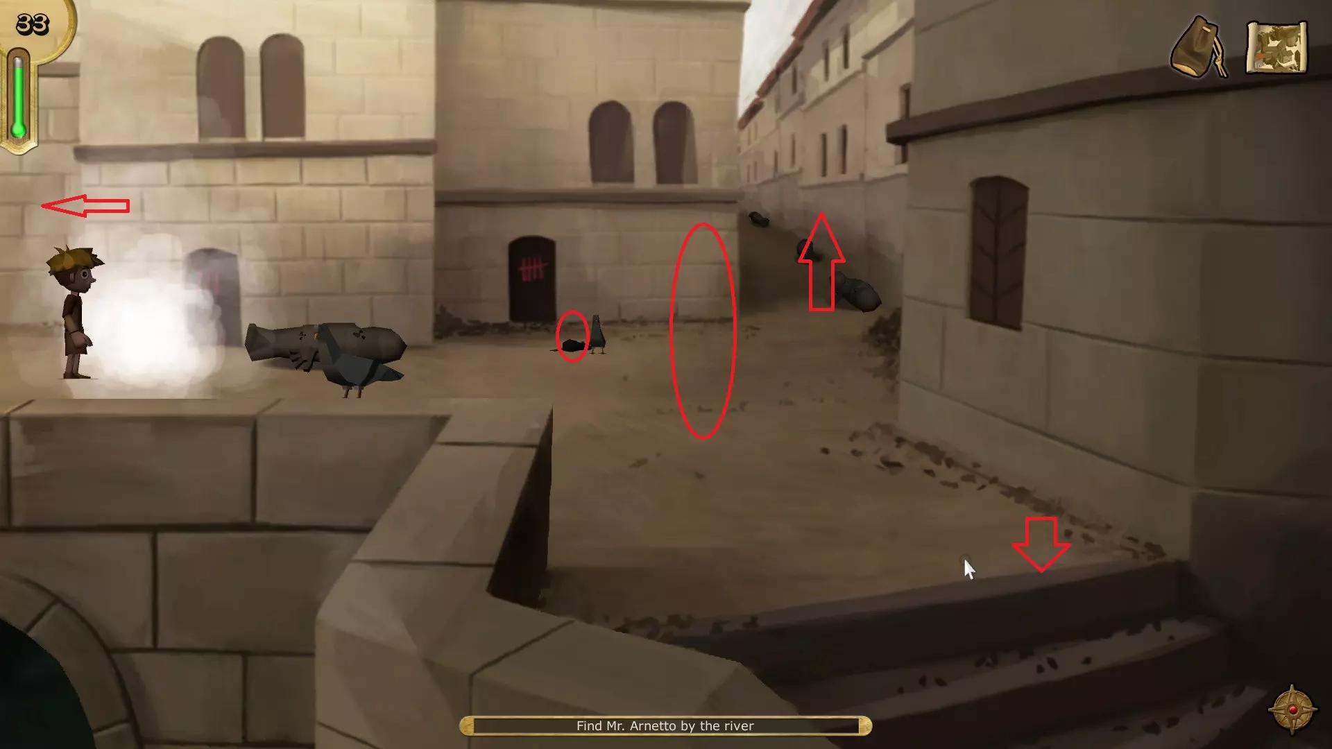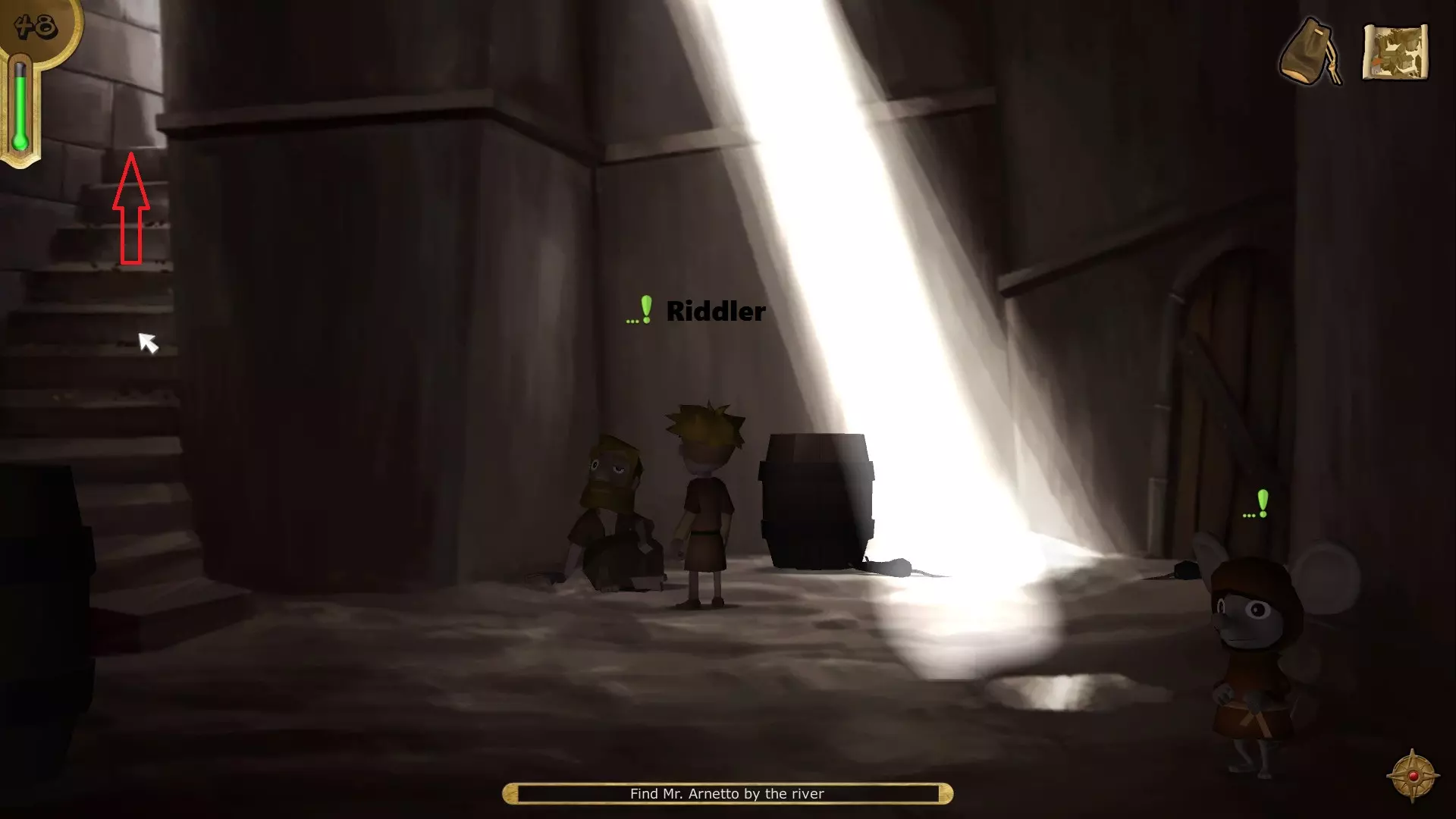 和阿内托交谈,然后前往室外。与老鼠坦普斯对话以获得护目镜,之后重新进入阿内托的房间。