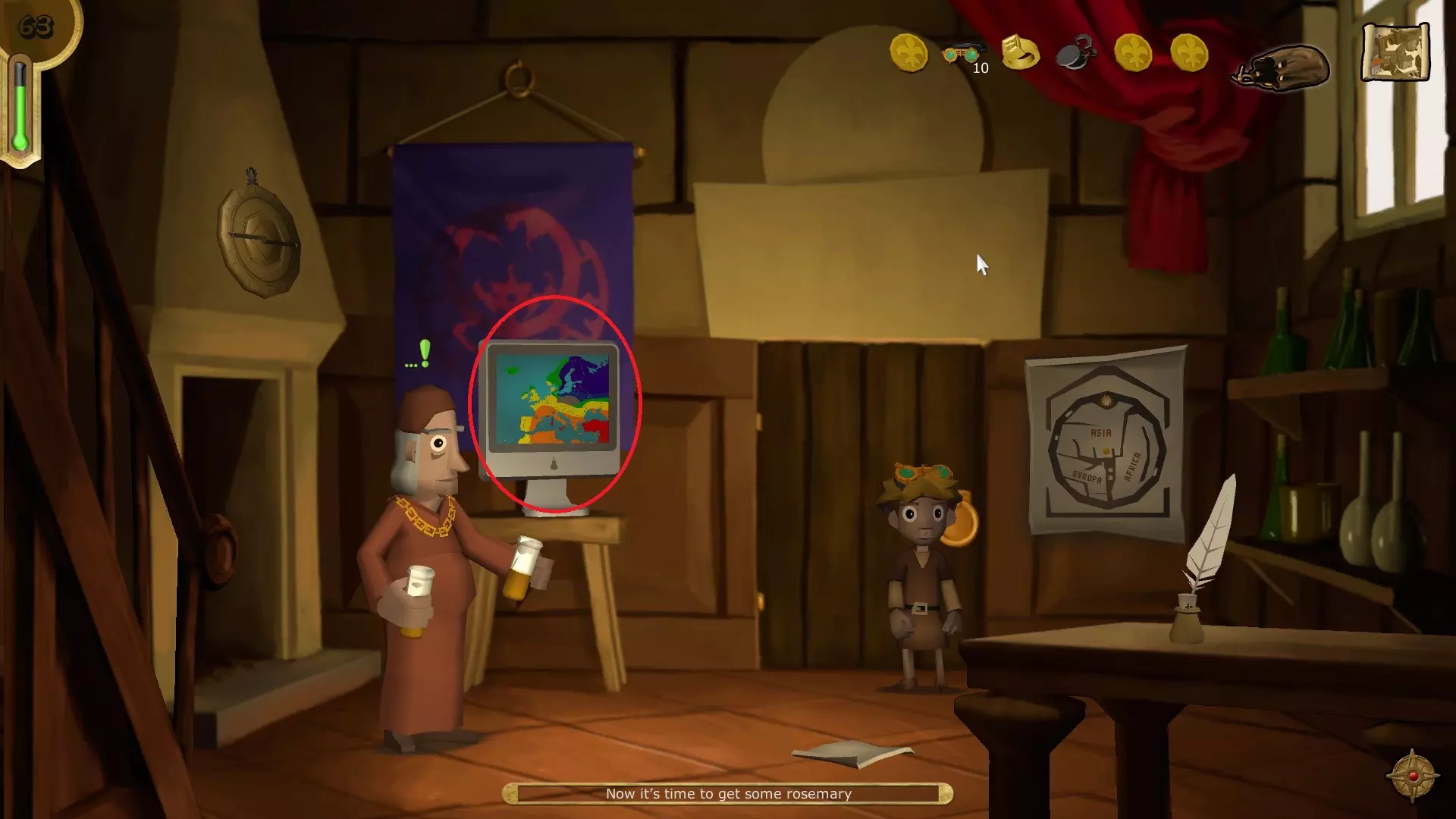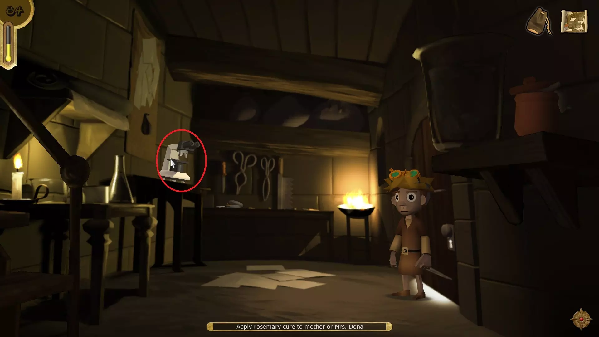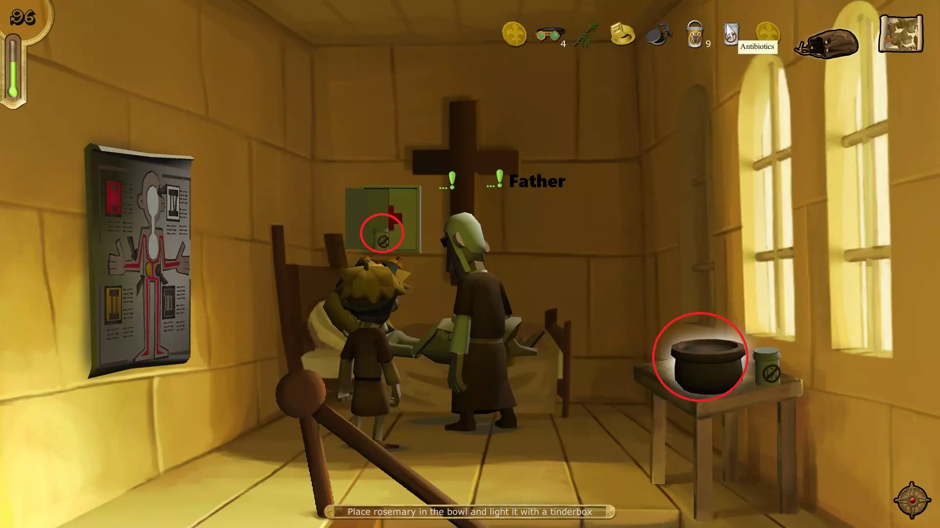 打开你的物品栏,将护目镜和抗生素使用在自己身上,然后使用抗生素为自己治疗。 成就解锁 - Plage purging 死亡观测者 与父亲交谈,将迷迭香放入碗中,再用火柴盒点燃碗。与父亲交谈后下楼,再次与他交谈。现在返回市集。
