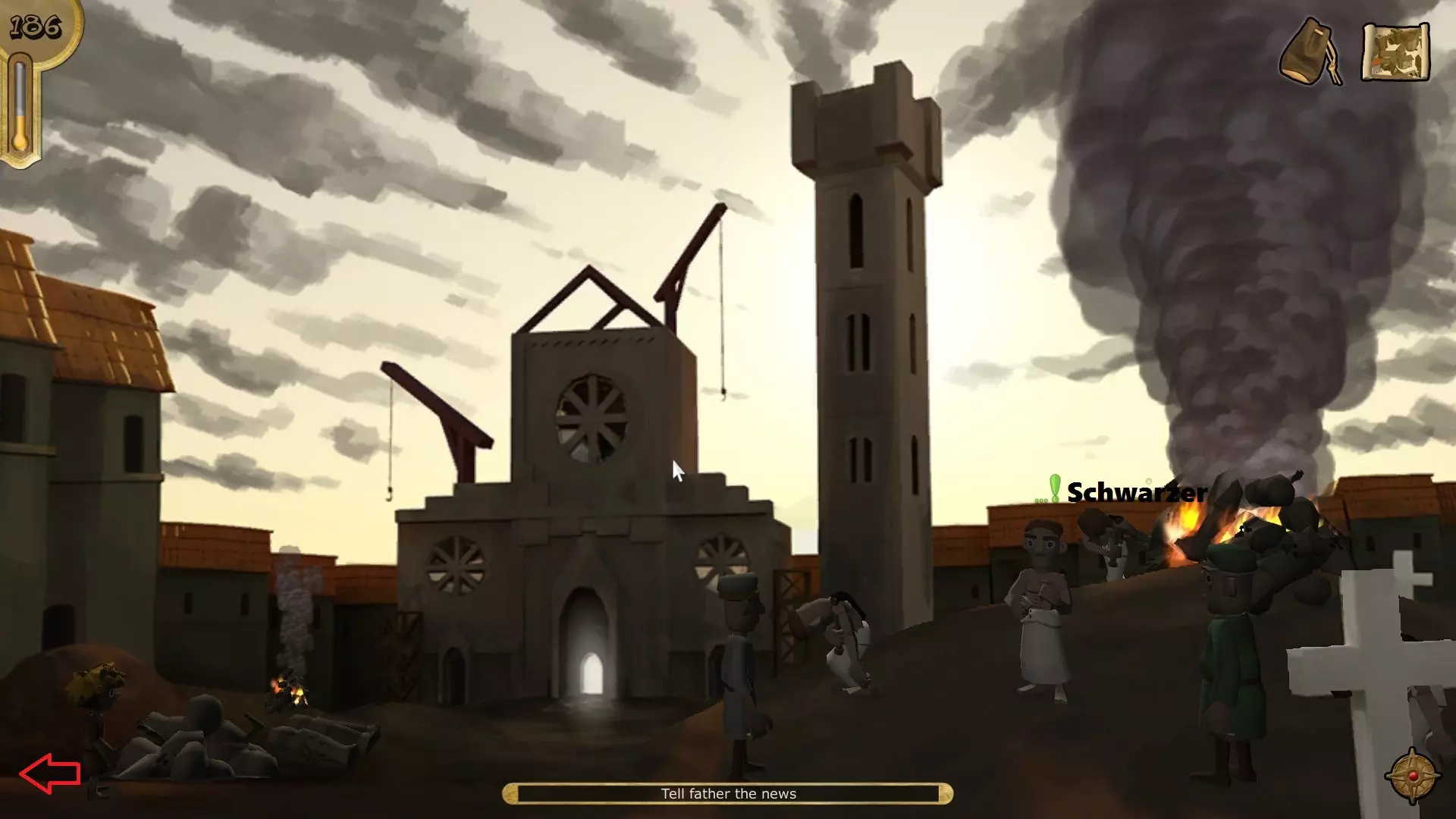 打开你的物品栏,选择标识并将其放置在门上。回到屋内,与你的父亲对话,然后再次出门。与马里奥交谈(询问“你知道关于这种疾病的任何事情吗?”)。 成就解锁 - Spotting the Plague 这是可怕的时代。