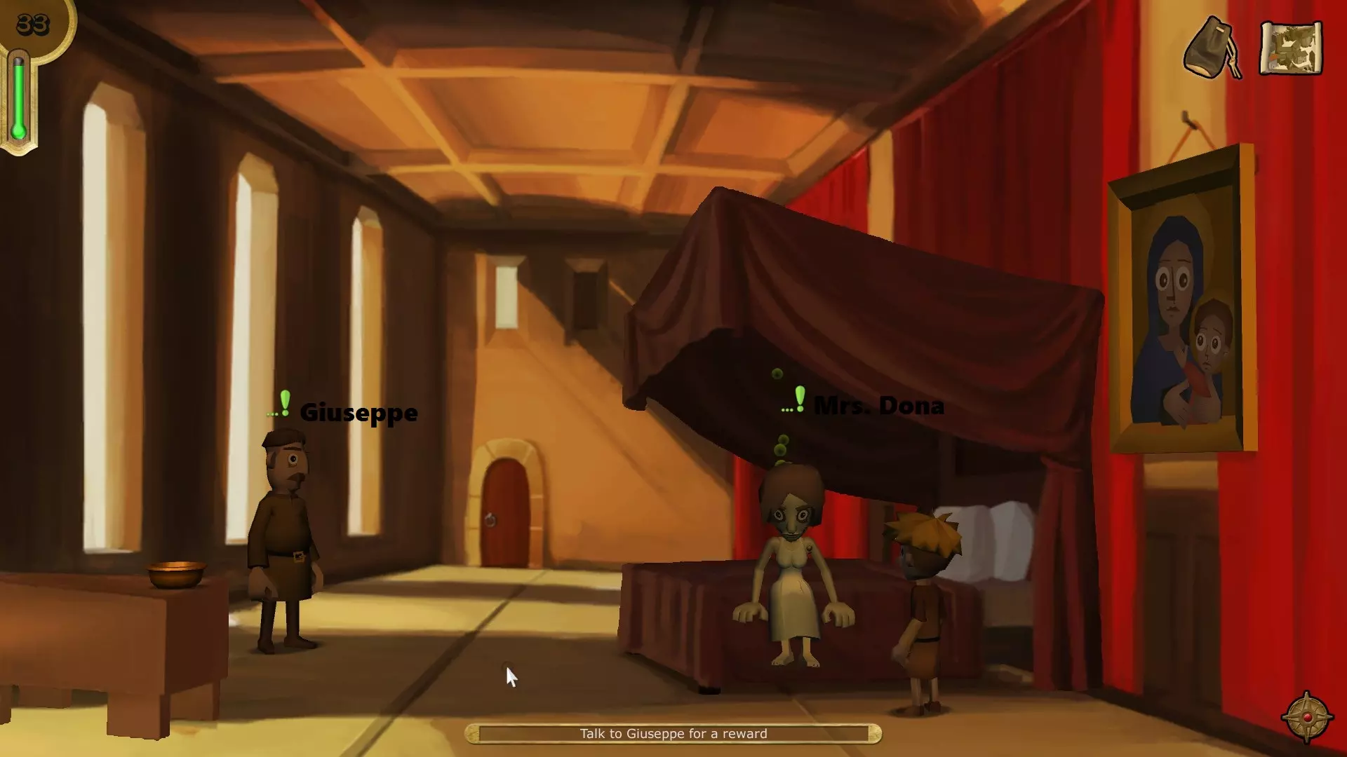 在朱塞佩家与多纳夫人交谈并完成迷你游戏。与朱塞佩对话,然后与父亲交谈。离开家与庭院,向南走下台阶。