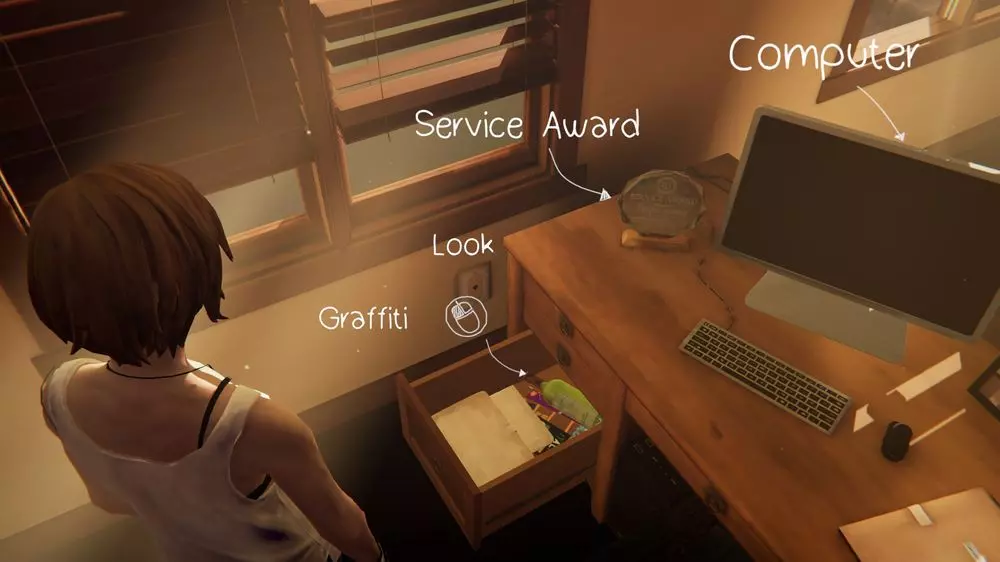 涂鸦9 - 安珀先生的办公室 需要在瑞秋父亲的办公桌上进行涂鸦。首先打开左侧抽屉,查看里面找到的物品,然后进行涂鸦。