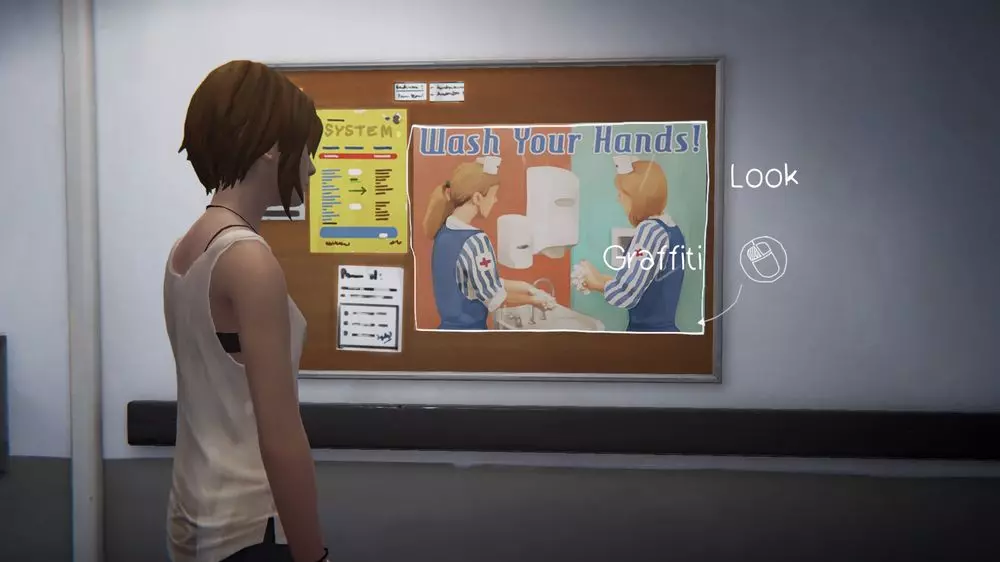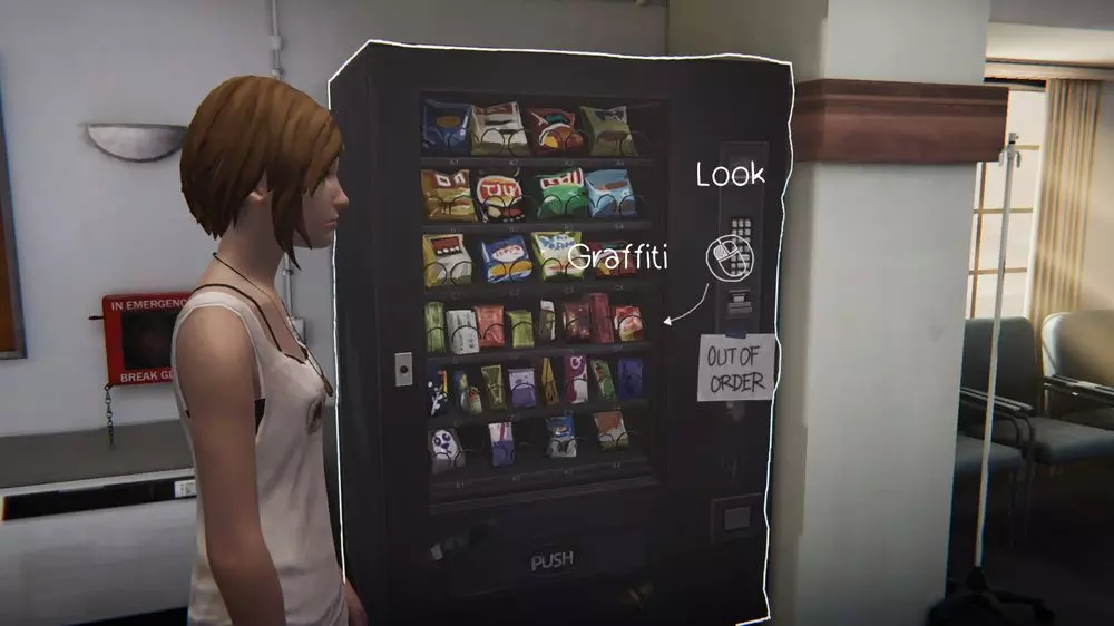 涂鸦6 - 医院 需要在零食自动售货机上涂鸦。首先观看电梯旁的过场动画,然后走向自动售货机并敲击3次,当面包掉出来且佐伊吃掉后,再次查看自动售货机并进行涂鸦。