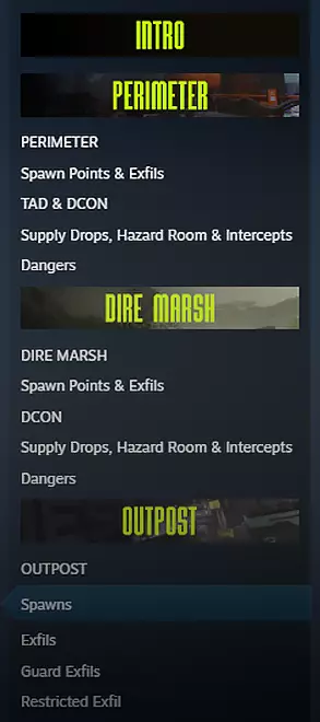 以下是一些可能对你有用的兴趣点。这些地点会改变你的玩法,所以在降落前查看布局是个好主意。 了解一个区域内预计的队伍和玩家数量,是活下去并带着战利品离开的最佳方法。 导航 快速跳转:• 外围 • 绝望沼泽 • 前哨站 使用目录导航至兴趣点。