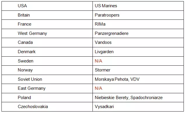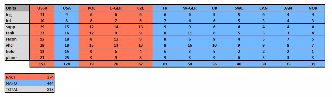 第一个阵营是北约。北约即北大西洋公约组织的缩写。在现实世界中,北约是西方大国于1949年成立的联盟,旨在形成统一战线以对抗苏联的扩张。在游戏中,他们是蓝方阵营。部分玩家也称他们为“盟军”,也有人称其为西方势力。北约包含八个国家:美国、法国、英国、西德、加拿大、瑞典、挪威和丹麦。 通常来说,北约部队的坦克性能相对较弱,但拥有更精锐的步兵、更强大的空中力量,最重要的是,其单位多样性要高得多。这些并非绝对的硬性规则,而是你可以记住的一般性经验法则。说真的,只有美国、法国、英国,或许还有西德和瑞典适合作为国家卡组——其他国家(即“北约小国”)最好在多国卡组中使用,这样你可以选用它们最有价值的单位,同时又不用继承它们的缺点。