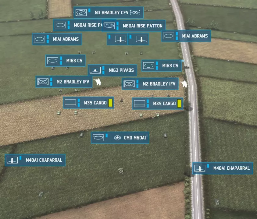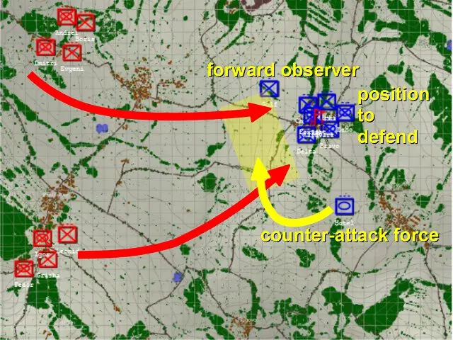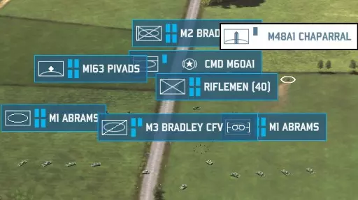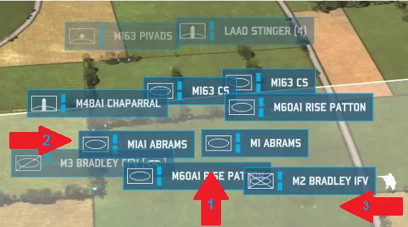 当你选择任何后勤单位(后勤卡车、直升机或前方作战基地)时,你看到的将是这个界面而非单位的武器界面。看到那里显示的“开启”了吗?点击它,就能禁用该卡车在特定类别上的补给能力。顺便说一下,这也适用于友军单位使用你的补给——如果你的队友是个喜欢狂轰滥炸的“傻子”,你可以让你的前方作战基地停止补充弹药,以防止他耗尽前线所需的所有补给。 补给车辆还有一个独特之处,那就是后勤单位可能会被敌人俘获。任何没有护卫的补给车辆或前方作战基地,如果敌方单位在没有友军单位附近的情况下进入其几百米范围内,就会被敌方俘获。要注意这一点,如果你看到敌方补给卡车在开阔地带,可以派一支部队过去夺取它们。用敌人纳税人的钱买来的口粮吃起来格外香甜。不过要注意,如果你的补给车辆在没有护卫的情况下被抓住,它们也可能被敌方缴获。没有什么比花钱修理敌人的车辆,结果让他们用这些车继续向你射击更糟糕的了。哦,正因为如此,你的部队在没有命令的情况下永远不会向敌方后勤车辆开火——如果你打算缴获它们,这没问题,但如果不打算缴获,而且你的部队没有其他战斗任务,那你就必须明确命令他们射击敌方补给车辆。 “那么,指南,”你像新手一样问道,“空的后勤车辆该怎么处理?”首先,后勤车辆可以通过前线作战基地(FOB)进行补给。不过,如果你需要用前线作战基地来支援炮兵,或者它们已经空了,那后勤车辆就派不上什么大用场了。有些人喜欢让后勤车辆沿着公路进入未侦察的城镇,看它们是否会被捕获(从而暴露隐藏敌军的存在)……但你不会在没有先用侦察单位侦察的情况下就贸然进入某个区域,对吧? 基础战术:纵深防御与反攻 我们之前已经学习了如何建立静态防御,但也了解到即使在不理想的情况下,静态防御也可能被突破。静态防御确实存在一个缺点,那就是它是固定不动的——这意味着当敌人知道它们的位置后,很可能会派遣空袭或炮兵来攻击。那么,当敌人向你的静态防御阵地推进时,你该怎么办呢? 答案就是纵深防御,也被称为动态防御。与静态防御的目标是“坚守防线”、在自身不后退的情况下阻止敌人前进不同,动态防御会随着敌人的推进而移动,始终对敌人发动攻击,但不会停留太久以至于被击溃。虽然我之后会更详细地讲解稳定器,但现在你需要知道,稳定器能让坦克及其他类似单位在移动中精准射击,对于构建完善的动态防御而言绝对是必不可少的。同样必要的还有倒车指令。你必须恰当地运用它来实施动态防御,这并非可有可无的操作。 动态防御最基本的形式,就是让你的坦克在开阔地带倒车移动,这样它们就能持续向敌方目标开火,同时不让敌人拉近与你的距离。这意味着敌人难以快速突破你的防线并包围你的部队。这能延长你的单位对敌方单位的射击时间,从而造成更多的敌方伤亡。它能减缓敌人的攻势,为你争取时间调遣援军或请求盟军支援。这能迫使战斗按你的节奏进行,由你决定如何引导敌人,让战斗发生在你的防空导弹覆盖范围内,而非敌人的区域。 然而,动态防御并非简单的“坦克倒车”。我们已经讨论过倒车操作。轻型车辆在动态防御中也发挥着作用。以反坦克导弹卡车为例——它们的最佳作战方式是向敌方装甲单位发射一两枚导弹后,迅速撤离至射程外再次开火。这被称为打了就跑战术,轻型车辆在这方面表现出色。此外,武装直升机在动态防御中真正大放异彩,它们能围绕目标快速机动,使用火箭巢、机炮和反坦克导弹,将装甲矛头变成一支惊慌失措、燃烧殆尽的残兵。步兵的机动性不足以进行动态防御,但他们也有自己的作用。 纵深防御还意味着在前线后方分散部署防御单位——这能非常有效地延缓装甲突破。大多数新手玩家面临的问题是,一旦你成功突破他们的防御前线,在你和他们整个地图区域之间几乎就毫无阻挡了。即使你所做的只是在你的防区部署一些廉价的侦察单位、便携式防空导弹或其他防空武器以及步兵,这仍然能让你时刻掌握目标动态,并阻止敌人毫无阻碍地一路长驱直入到你的起始区域。纵深防御和静态防御之间存在明显的权衡——任何在防御区域闲置的单位,都是未部署在静态防御线上的单位。与所有事情一样,你必须在两者之间找到平衡,而这种平衡在很大程度上取决于你的个人游戏风格以及地图和对手的战术需求。 你通过倒车操作让坦克得以存活,前线也保持了一定程度的完整,而敌人的重型装甲为了追击你的装甲部队,已经脱离了支援单位,导致兵力变得分散。但你究竟该如何扭转战局呢?答案就是发动反击。反击是指你发起的进攻性推进,旨在摧毁敌人的攻势,或至少迫使敌人撤退。这与进攻敌方领土不同,不过,如果敌人的阵脚已被彻底打乱,一次精心策划的反击是有可能演变为对敌方领土的进攻的。可以参考以下示例: