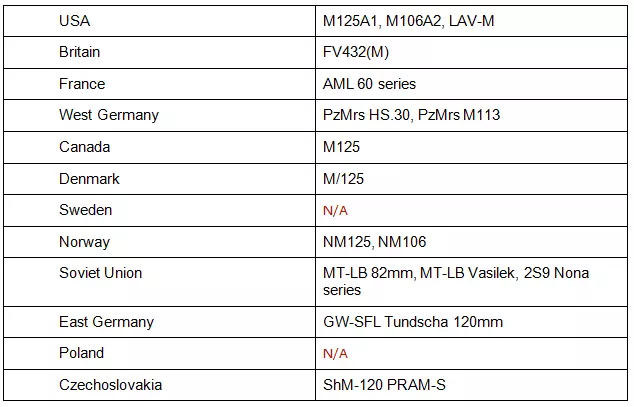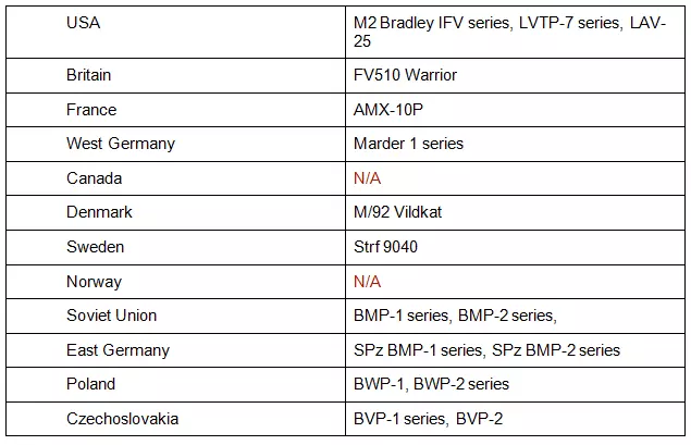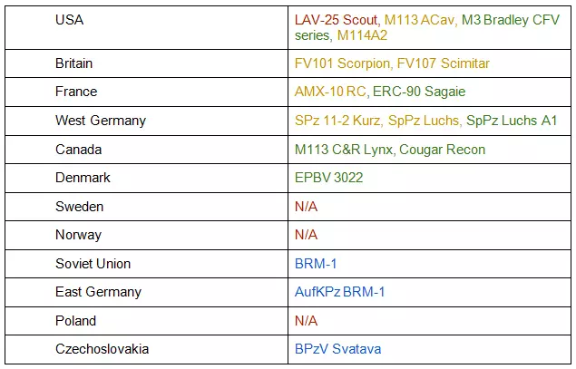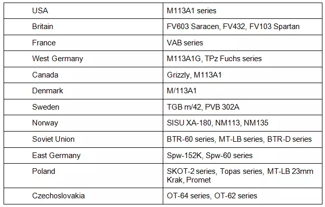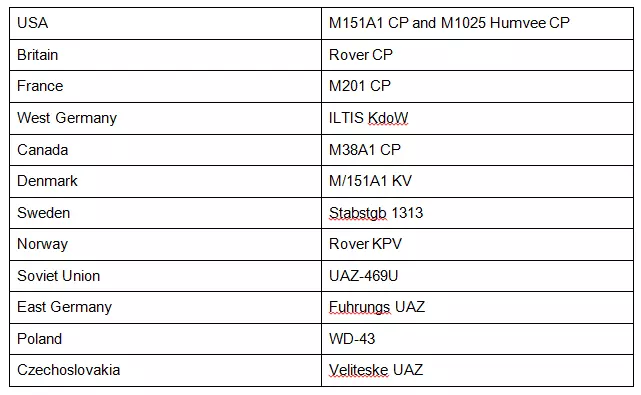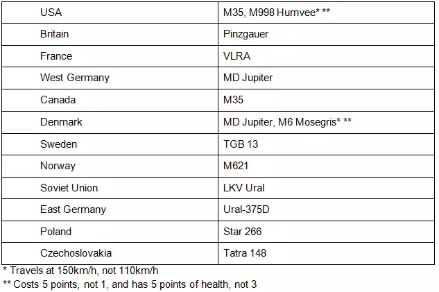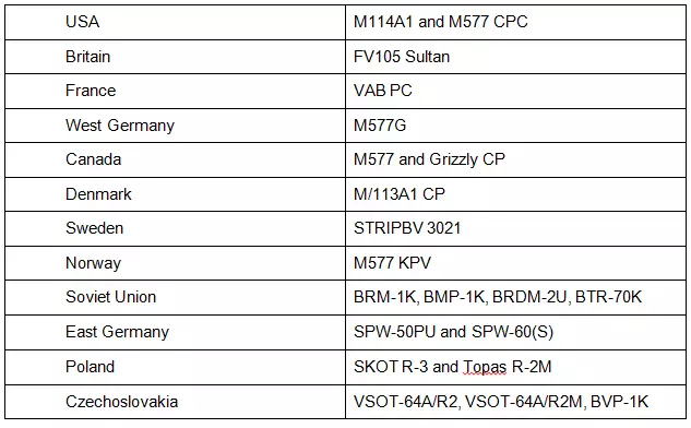 指挥装甲运兵车和指挥步兵战车是比坦克更轻的装甲指挥车辆。每个国家至少拥有一种。虽然装甲运兵车和步兵战车之间存在差异,但对于指挥车辆而言,这些差异有些随意且模糊。总体来说,步兵战车比装甲运兵车的武器和装甲更优,但价格也更高。它们通常装甲较轻,为1到2点,成本在120到160点之间。尽管拥有轻型装甲,但只要受到任何针对性攻击,它们仍会被摧毁。该类别中一个特殊的例子是苏联的BRM-1K,它是唯一配备卓越光学设备的指挥车辆。它们的特点如下: