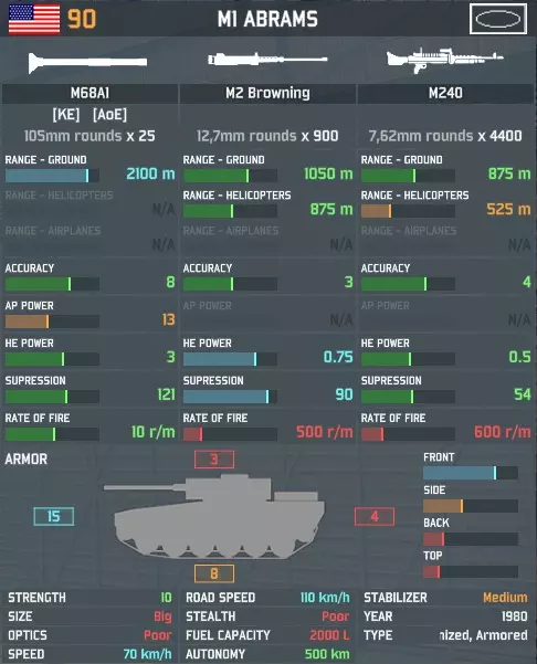 面板顶部显示单位的国籍、指挥点成本、名称和单位标志。仅从顶部面板,我们就能知道艾布拉姆斯是一款中高端的美国坦克。 标题栏下方是该单位的一到三种武器。每种武器都有图标和名称,以及其标签和口径。 在上图中,你可以看到M68A1火炮上的【动能】和【范围伤害】标签。标签表示特殊武器效果、限制或用途。并非所有武器都有标签,你可以将鼠标悬停在它们上方以显示其作用。让我们了解一下游戏中的标签: 【范围伤害】 区域效果——该武器发射杀伤人员的爆炸弹药。其高爆值在一定区域内生效。[CQC] 表示一种可用于近距离战斗和移动中使用的步兵机枪,不同于大多数带有[STAT]标签的步兵机枪。 [CORR] 校射炮击 - 该武器可对障碍物上方进行间接火力打击。若友方单位与目标有直接视线,可能会提高精度。只有炮兵单位拥有此标签。 [F&F] 发射后不管 - 导弹发射后,无需操作员进行更多操作。注意所有火炮和无制导炮弹均为发射后不管,因此此标签仅适用于导弹。与[GUID]相反。 [GUID] 制导 - 该导弹为制导导弹。操作员需要保持静止并瞄准目标直至命中。与[F&F]相反。【HEAT】 高爆反坦克弹 - 该武器发射反装甲化学弹药。其穿甲值(AP)不随与目标的距离变化而改变,这与【KE】相反。 【NPLM】 凝固汽油弹 - 该武器使用凝固汽油。它可能在树林或建筑物中引发火灾,同时也是一种恐怖武器,会对作用范围内目标的士气产生影响。请注意,此标签适用于所有燃烧武器,即使它们在现实中并非严格基于凝固汽油。 【KE】 动能弹 - 该武器发射反装甲动能弹药。距离目标越近,其穿甲值(AP)就越高。这一点非常重要:带有【KE】标签的武器,包括大多数机关炮和坦克炮,在近距离对目标造成的伤害会显著提高。这意味着即便是威力很弱的枪械在狭窄空间内也能造成可观的伤害。 [RAD] 雷达 - 该武器采用雷达制导,因此容易受到反雷达导弹的攻击。关闭武器即可规避此威胁。 [SA] 半主动 - 此类导弹具备制导能力且可在移动中发射。操作员需持续瞄准目标直至命中。这算是介于【GUID】和【F&F】标签之间的一种制导方式。 [SEAD] 压制敌方防空 - 这种反辐射导弹会锁定敌方雷达,只要雷达持续工作,导弹就会对其进行制导追踪。这类武器通常会自动攻击它们发现的首个雷达目标。 [SMK] 烟雾 - 该武器发射烟雾弹。烟雾屏障不会造成任何伤害,但会阻挡所有地面单位的视线。只有炮兵单位拥有此能力。【状态】 固定 - 该武器无法在移动中开火。 单位:单位信息面板II 所有武器均有口径。了解这一点很有用,因为通常来说,口径越大,射程越远,伤害越高。口径还能显示雷达武器。 在其下方是各武器在八个类别中的性能评级。我们以M1艾布拉姆斯主战坦克的主炮为例: