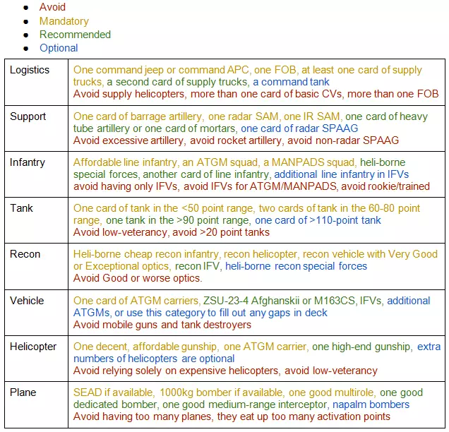 不要忽视那一级的 veterancy(老练度)提升。如果你愿意接受兵种限制,它们会是提升作战部队效能的好方法。遗憾的是,这种限制有时很难应对;除了大国之外,大多数这类提升对于国家限定的卡组来说根本不实用。不过好在混合国家卡组在一定程度上可以克服这个问题,你可以自己尝试一下。 不过,我发现大多数这类提升都不值得让你放弃其他单位的多样性和选择空间。我确实有几个国家装甲卡组,而且海军陆战队和机械化卡组也受到一些人的喜爱。但空降卡组似乎完全没用,它好像主要在战役模式中才有用。最后一类加成是年份限制,也被称为类别限制。类别A为默认设置,允许使用游戏中的任何单位。此外还有类别B和类别C卡组。类别B限制使用1980年后建造的任何单位,但每张卡片的可用数量会获得40%的加成。类别C则更进一步,限制使用1975年后的单位,但每张卡片的可用数量会获得高达80%的加成! 显然,这需要改变战术和策略。受类别限制的卡组,尤其是类别C,不允许使用现代化的高科技单位。但你会获得大量低端单位作为补偿!因此,它们在“人海卡组”中很受欢迎,但这并非这些卡组唯一可行的策略。所以,如果你实在想尝试,建议在熟悉这类玩法后再行动,但其实真的不值得费这个劲。哦,还有,如果你的队友中已经有人明显使用“支援卡组”,那就别再尝试了,否则你们队伍的战斗力会严重受损。 另外,为了方便大家,我会附上一份通用卡组构建的基础指南。请注意,这只是一份帮助你入门的基础指南,并非所有卡组都必须遵循的绝对准则。就连我自己的卡组也并非全都符合这些内容。但对于你构建第一副非主题、非年份限制的卡组来说,这是一份实用的入门基础指南。我会用颜色代码来标注推荐内容:B类仍能为你提供大量优秀的中等水平单位,甚至还包括一些重型单位的基础型号,比如M1艾布拉姆斯主战坦克(基础型)和AMX-32主战坦克。不过40%的可用数量加成通常足以让所有单位至少提升一级 veterancy(老练度),且不会损失数量。 C类则更进一步,虽然仅允许使用较老旧的单位,但提供了大幅的可用数量加成。即便是通常每张卡牌只能携带一个的单位,例如部分 aircraft( aircraft)和FOB(前沿作战基地),在C类中也能每张卡牌携带两个。C类允许你同时选择高 veterancy(老练度)和高可用数量,在卡组构筑时不要忽视这个选项!实际上,你几乎需要将所有单位至少提升一个等级,才能保持足够数量的可用单位;在C类卡组中,最低等级时完全可能拥有超过300个坦克或步兵单位,但当然,如果它们陷入恐慌,在战斗中就会被消灭。但这正是B/C类卡组的真正优势所在——你可以拥有数量足够多且等级较高的部队,这些部队通常价格低廉,足以压制对手。需要记住的一点是,C类卡组几乎从不包含原型单位,因此将它们与国家限制加成混合使用很少有价值。 当然,这些加成也可以混合搭配以产生叠加效果。如果你愿意,你可以组建一支仅包含苏军的C类装甲卡组,用中阶的T-55和一波波的T-72来压制对手。想象一下吧! 卡组构建:注意事项 当然,虽然你可以随心所欲地组建卡组,但这并不意味着不存在错误的构建方式。我不会过多重复基础内容,但如果你正在考虑组建任何通用卡组,可以问问自己以下几个问题: 这个卡组的单位数量是否适合它将要参与的游戏类型? 这个卡组是否有足够的后勤保障来维持整场游戏? 这个卡组需要前线作战基地(FOB),还是使用每张卡牌能提供更多补给的后勤卡车会更好? 我的部队类型是否足够多样化?在我要玩的游戏模式中,我真的能负担得起我的部队吗? 我有足够的侦察单位吗? 上面这个问题是个陷阱。如果你没明白,那可太不应该了。 我的卡组中绝对不能损失的单位是什么?如果这些单位被摧毁了我该怎么办?(“恐慌”可不是个合格的答案。) 我还想聊聊所谓的“支援卡组”。支援卡组指的是你想出一个“绝妙的”“完全原创的”“前所未有的”主意,组建一个专门专注于空中力量和炮兵的卡组,为友方队伍提供专门的火力支援。这类卡组通常是个非常糟糕的主意。在我玩的每一场10v10对战中,总会有那么一个“天才”新手,带着所谓的“支援卡组”,在目标开始密集使用防空系统(IADS)战术时,不到十分钟就把自己的飞机全打光了,然后因为无事可做就 ragequit,让队友大失所望。这种情况如此常见的原因很简单——空袭是《战争游戏:空地一体战》中最能带来即时满足感的部分之一;空中力量迅速飞抵,炸毁目标,然后撤离。还有什么比这更爽的呢?抱歉要打破这个幻想,但每个新的战争游戏玩家很快都会想到这个主意,结果他们最终都没能给团队提供任何帮助。 然而,支援卡组也颇具争议,因为事实上存在正确的支援卡组玩法。但要玩好支援卡组,比玩常规卡组更难。是的,我就是坚持要把所有事情的乐趣都榨干。为了内容的全面性,我会讨论如何正确使用支援卡组,但我真的建议大家“正常”玩游戏,不要在自己尝试这种玩法时拖累队友。 首先要说明的是,这真的只在10v10模式中可行。即便是在4v4模式里,如果你让整条战线无人防守,队友也会对你感到不满。话虽如此,你的卡组里不能只有火炮和飞机。我的10v10支援卡组(没错,我也有这种卡组,而且我不怕承认)包括: ●大量补给卡车,用于为友军部队补给(新手往往会忽略这一点,因为它不会带来分数) ●高端重型坦克(10v10