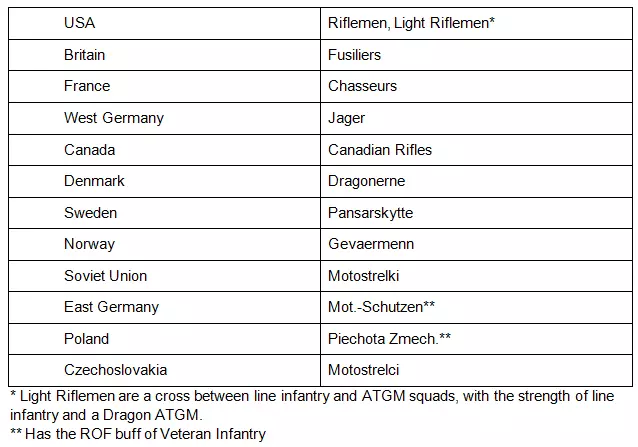 最后是前沿作战基地。所有国家的前沿作战基地属性相同,每个造价100点,每张卡牌包含1个(C类卡组中每张卡牌包含2个),可提供10000升补给。它们是成本效益最高的补给来源,但并非卡牌效益最高的补给来源,每张卡组卡牌仅能提供10000升补给。卡牌效益的计算方式为:每张卡牌包含的载具数量乘以单个载具的补给容量。前沿作战基地的特殊之处在于,它们必须在对战的部署阶段放置,之后无法再部署。因此,卡组中任何未在初始部队中部署的前沿作战基地都将被浪费。与你的第一辆指挥车一样,你的第一个前沿作战基地会自动放置,并从初始点数池中扣除。前沿作战基地(FOB)可用于为补给车辆补充物资,但通常情况下,它们最适合为炮兵提供补给。前沿作战基地(FOB)的耐用性也值得注意,需要承受相当多的直接火力才能被摧毁。 我倾向于为我的炮兵配备一组前沿作战基地(FOB)卡片,以及两组卡片效率最高的补给卡车卡片。有些人完全放弃前沿作战基地(FOB),只使用卡车,他们更看重卡片效率而非成本效率。我不喜欢补给直升机,它们价格昂贵、脆弱,而且往往会暴露隐蔽单位的位置。 单位:步兵:概述 正如一些士兵会告诉你的那样,一切最终都取决于步兵和他的步枪。尽管步兵徒步时速度慢得几乎没用,且容易受到多种攻击,但他们性价比极高,能承担多种角色,正如之前所讨论的,在建筑物中表现出色,非常隐蔽,在森林中也不会损失速度。他们能够射杀任何无装甲目标,而且几乎都携带某种形式的反坦克火箭或导弹。步兵最适合用于夺取和坚守领土以及在森林中行动,并且拥有多种出色的机动选择。因此,正确使用的话,他们是不可或缺的。不过,区分各种步兵角色确实需要一些知识。 步兵 首先,我们来讨论步兵武器。不同类型的步兵枪械性能各异。所有步兵都配备一把主武器和一把副武器。部分单位还会携带一挺班组机枪作为第三种武器。了解这些武器的运作方式至关重要——它们体现了这些单位的最佳使用方式,以及为何廉价步兵有时能胜过重装步兵。首先要知道,步兵步枪有不同类型的精度,包括静止时的远程精度、移动时的远程精度、在近距离战斗(争夺中的城市区域)静止时的精度以及在近距离战斗中移动时的精度。单位信息面板中显示的精度值是静止远程精度值。这就是为什么一些配备糟糕且精度低的冲锋枪的部队在城市战中突然表现出色的原因。 《战争游戏:空地一体战》中模拟了不同类型的枪械: 突击步枪是大多数步兵的主要武器。这些是像AK-74、M-16、Vz.58等类型的枪械,通常使用5.56毫米或5.45毫米口径弹药。它们就像现实中一样是万能型 firearms,在任何一个类别中都不出类拔萃,但也不缺乏任何功能。无论是静止还是移动状态下,它们都有不错的精度,在近距离战斗中表现可靠,并且具备良好的压制能力。 战斗步枪,例如FAL、G3等,是使用7.62毫米弹药的半自动步枪。它们往往威力大、射程远、静态精度高,但弹药量比突击步枪少,在近距离战斗中的表现也不如突击步枪。虽然在静止时非常精准,但在移动时精度会大幅下降。 卡宾枪和冲锋枪,如CAR-15、AK-74SU,或者像MAT-49这样的冲锋枪,基础精度较低,但在移动时精度损失不大。卡宾枪通常使用突击步枪口径弹药,而冲锋枪则使用9毫米帕拉贝鲁姆弹。它们在近距离战斗中表现出色,但与其他枪械相比,压制能力和杀伤力较弱。 栓动步枪,如MAS 49/56和毛瑟步枪,大多是二战时期的剩余武器,用于装备成本较低的步兵。它们在静止状态下的远程精度出奇地高,但在移动中或近距离战斗中表现糟糕。 以上均为主武器,此外步兵班组还携带三种不同的第三武器槽枪械: 像PKM、SAW、M60、MG3等固定式机枪能为大多数班组提供强大的压制火力,但无法在移动中射击。这些武器能很好地压制并消灭开阔地带的步兵,对无装甲车辆也构成威胁。像MG3轻机枪、RPK轻机枪等近距离机枪是固定机枪的轻量化变种,可在移动中射击并适用于近距离战斗,这使得它们在城市战中表现非常出色。 狙击步枪是远程、高精度的单发武器,能瞬间击杀单个步兵并立即使整个小队陷入恐慌。 其次,要知道步兵配备有运输载具。在为你的卡组选择步兵时,你还必须选择他们乘坐的运输载具,且运输载具的费用会添加到步兵小队的费用中。运输载具的选择非常重要,这取决于你打算如何使用所运输的步兵。步兵运输载具将在单独的章节中讨论。 最后,还需考虑不同类型的步兵。这些类型包括线列步兵、反坦克导弹步兵、便携式防空导弹兵、工兵、重型步兵、特种部队和预备役。此外,还有侦察步兵,但它们将在侦察部分介绍,因为它们位于侦察标签下。不过要知道,它们遵循与其他步兵相同的战斗规则。 单位:步兵:一级步兵 桑迪的选择:猎兵、摩托化步兵、皮奥霍塔·兹梅奇。 线列步兵是你的基础通用步兵部队。它们通常不具备专业性,通常配备突击步枪、某种火箭筒和固定机枪。它们通常适用于所有步兵角色,但并不专精。它们的价格通常为10到15分,以10人小队形式出现。让我们来了解一下游戏中的线列步兵:
