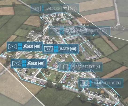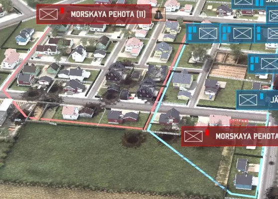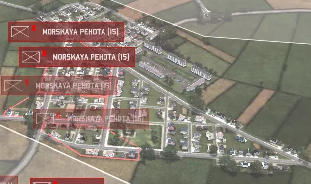 看到城镇某个区域上方的白色小轮廓了吗?那就是一个【区域】。将鼠标悬停在任何城镇上,各个区域就会分别高亮显示。那么,区域有什么重要性呢?区域决定了步兵的占领范围,而非单个建筑。一个区域可以是一栋大型建筑、一个街角,甚至一整个街区。同一时间,一个区域只能被一组步兵(最多4个小队)占领。如果你试图让两组步兵进入同一个区域,第二组步兵就会暴露在开阔地带。暴露在开阔地带的步兵十分脆弱,很容易被消灭。 要占领一个区域,只需将你的步兵移至该区域——他们会自动“吸附”到区域内。你也可以在一个区域内让运输载具卸载步兵,步兵在卸载后会立即占领该区域。被占领的区域会变为蓝色或红色(取决于你是北约还是华约),以此显示该区域由你的步兵控制。