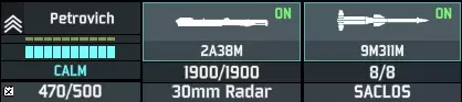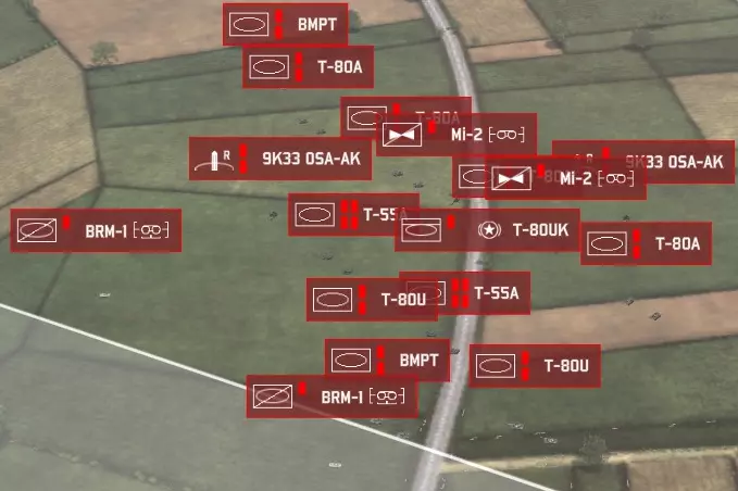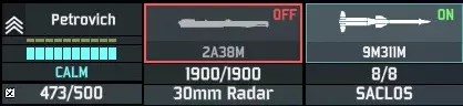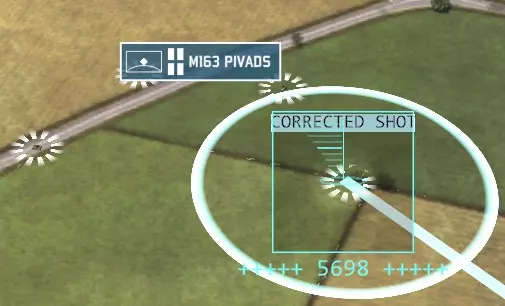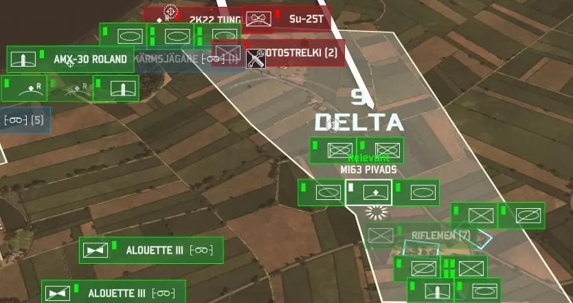 大致思路是,先用防空炮使它们失去行动能力,或者至少让它们把弹药浪费在低价值目标上,然后在它们被击晕时,使用昂贵的雷达地对空导弹将其消灭。除此之外,红外地对空导弹和截击机是对SEAD(防空压制)飞机额外发射导弹的好方法,这类飞机通常因为拥有出色的电子对抗系统而很难被击落。 另外,雷达单位需要微操作以最大限度地提高对SEAD飞机的安全性。雷达武器在HUD(平视显示器)中会有醒目标记。我们以通古斯卡防空单位为例来看看: