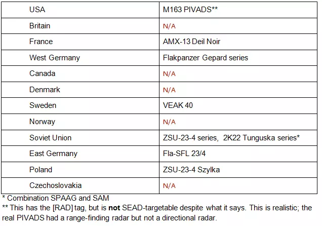 它们是你综合防空系统(IADS)的另一个重要组成部分。如果你缺乏红外制导地对空导弹(IR SAMs),那一定要储备这些武器。但要注意,它们价格昂贵且数量有限,所以要保护好它们并进行妥善的微操作。 桑迪的选择:M163火神防空系统、猎豹自行高射炮、ZSU-34-4系列 自行高射炮(SPAAGs)是搭载防空机关炮的车辆。配备雷达制导的自行高射炮在性能上优于无雷达制导的型号。它们通常更擅长击落直升机而非喷气式飞机,但也能对喷气式飞机发起攻击,至少能使其晕眩或惊慌失措,从而让它们成为地对空导弹(SAMs)的活靶子。因此,最好将它们部署在前线,而地对空导弹发射装置部署在更靠后的位置,这样它们就能最轻松地打击目标。