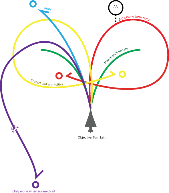 你可以通过此面板快速选择当前战场上的飞机(“任务中”)。带有彩色图标的飞机已准备就绪可供使用。正在补给的飞机会显示1到5个图标,并展示其补给状态(EF-111A渡鸦的冷却时间比F-16C战隼更短)。由于受损飞机的补给时间比未受损飞机更长,因此在可能的情况下,最好让你的飞机远离火力范围。 飞机必须直线飞向目标才能投弹,这就是“飞机飞过却未投弹”问题的原因。如果飞机仍在转向以对准攻击路线,它们将不会投弹。这会使它们猛地冲向敌方防空系统。它们还必须与空中走廊保持数公里的距离才能释放武器,这意味着在飞机的生成点下方存在一个半径区域,在该区域内距离过短,无法释放武器。如果飞机被防空炮击晕,也会无法释放武器,而是保持直线平飞。哦,有时飞机会莫名其妙地无法发射武器,没有任何明显的原因。我确定其中是有原因的,但极少数情况下,即使它们在平坦地形上空飞行且没有转弯,也会无法投弹。如果你遇到这种情况,通常最好立即撤离并再次尝试。一般来说,除非你百分百确定已经摧毁了敌方防空设施,否则在遭受防空火力攻击前,你不会获得超过一次的攻击机会。 飞机也有转弯半径,有些飞机的转弯半径可能相当大。通常情况下,速度更快的飞机转弯半径更大,不过当然也存在例外情况。对于轰炸机而言,这一点相对不那么重要,因为它们通常会一次性投下所有武器,然后自动撤离(Evac Winchester),但了解飞机的转弯方式至关重要。可以参考这张“借鉴”来的图表——彩色圆圈是飞机前方的移动指令,线条显示飞机的转弯路径。黑色圆圈是你需要避开的敌方防空单位。目标是让飞行器尽快脱离敌方防空炮的攻击范围。