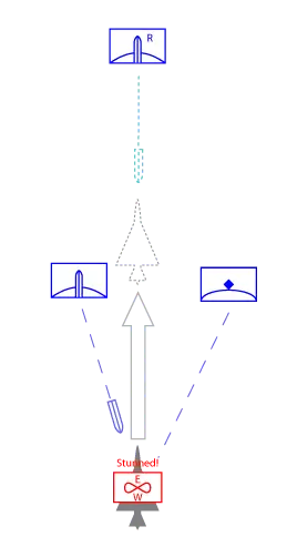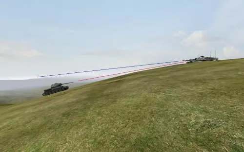在此示意图中,蓝方部队正在对红方防线执行基础侧翼机动。注意,红方防线上的单个载具无法同时将其正面装甲朝向两支(蓝方)部队。这意味着它们要么撤退,要么因较弱的装甲被击中而被摧毁。这正是你希望发生的情况。让我们来观察游戏中侧翼机动的实际样子: