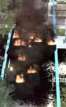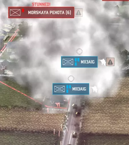 当敌方步兵陷入眩晕和致盲状态(注意此处烟雾掩护未能完全遮蔽步兵的视线;M113A1G下方集群旁的步兵班未被致盲),此时正是发起突击的时机。下达快速移动命令(这是少数在直接攻击中可使用快速移动的情况之一),让你的运输载具迅速穿过烟雾进入城市内部。