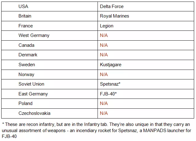 我喜欢将侦察步兵悄悄部署到敌后。我认为他们是不可或缺的,尤其是乘坐运输直升机时,他们可以在着陆隐蔽前快速穿越地图。 桑迪的选择:【突击队伞兵】、【海军陆战队猎兵】、【海军陆战队特种部队】、【特种部队单位】 侦察特种部队是另一类侦察步兵。与基础侦察步兵不同,这些家伙是特种作战小队——他们通常配备更高级的武器,比如高端反坦克武器和近战机枪,这意味着他们能很好地与敌方步兵或坦克周旋。和侦察步兵不同,这些单位本身就是出色的猎杀小队,能够潜行、发现目标并将其消灭。和其他特种部队一样,他们也是优秀的伏击部队。