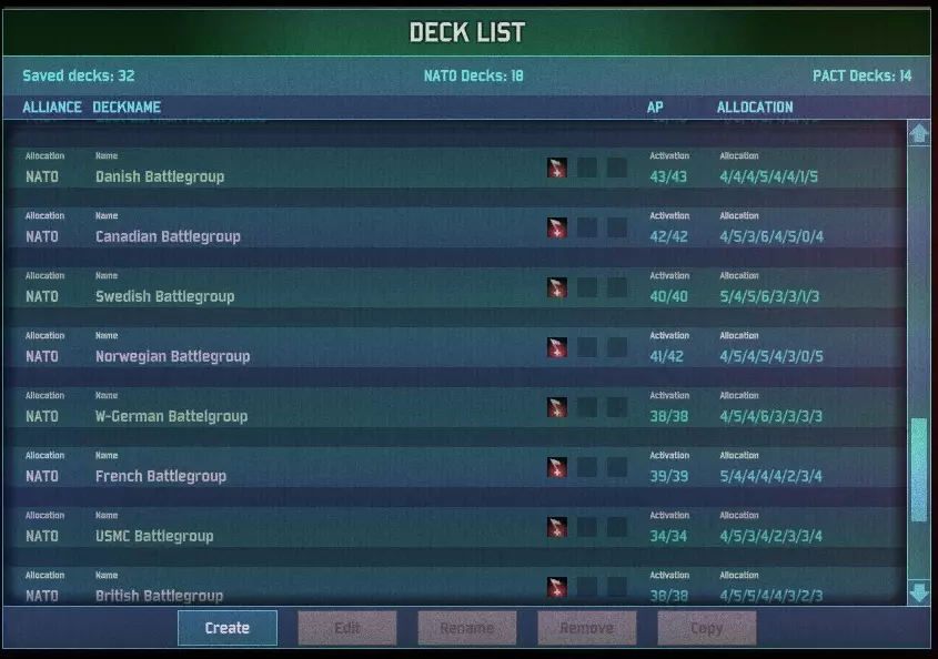 这意味着受国家限制的卡组可以比混合国籍的卡组拥有更多卡牌。这也意味着,为了平衡小国家通常缺乏选择的问题,使用小国家卡组会比使用美国和苏联卡组拥有更多卡牌。不过,这并不意味着单一国籍的卡组本质上更优越;这仅仅意味着,由于选择更少且激活点数更高,用它们组建卡组会更容易。 你还可以从六种类型中选择一种。选择卡组类型(或主题)能为你带来更高的经验值(相当于为整个单位类别提供一次固定等级的 veterancy 升级),并降低特定类型单位的部署点数消耗,但会锁定非该类型的单位,同时限制其他类别可用的卡牌槽位。六种类型如下: