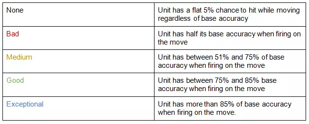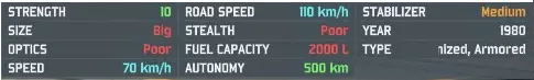 强度数值表示单位拥有的生命值。对于步兵班组而言,该数值代表班组的士兵数量。 尺寸数值会影响敌方的命中率——大型目标比小型目标更容易被击中。大型目标会略微提升敌方的命中率,而小型目标则会略微降低敌方的命中率。这种影响幅度大约在5%到10%之间,但具体数值并未公开。与普遍看法不同,尺寸不会影响射程或发现目标的几率。哦,对了,在飞行器中,这个属性被称为电子对抗(ECM),但其作用机制类似——电子对抗性能越好,被击中的几率就越低。 光学设备决定单位能够发现其他单位的距离。侦察单位通常拥有【极佳】或【卓越】的光学设备,而非侦察单位的光学设备一般为【较差】或【糟糕】。需要了解的重要一点是,所有单位实际上都有两个侦察数值,但仅显示其中一个——地面单位显示地面光学值,空中单位显示空中光学值。防空单位会显示其对空光学值,而其他所有单位则显示对地光学值。这就是雷达防空炮和地对空导弹在单位卡片上常显示【卓越】光学值的原因。侦察单位通常能同时良好地探测空中和地面单位。 速度和公路速度是两个不同的概念——公路速度是执行【快速移动】命令时的速度,而速度是基本移动的基础速度。速度会受到地形、士气等因素的影响。最快的公路行驶车辆速度为150km/h。 隐蔽性的作用与许多人认为的体型作用相似——它们会影响敌人发现目标的几率;隐蔽性强的单位在被发现前可以更接近侦察单位。少数车辆具有不错的隐蔽性,而大多数小型步兵班则拥有良好的隐蔽性。 燃油容量以升为单位,衡量车辆可容纳的燃油量。续航里程是一个相关数据,表示单位在完全耗尽燃油前能够行驶的距离。如果你感兴趣的话,续航里程除以燃油容量可以得出燃油效率(油耗)。 单位:单位信息面板 III 稳定器是极为重要的信息。稳定器能让单位在移动中准确射击。稳定器根据以下表格体现载具在移动时的精准度: