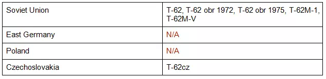 基础型T-55是一辆15分的低端坦克。T-55A(在波兰被称为L型,其他方面完全相同)是5分的改进型,增加了一挺机枪并将主炮改进为可用状态。和所有低端坦克一样,它们确实需要数量优势或近距离作战才能真正发挥作用。所有高于基础型号的T-55都配备了中型稳定器,大多数型号的越野速度较慢,为50公里/小时。大多数型号的正面装甲对于其价格来说还算不错,但并不突出。高端T-55变体与价格更低的T-72和T-64竞争,但许多型号配备了堡垒反坦克导弹和出人意料的优秀火炮。 低端T-55是集群坦克,尤其在C类卡组中。不过,不要忽视高端T-55,作为苏联的中等成本一线坦克,我实际上更喜欢T-55AMV,而不是同价位的T-64A。虽然高端T-55坦克配备的11AP火炮性能相对平平,但它们是将不错的反坦克导弹部署到战场上的经济实惠之选。尽管堡垒反坦克导弹无法一击摧毁北约的重型坦克,但数量上的优势使其表现尚可,并且能在北约装甲部队进入反击射程之前对其造成一定损伤。 T-62是华约的下一代主战坦克系列。它曾短暂担任苏联的主战坦克,但并未获得广泛认可,不到十年就被T-72取代了这一地位。该坦克的出口范围也不广。其衍生型号包括: