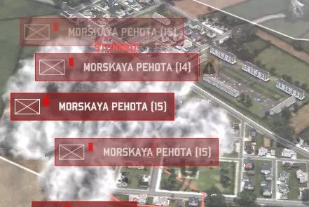 我们的首要任务是同时使用烟雾弹并以火炮或迫击炮火力打击他们(注意【眩晕!】标记)。使用烟雾弹并非可选项。如果不这样做,你将损失大量步兵单位。为什么?因为如果载有步兵的运输载具被摧毁,其中的步兵也会一同阵亡。这些海军陆战队向接近的运输载具发射的RPG火箭弹越多,他们就能在战斗开始前消灭越多的步兵。务必用烟雾弹彻底遮蔽所有视线,如果烟雾弹落在城镇内过远的地方,他们仍能进行射击。烟雾弹应部署在你的部队与敌方部队之间。