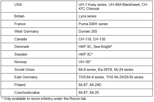指挥直升机是直升机指挥载具。它们的优势在于比任何地面指挥载具都快得多,但防护能力非常弱,一旦遭遇防空单位的幸运攻击就可能被摧毁。它们可用于快速抢占前沿阵地,尤其是前沿 spawn zone,但要注意不要脱离护卫!它们包括: