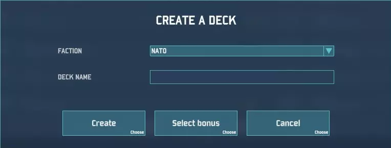 为你的卡组命名,选择北约或华约阵营,然后点击创建。暂时忽略选择加成按钮。 卡组构筑:创建自定义卡组 完成上述操作后,你将看到一个巨大的空白卡组,如下所示: