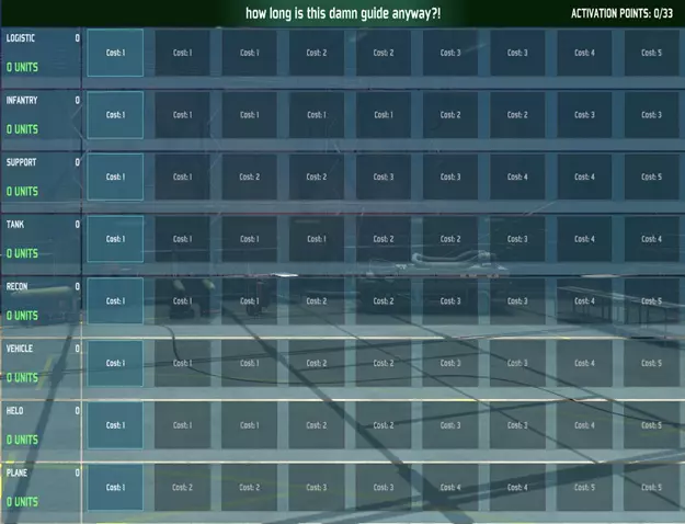 如果从零开始构建似乎太过困难,你可以先复制一个预设的战斗群,然后再进行编辑——你会进入相同的界面,但会有一个预设的卡组供你修改。 现在看向右上角,那里显示着你的激活点计数器。你不会以为每个类别都能选九个单位吧?哈哈,当然不是。只有那些“奶酪”卡组才会在一个类别里用满九个槽位。你总共有三十三个激活点,用来“购买”卡片并添加到你的卡组中。你可以在方框里看到添加一张卡片的成本——一个类别中的卡片越多,添加新卡片的成本就越高。有些类别,比如支援和飞机,比坦克和步兵等其他类别更有价值,成本也更高。点击任意类别中高亮的方框,你会进入一个类似军械库的界面,其中会列出该类别下所有可用单位。点击某个单位后, veterancy 按钮将会高亮显示。