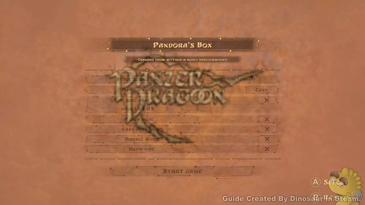 Leeroy Jenkins 任何一个关卡不杀死小兵的情况下过关即可达成。 附注:推荐使用上帝模式选最后一关来达成。 游戏结束之后的秘密 游戏结束后你会发现特殊讯息,告知你可以解锁隐藏的秘密模式,在游戏标题中输入作弊码即可使用各种隐藏的特殊功能,而输入作弊码成功时会有一声龙叫声。 附注1:作弊码请斟酌使用,因为作弊码会有各自的副作用,如游玩时间、命中率不列入计算等等。 附注2:如果输入作弊码失败可以先进入游戏的其他选项再回到标题重新输入。 附注3:此外游玩的当下使用作弊码会一直持续有效,必须关闭游戏后重新启动才会解除。在标题中输入(↑ ↑ ↓ ↓ ← → ← → B B)的作弊码即可开启潘多拉的盒子。 功用:里面除了可以使用各种游戏设定的潘多拉模式之外,还可以观赏游戏图鉴与游戏结局。 潘多拉模式功能介绍 1. 关卡选择:可以任意选择章节关卡或观看章节过场动画。 2. 难度:可以选择游戏难度。 3. 加速:游戏中同时按下(左摇杆 + 右摇杆)可以切换游戏进行速度。 4. 上帝模式:游戏中开启无敌状态。 5. 旧版模式:以1995年SEGA Saturn最初原始版本的设定来进行游戏。 6. 禁用骑手:以无骑手的状态游玩。 7. 快速射击:按住B键的手枪射击会变成自动连发。