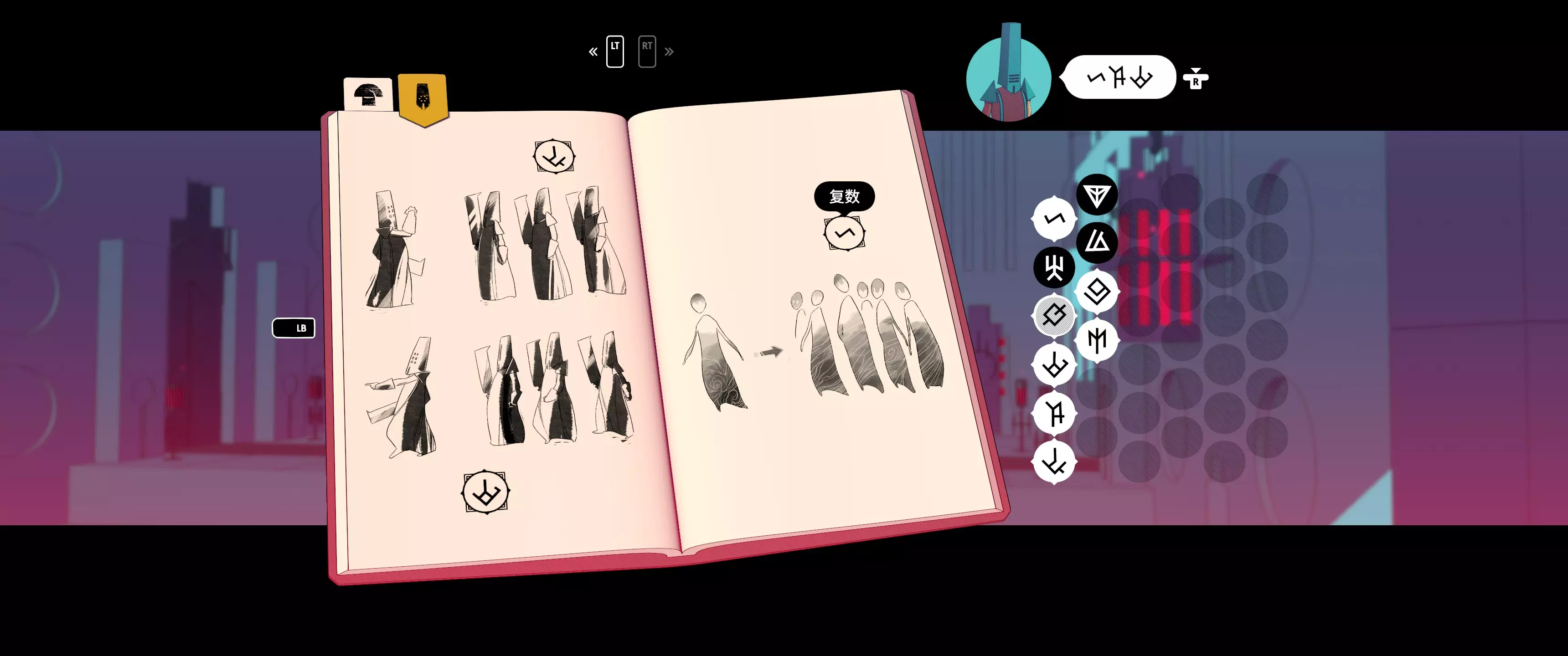 游玩的过程就仿佛回到了非常非常小的时候,大字不识一个,一句话都不认识,只能一点一点靠观察世界去理解字符,看这些人在做什么,穿什么样子,言行举止和语气是什么样子,身边有什么,身处的环境是什么。 游戏提供了一个可以自由记载任何文字释义的笔记本(也支持中文输入),我基本就是遵循一个从粗到浅,可能先记下几个字出现的语境,往后遇到更多再慢慢细推。