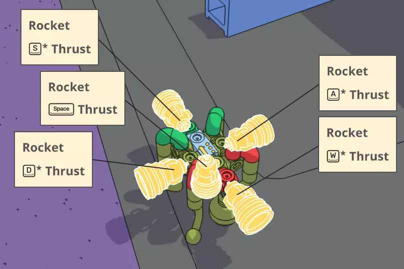 要使用这个装置,需通过按下空格键(或你设置为主推进器的其他按键)来启动。在使用ASWD键控制时,我的体验是可以轻松用单手操控,同时用鼠标移动视角。 关键在于利用空格键和底部推进器保持飞行状态,同时通过四个方向推进器将无人机转向你想要的方向。如果不这样做,你很快就会看到它失控旋转。因此,推进力是维持稳定飞行路径的关键。