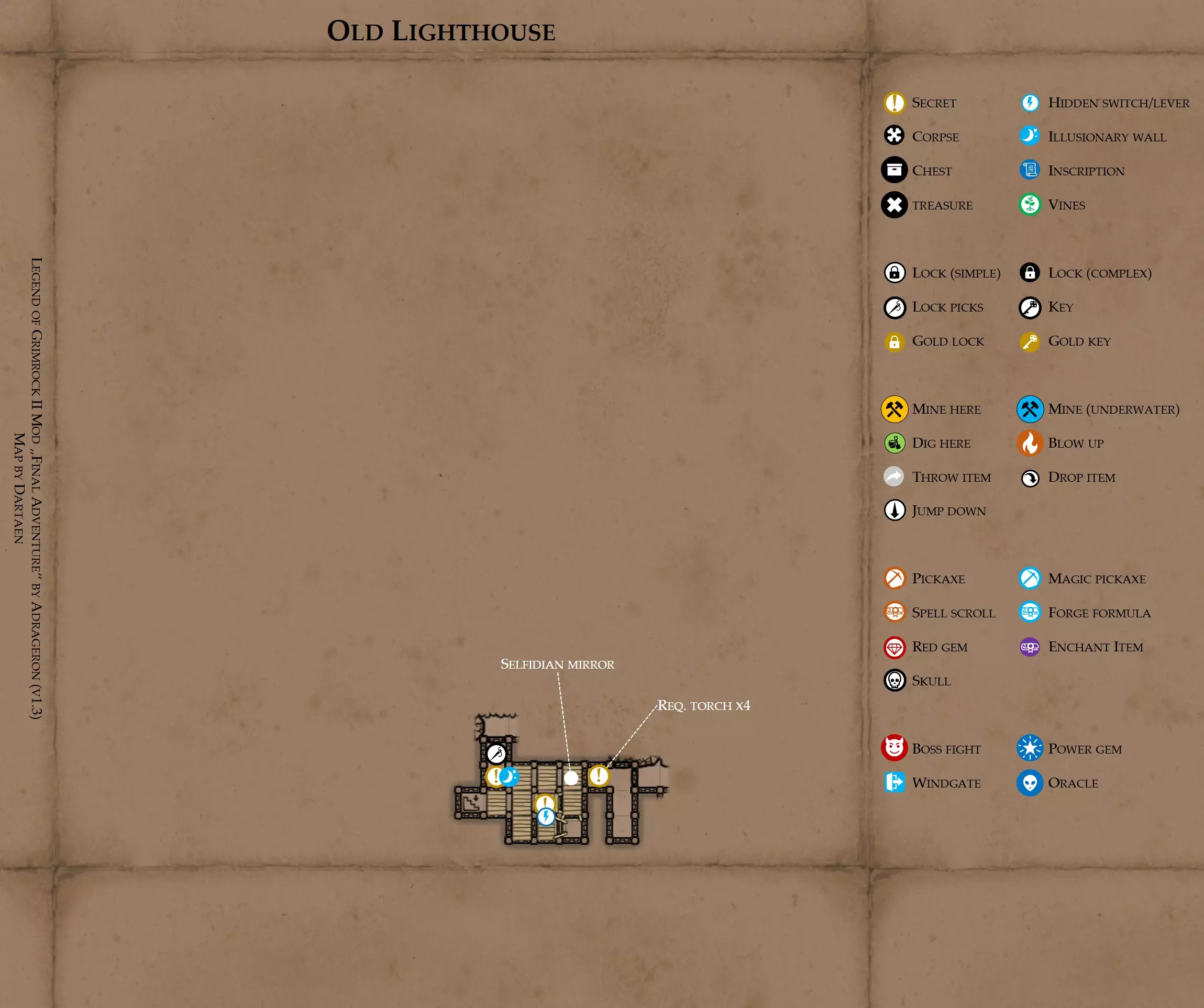 提示 第一个隐藏在瀑布后的秘密。第二个瀑布隐藏着一块可用镐头砸碎的岩石。 火球走廊:启动火球的拉杆同时会打开通往南侧房间秘密的移动墙壁。当火球击中接收器时墙壁会再次关闭,因此你必须阻挡火球(最好使用【力场】,如果情况紧急也可以用你的队伍成员)。 旧灯塔 关于此区域 非常小的区域,没什么太多可看的。 包含【塞尔菲迪安魔镜】,你可以在【外堡】使用它。