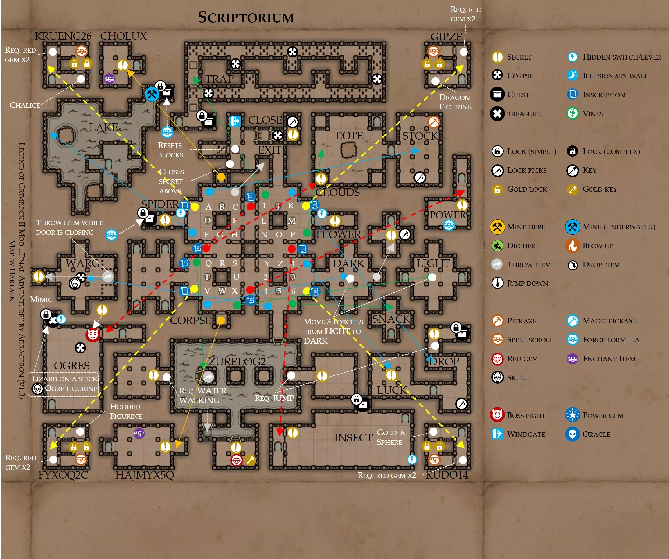 提示 西部通往湿地的楼梯附近有一个秘密区域,里面藏有一颗红宝石。若没有从抄写室获得跳跃法术,你将无法拿到它。 在此区域的西北方向右侧,楼梯旁还有另一个秘密区域。该区域需从抄写室开启。具体操作如下:关闭挡住楼梯的大门,通过风之门离开抄写室,再经由风之门前往加诺达特,从另一侧返回楼梯处。此时,挡住秘密区域的墙壁将会消失。 抄写室 关于此区域 这里有八个方块悬浮在32个(4x8)能量方格上方。每个方格对应一个字母或数字1至6。你可以通过推动对应方格上的方块来选择字母或数字。你的任务是选择字母并组成单词。这将开启该区域的新部分。 要获取所有卷轴和任务物品,你总共需要8颗红宝石和8把金钥匙。你会在这里找到一些,但必须从其他区域带来一些。别忘了,你可以从根灵洞穴的鼠人商人那里购买金钥匙。