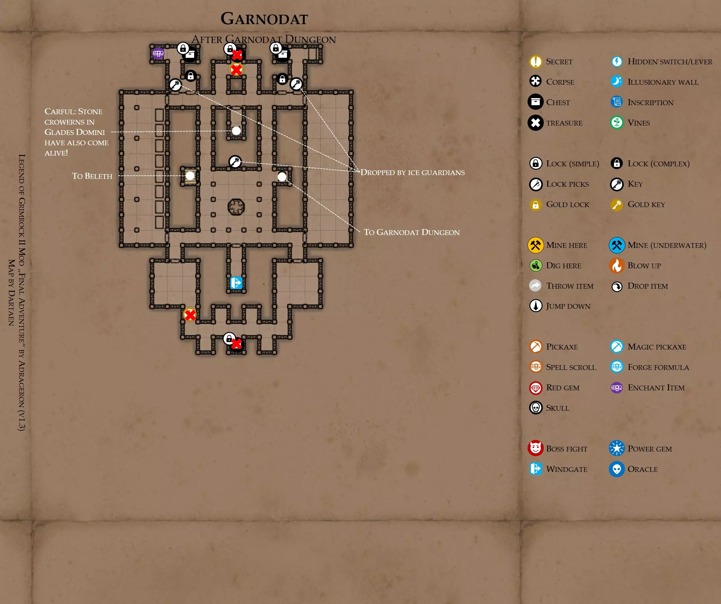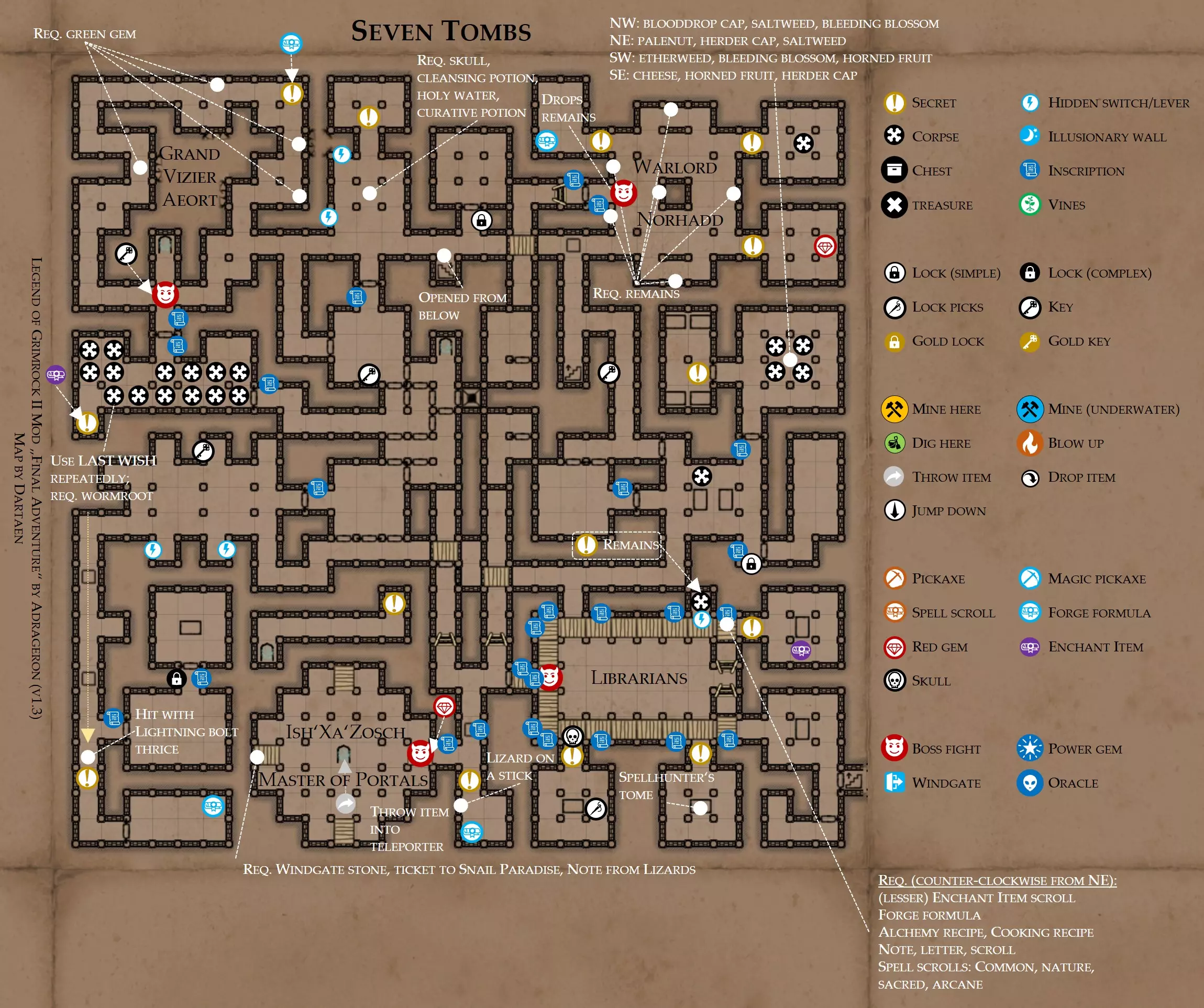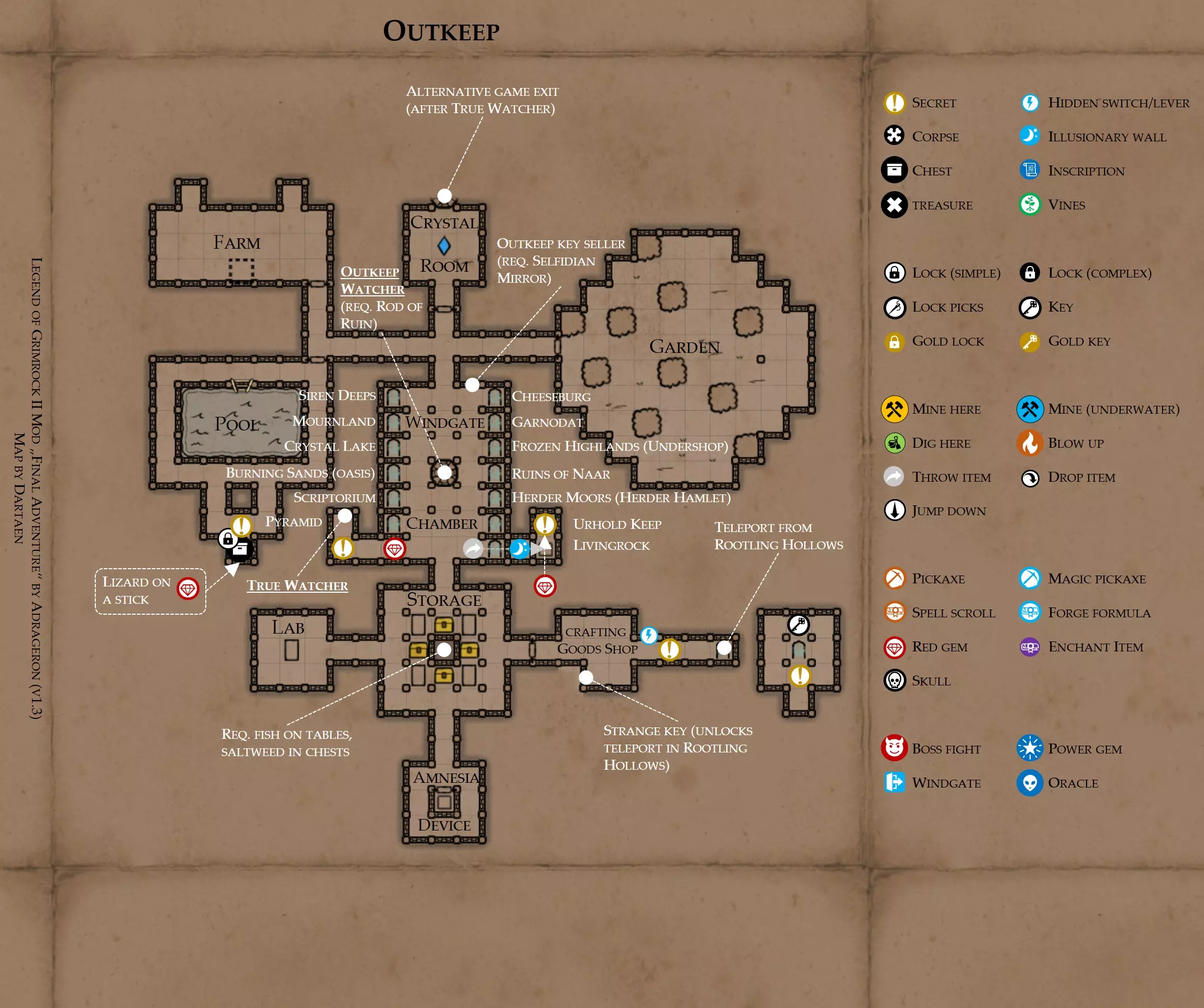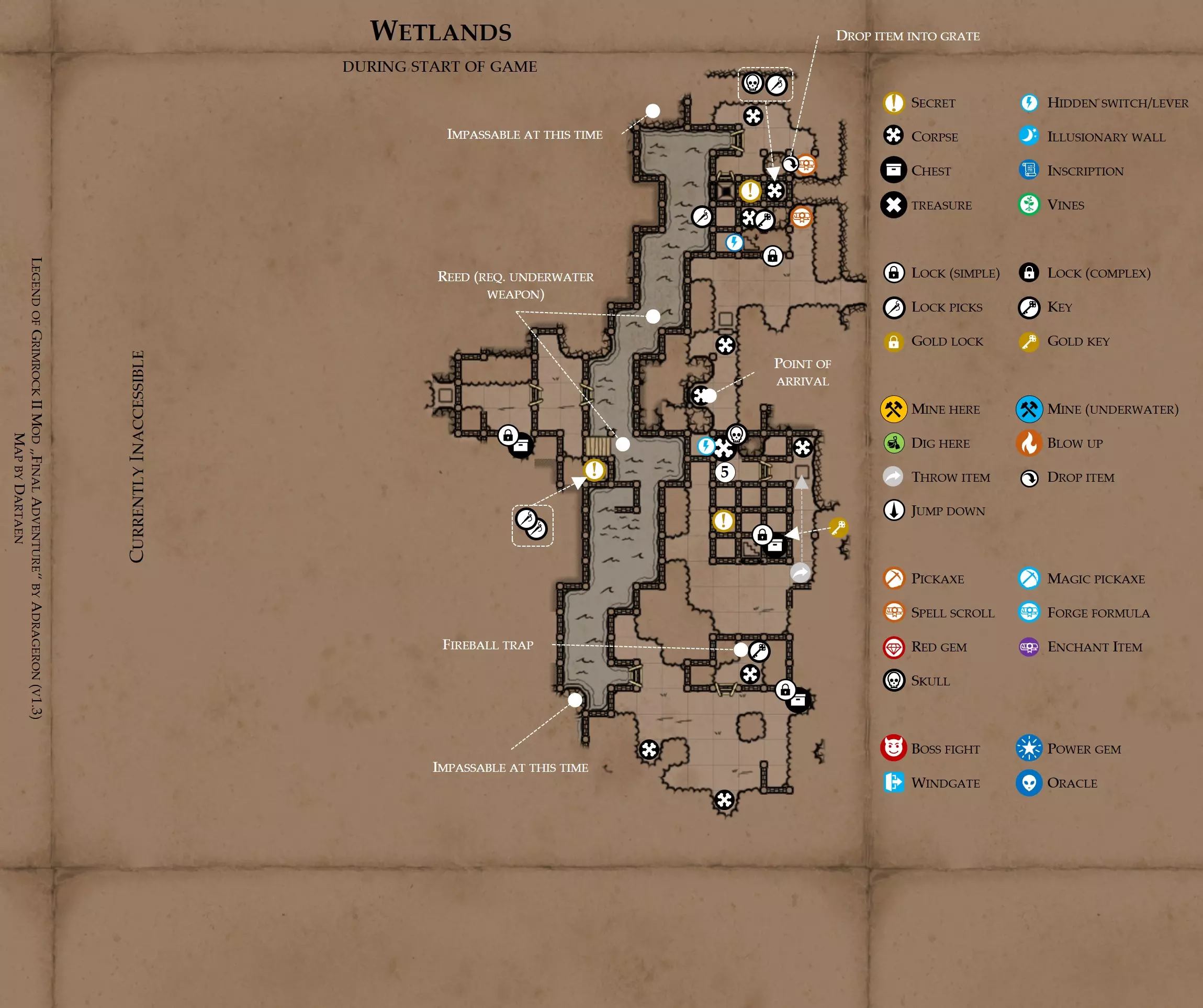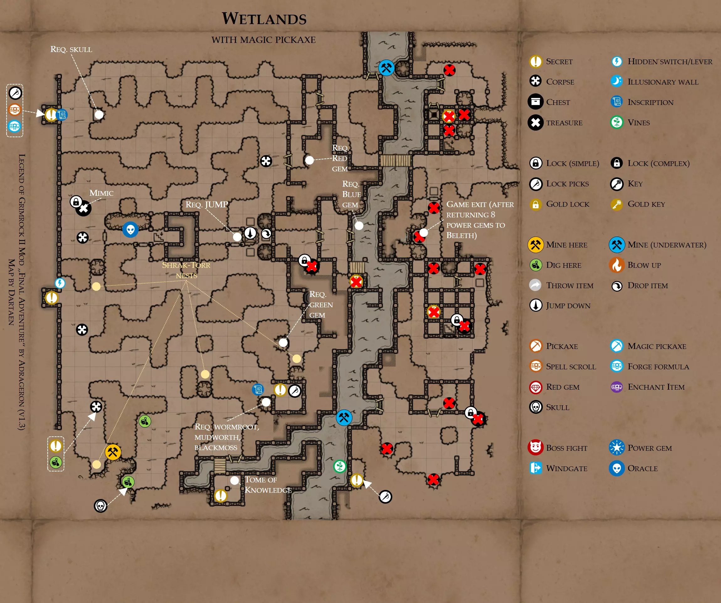 《魔岩山传说2》模组“最终冒险”(版本1.3)攻略与策略指南(含地图) 通用提示 关于本模组 “最终冒险”是Steam用户兼《魔岩山传说2》爱好者Adrageron制作的第三个模组(前两个为“失落之城”和“守护者”)。许多人(包括我在内)认为他的模组优于《魔岩山传说2》原版战役,因此我强烈推荐你也尝试一下这些模组。 与原版游戏相比的新概念和改动 本模组包含一些《魔岩山传说2》原版中没有的独特概念。部分现有概念也进行了重大改动。 分数与成就:完成游戏后会获得分数,同时还有多项成就可供解锁。难度越高、完成速度越快,获得的分数就越高。学习法术卷轴:角色必须先从法术卷轴中学习法术才能施展,因此必须先找到(或购买)卷轴。学习时卷轴会被消耗,所以每个角色需要一份卷轴。部分法术现在仅特定职业可学习。 烹饪食物:所有食物必须先在烹饪工具中烹饪后才能安全食用。像海龟、战狼等怪物只会掉落生食材。 采矿与爆破:可以使用镐头破坏岩石和部分墙壁,使用燃烧瓶引爆塌方。 物品打造:可以使用锻造配方和打造材料打造并升级物品(包括整套装备)。 物品附魔:可以使用物品附魔卷轴强化物品,例如为武器提升伤害,为盔甲增强防护,或加快法杖的冷却速度。 货币与商人:你可以用美元(纸币)从商人处购买装备,也可以出售不再需要的物品换取美元,美元可通过游戏中的战利品获取。和原版游戏一样,你也可以使用金钥匙开启特定的宝藏。 改进的 firearms:所有 firearms 伤害提升,且现在会从敏捷属性获得额外伤害加成。 重做的技能与特性选择。 新的法术、增益效果和负面状态。 新的和重新平衡的角色职业。 新的食物、饮品和药水配方。 新物品,包括新的套装及套装加成。 新的和重做的怪物,大多数比原版游戏显著更难。角色创建时需注意事项 部分高阶法术仅特定职业可施展。若条件允许,至少培养一名能施展自然系和奥术系法术的角色。神圣系法术虽有帮助,但并非必需。 即使没有施法者也能通关游戏,因为你会找到一些可施展这些法术的遗物。不过,这些遗物每使用几次就需用充能碎片进行充能。 若你在较高难度下游玩,后期怪物造成的伤害极高,护甲几乎失去作用。此时,极高的闪避率是更好的选择,因此不要吝啬前线战士的敏捷属性。游戏过程中需要注意的事项 部分游戏后期的敌人非常强大,因此尽量将最强力的增益道具留到后期使用(如治愈水晶碎片、 rage potions、 Force traps、冰霜炸弹等)。 游戏内所有商店会在每周第7天的午夜刷新随机物品库存。如果对新物品不满意,可以存档后重新加载。 遇到以下物品打折时务必购买:蜥蜴串(至少需要一个来解锁某个秘密,最好买两个以便尽早获取)和palenuts(用于为装备附加闪避 enchantment)。 如果可能,为每个魔法学派(通用、神圣、自然和奥术)保留一张法术卷轴,不要学习它们。在燃烧沙地下方的七座古墓中解谜时会需要这些卷轴(之后可以再学习)。否则,你就必须从商人或图书馆购买缺失的卷轴。 你需要镐来开采(即击碎)岩石,需要开锁器来打开上锁的箱子和铁锁。游戏过程中你会找到一些,但要敲碎每块石头、掠夺每个箱子,就需要购买一些。你可以在加诺达特用蓝宝石购买开锁器,在芝士堡用美元购买。镐可以在加诺达特或地下商店以每把蓝宝石的价格购买。地下商店还提供魔法镐,售价为绿宝石,其耐用度是普通镐的三倍,且可在水下使用。 你可以在地下商店购买一本提升采矿技能的书,以及另一本能让你的燃烧瓶清除塌方的书。牧人小村有一本提升烹饪技能的书。一旦你获得了【复杂开锁】特性(该特性允许你使用2-4根开锁器打开大多数锁),开始保存每种类型的钥匙(黄铜钥匙、骷髅钥匙、华丽钥匙等)。你在金字塔的某个谜题中会需要这些钥匙。 如果你计划出售多余物品换取金钱,建议事先在【芝士汉堡镇】购买【交易的艺术】卷轴。花费500金币购买后,你出售物品的价格将提高约15%。 你会找到数量有限的【物品附魔】卷轴(以及【次级物品附魔】卷轴)。这些卷轴非常强大,但使用后会消耗,且每件物品只能附魔一次。因此,在找到游戏末期前你能使用的最强大装备之前,不要使用它们。当你到达水晶湖时,你还能在那里获得一本【附魔强化宝典】,它可以提升你的附魔威力。 完成游戏的方式: 1. 为贝雷斯找到所有力量宝石和元素精华。他会在起始位置附近开启一个传送门,将你送回冒险者公会。这种方式可能会让你错过模组的大部分后期内容,而且结局也有些平淡,所以除非你在进行速通,否则不推荐这种做法。 2. 使用【毁灭之杖】(在乌尔霍尔德地牢中找到)、16颗力量宝石和【平衡精华】完全修复【外堡】。这样你不会错过游戏的后期部分,但也不会触发 boss 战。 3.在为贝莱思找到力量宝石和精华后,与活石守望者结盟,从加诺达特地牢获取新的力量宝石,重新创造元素精华,并在贝莱思的住处将其击杀。本攻略将按照此流程进行。 地图 - 游戏开始 此处行动指南 穿过传送门前往湿地,开始你的游戏。 你当前的目标是找到雇佣你的法师贝莱思。他位于东边的加诺达特城堡。要打开通往加诺达特的道路,你需要觉醒号角,它被锁在下方的废弃地牢中。 在湿地,你必须先找到铁锁的钥匙,这样才能进入下方的废弃地牢。这样你就能拿到湿地南部的头骨钥匙,这把钥匙是获取