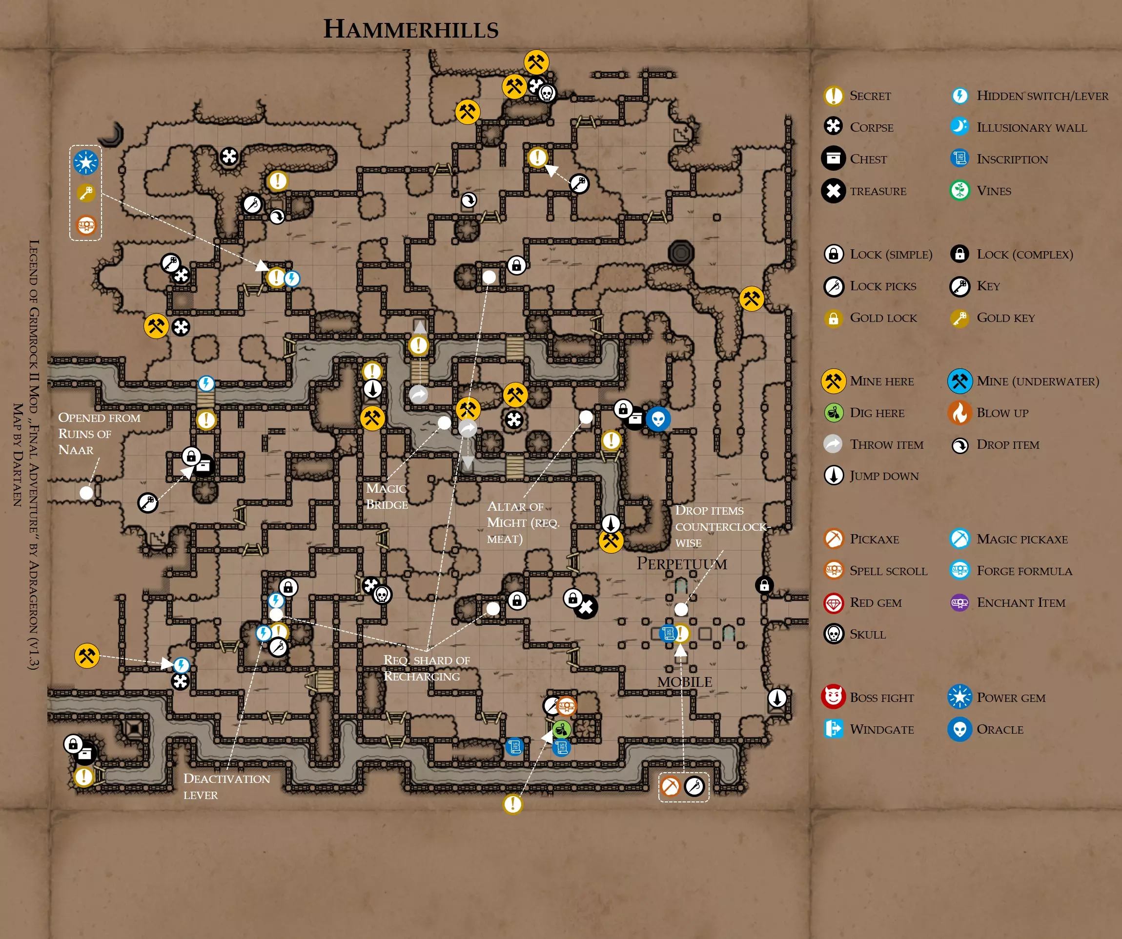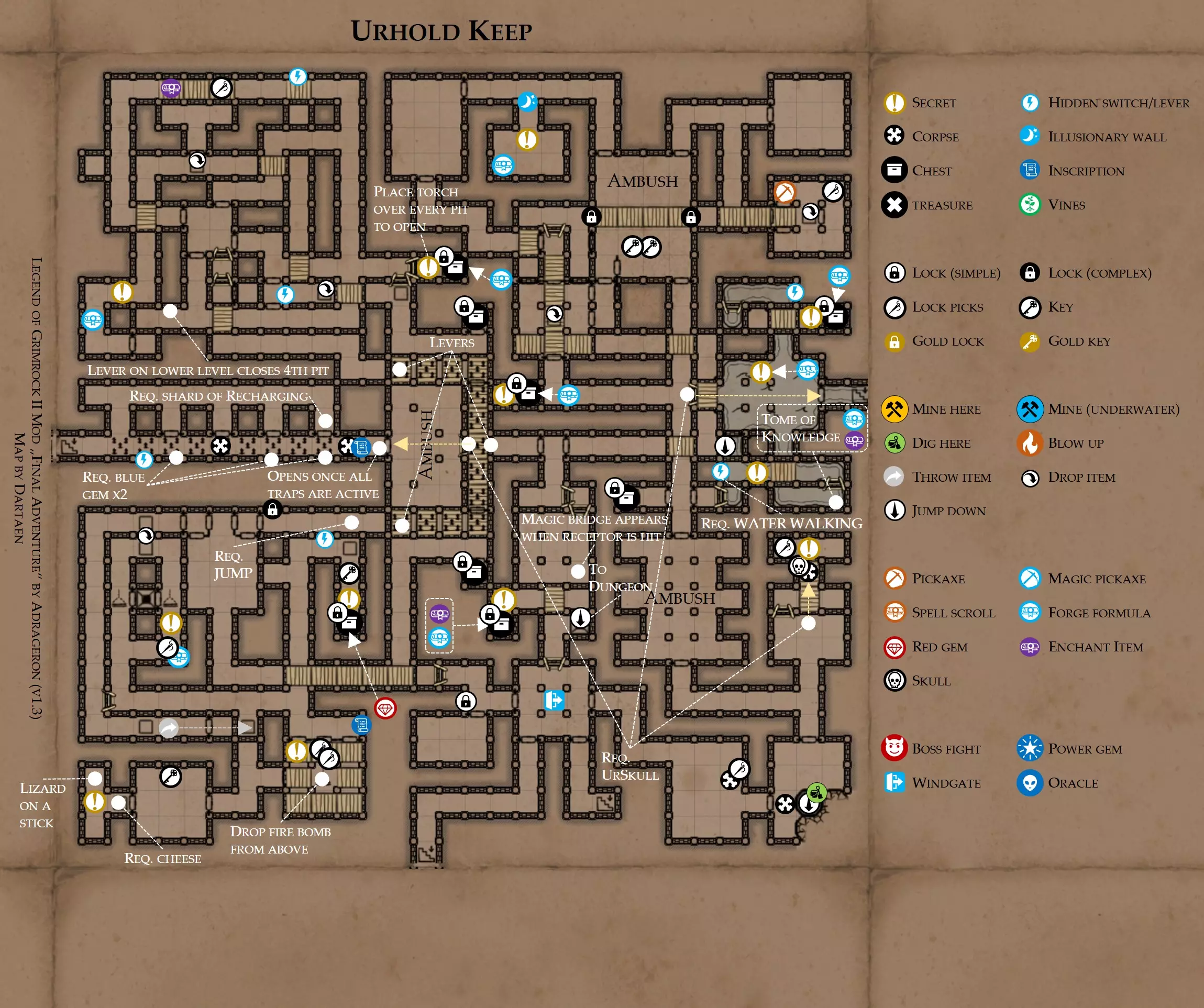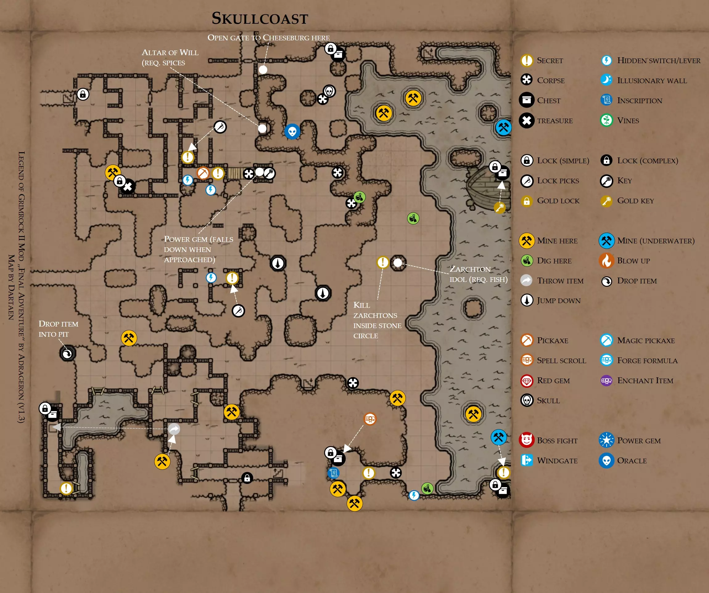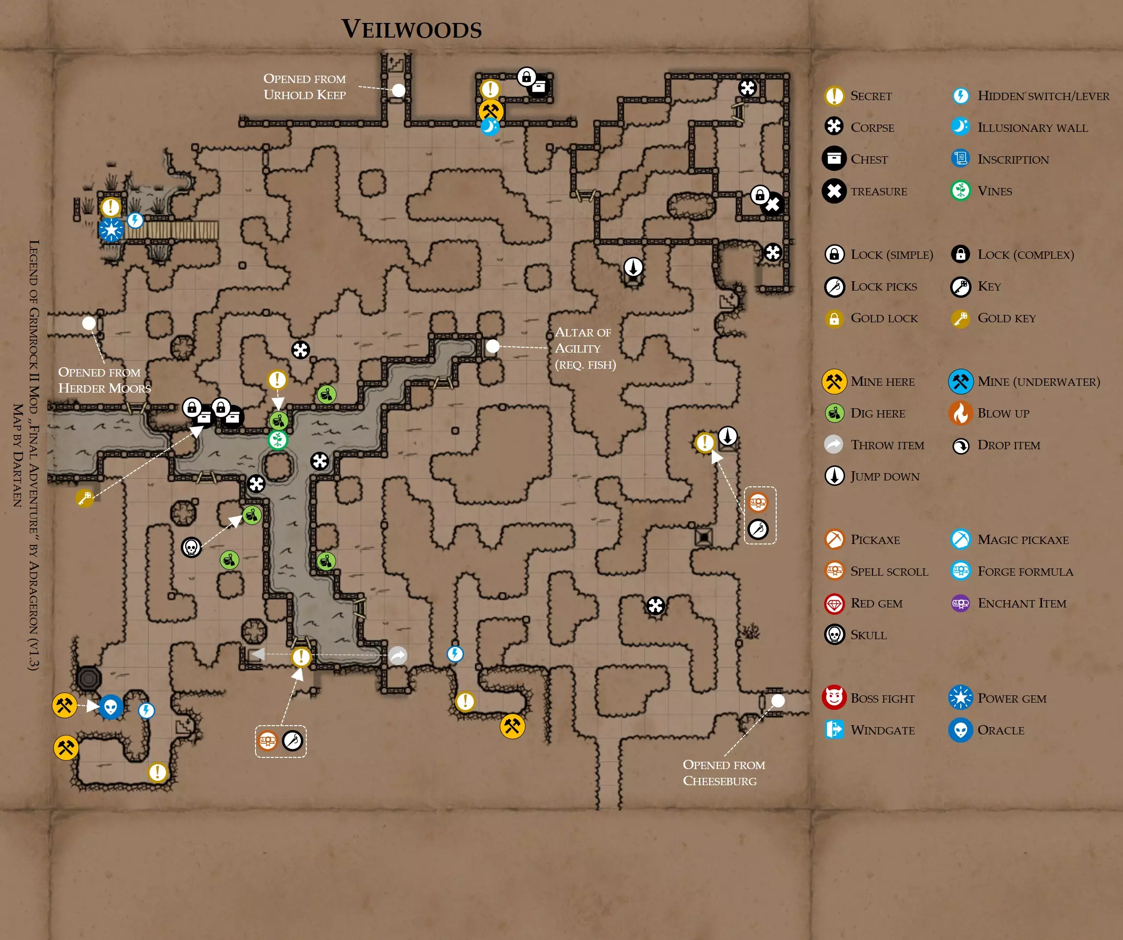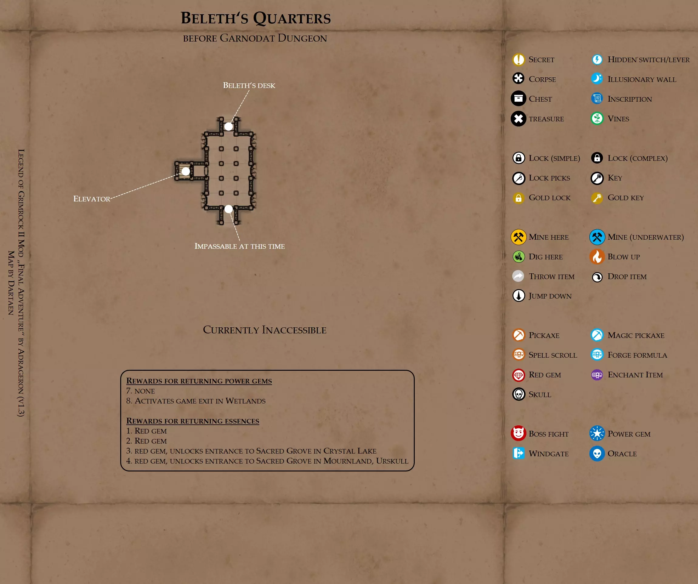 《魔岩山传说2》模组“最终冒险”(版本1.3)攻略与策略指南(含地图) 通用提示 关于本模组 “最终冒险”是Steam用户兼《魔岩山传说2》爱好者Adrageron制作的第三个模组(前两个为“失落之城”和“守护者”)。许多人(包括我在内)认为他的模组优于《魔岩山传说2》原版战役,因此我强烈推荐你也尝试一下这些模组。 与原版游戏相比的新概念和改动 本模组包含一些《魔岩山传说2》原版中没有的独特概念。部分现有概念也进行了重大改动。 分数与成就:完成游戏后会获得分数,同时还有多项成就可供解锁。难度越高、完成速度越快,获得的分数就越高。学习法术卷轴:角色必须先从法术卷轴中学习法术才能施展,因此必须先找到(或购买)卷轴。学习时卷轴会被消耗,所以每个角色需要一份卷轴。部分法术现在仅特定职业可学习。 烹饪食物:所有食物必须先在烹饪工具中烹饪后才能安全食用。像海龟、战狼等怪物只会掉落生食材。 采矿与爆破:可以使用镐头破坏岩石和部分墙壁,使用燃烧瓶引爆塌方。 物品打造:可以使用锻造配方和打造材料打造并升级物品(包括整套装备)。 物品附魔:可以使用物品附魔卷轴强化物品,例如为武器提升伤害,为盔甲增强防护,或加快法杖的冷却速度。 货币与商人:你可以用美元(纸币)从商人处购买装备,也可以出售不再需要的物品换取美元,美元可通过游戏中的战利品获取。和原版游戏一样,你也可以使用金钥匙开启特定的宝藏。 改进的 firearms:所有 firearms 伤害提升,且现在会从敏捷属性获得额外伤害加成。 重做的技能与特性选择。 新的法术、增益效果和负面状态。 新的和重新平衡的角色职业。 新的食物、饮品和药水配方。 新物品,包括新的套装及套装加成。 新的和重做的怪物,大多数比原版游戏显著更难。角色创建时需注意事项 部分高阶法术仅特定职业可施展。若条件允许,至少培养一名能施展自然系和奥术系法术的角色。神圣系法术虽有帮助,但并非必需。 即使没有施法者也能通关游戏,因为你会找到一些可施展这些法术的遗物。不过,这些遗物每使用几次就需用充能碎片进行充能。 若你在较高难度下游玩,后期怪物造成的伤害极高,护甲几乎失去作用。此时,极高的闪避率是更好的选择,因此不要吝啬前线战士的敏捷属性。游戏过程中需要注意的事项 部分游戏后期的敌人非常强大,因此尽量将最强力的增益道具留到后期使用(如治愈水晶碎片、 rage potions、 Force traps、冰霜炸弹等)。 游戏内所有商店会在每周第7天的午夜刷新随机物品库存。如果对新物品不满意,可以存档后重新加载。 遇到以下物品打折时务必购买:蜥蜴串(至少需要一个来解锁某个秘密,最好买两个以便尽早获取)和palenuts(用于为装备附加闪避 enchantment)。 如果可能,为每个魔法学派(通用、神圣、自然和奥术)保留一张法术卷轴,不要学习它们。在燃烧沙地下方的七座古墓中解谜时会需要这些卷轴(之后可以再学习)。否则,你就必须从商人或图书馆购买缺失的卷轴。 你需要镐来开采(即击碎)岩石,需要开锁器来打开上锁的箱子和铁锁。游戏过程中你会找到一些,但要敲碎每块石头、掠夺每个箱子,就需要购买一些。你可以在加诺达特用蓝宝石购买开锁器,在芝士堡用美元购买。镐可以在加诺达特或地下商店以每把蓝宝石的价格购买。地下商店还提供魔法镐,售价为绿宝石,其耐用度是普通镐的三倍,且可在水下使用。 你可以在地下商店购买一本提升采矿技能的书,以及另一本能让你的燃烧瓶清除塌方的书。牧人小村有一本提升烹饪技能的书。一旦你获得了【复杂开锁】特性(该特性允许你使用2-4根开锁器打开大多数锁),开始保存每种类型的钥匙(黄铜钥匙、骷髅钥匙、华丽钥匙等)。你在金字塔的某个谜题中会需要这些钥匙。 如果你计划出售多余物品换取金钱,建议事先在【芝士汉堡镇】购买【交易的艺术】卷轴。花费500金币购买后,你出售物品的价格将提高约15%。 你会找到数量有限的【物品附魔】卷轴(以及【次级物品附魔】卷轴)。这些卷轴非常强大,但使用后会消耗,且每件物品只能附魔一次。因此,在找到游戏末期前你能使用的最强大装备之前,不要使用它们。当你到达水晶湖时,你还能在那里获得一本【附魔强化宝典】,它可以提升你的附魔威力。 完成游戏的方式: 1. 为贝雷斯找到所有力量宝石和元素精华。他会在起始位置附近开启一个传送门,将你送回冒险者公会。这种方式可能会让你错过模组的大部分后期内容,而且结局也有些平淡,所以除非你在进行速通,否则不推荐这种做法。 2. 使用【毁灭之杖】(在乌尔霍尔德地牢中找到)、16颗力量宝石和【平衡精华】完全修复【外堡】。这样你不会错过游戏的后期部分,但也不会触发 boss 战。 3.在为贝莱思找到力量宝石和精华后,与活石守望者结盟,从加诺达特地牢获取新的力量宝石,重新创造元素精华,并在贝莱思的住处将其击杀。本攻略将按照此流程进行。 地图 - 游戏开始 此处行动指南 穿过传送门前往湿地,开始你的游戏。 你当前的目标是找到雇佣你的法师贝莱思。他位于东边的加诺达特城堡。要打开通往加诺达特的道路,你需要觉醒号角,它被锁在下方的废弃地牢中。 在湿地,你必须先找到铁锁的钥匙,这样才能进入下方的废弃地牢。这样你就能拿到湿地南部的头骨钥匙,这把钥匙是获取