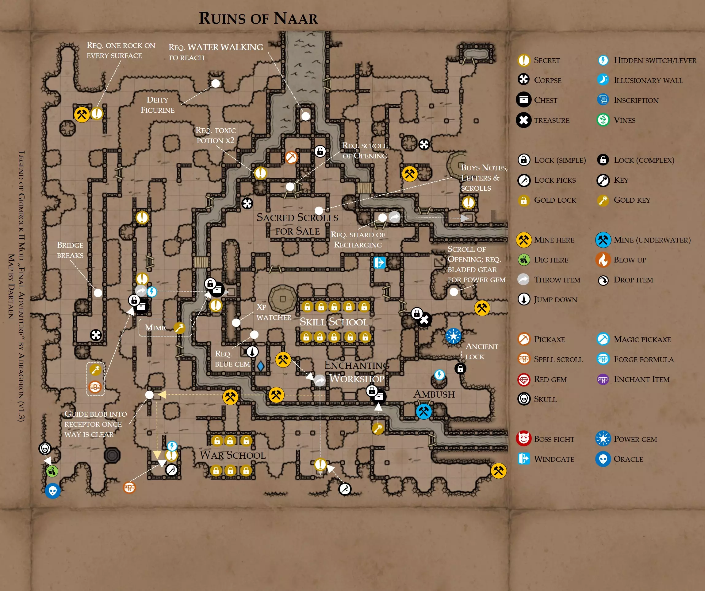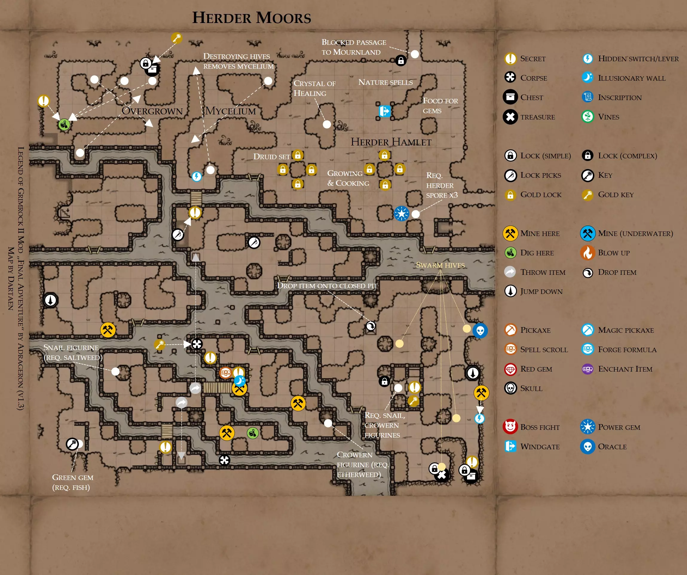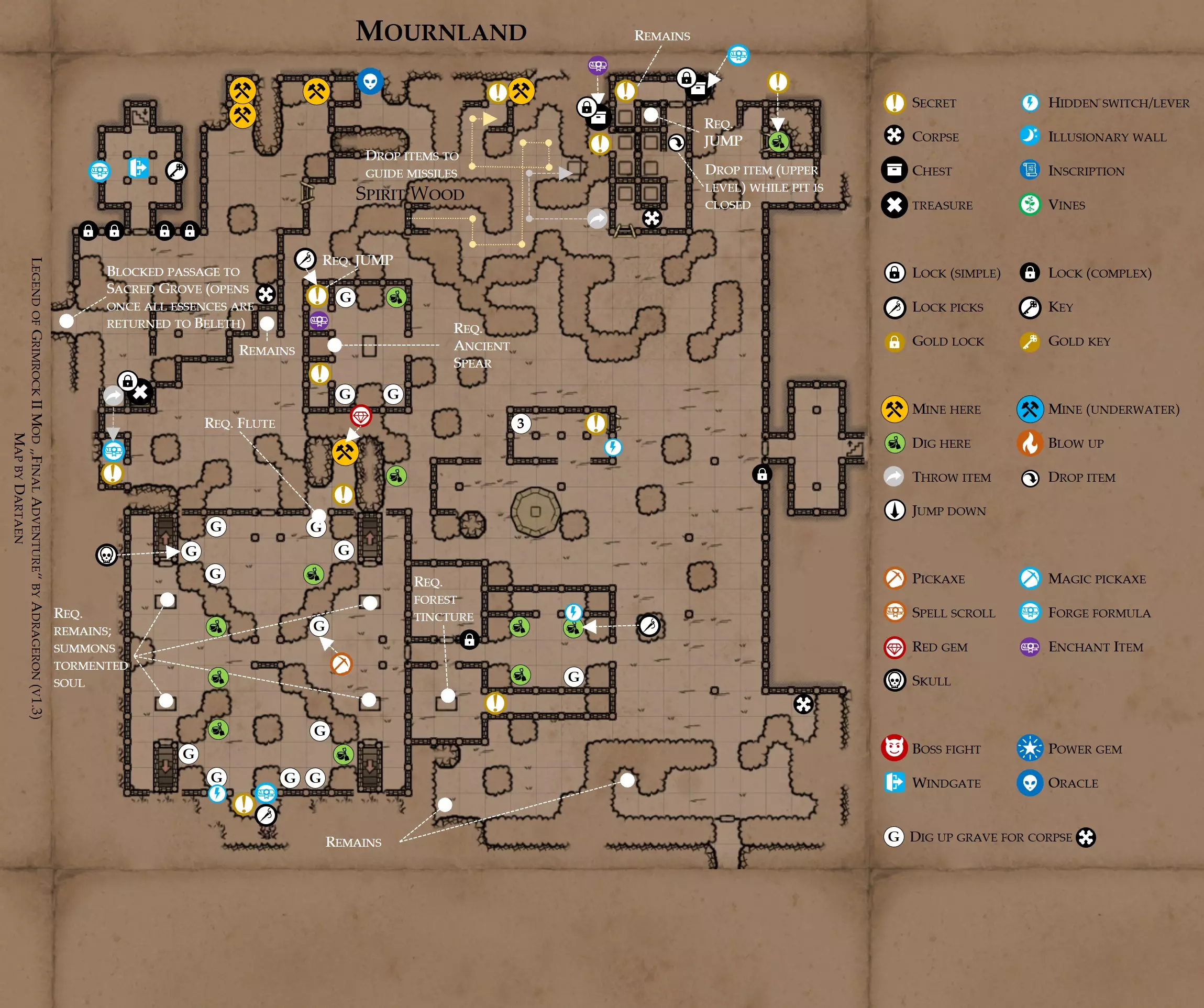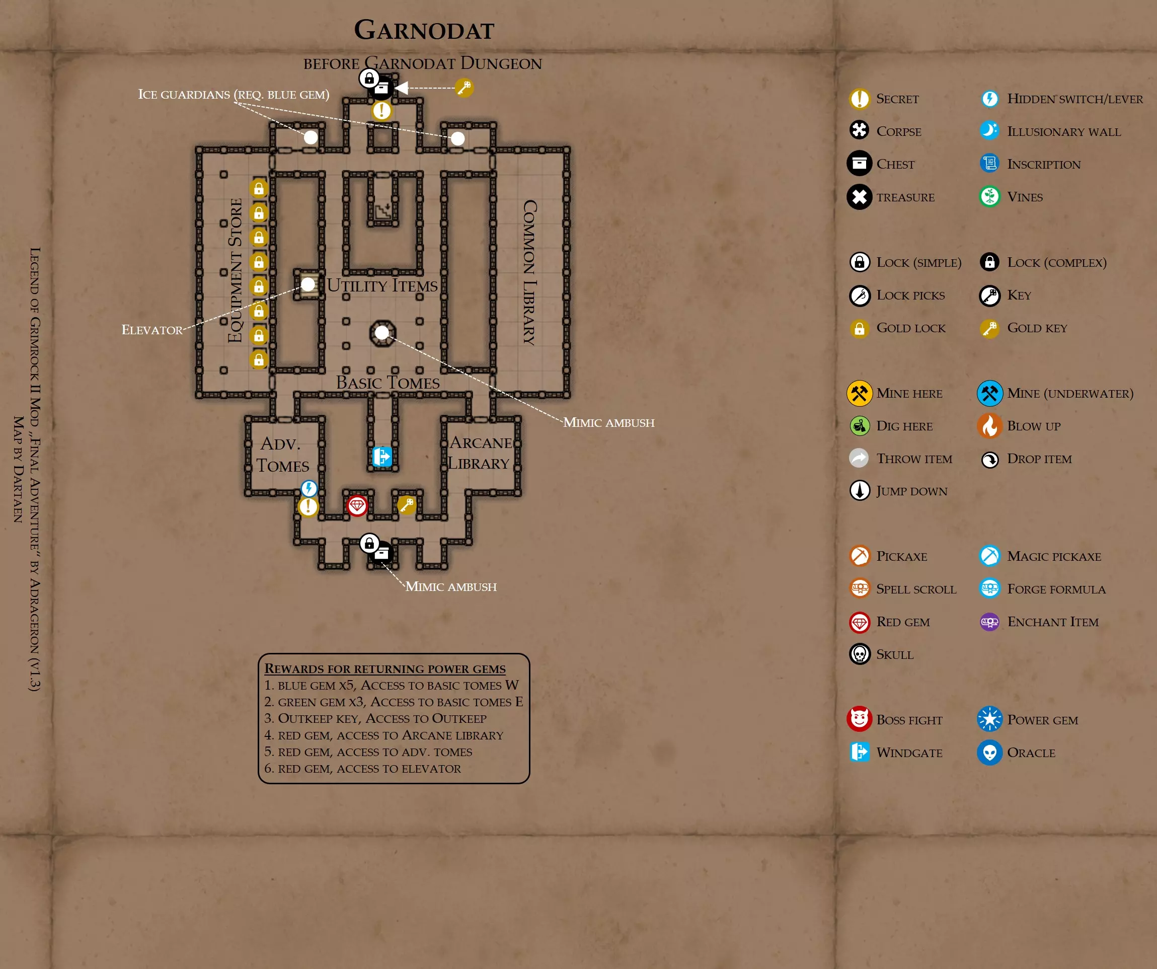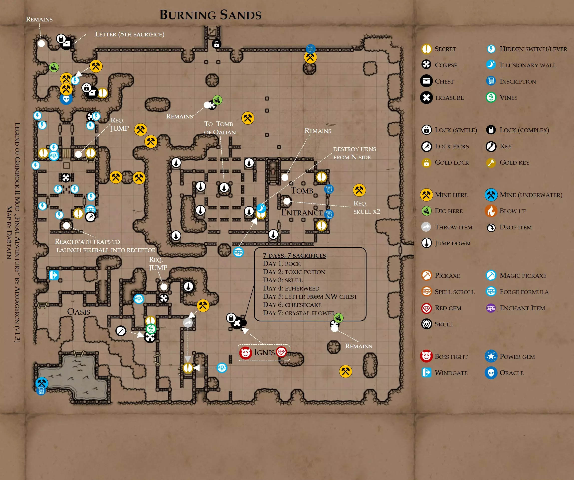 《魔岩山传说2》模组“最终冒险”(版本1.3)攻略与策略指南(含地图) 通用提示 关于本模组 “最终冒险”是Steam用户兼《魔岩山传说2》爱好者Adrageron制作的第三个模组(前两个为“失落之城”和“守护者”)。许多人(包括我在内)认为他的模组优于《魔岩山传说2》原版战役,因此我强烈推荐你也尝试一下这些模组。 与原版游戏相比的新概念和改动 本模组包含一些《魔岩山传说2》原版中没有的独特概念。部分现有概念也进行了重大改动。 分数与成就:完成游戏后会获得分数,同时还有多项成就可供解锁。难度越高、完成速度越快,获得的分数就越高。学习法术卷轴:角色必须先从法术卷轴中学习法术才能施展,因此必须先找到(或购买)卷轴。学习时卷轴会被消耗,所以每个角色需要一份卷轴。部分法术现在仅特定职业可学习。 烹饪食物:所有食物必须先在烹饪工具中烹饪后才能安全食用。像海龟、战狼等怪物只会掉落生食材。 采矿与爆破:可以使用镐头破坏岩石和部分墙壁,使用燃烧瓶引爆塌方。 物品打造:可以使用锻造配方和打造材料打造并升级物品(包括整套装备)。 物品附魔:可以使用物品附魔卷轴强化物品,例如为武器提升伤害,为盔甲增强防护,或加快法杖的冷却速度。 货币与商人:你可以用美元(纸币)从商人处购买装备,也可以出售不再需要的物品换取美元,美元可通过游戏中的战利品获取。和原版游戏一样,你也可以使用金钥匙开启特定的宝藏。 改进的 firearms:所有 firearms 伤害提升,且现在会从敏捷属性获得额外伤害加成。 重做的技能与特性选择。 新的法术、增益效果和负面状态。 新的和重新平衡的角色职业。 新的食物、饮品和药水配方。 新物品,包括新的套装及套装加成。 新的和重做的怪物,大多数比原版游戏显著更难。角色创建时需注意事项 部分高阶法术仅特定职业可施展。若条件允许,至少培养一名能施展自然系和奥术系法术的角色。神圣系法术虽有帮助,但并非必需。 即使没有施法者也能通关游戏,因为你会找到一些可施展这些法术的遗物。不过,这些遗物每使用几次就需用充能碎片进行充能。 若你在较高难度下游玩,后期怪物造成的伤害极高,护甲几乎失去作用。此时,极高的闪避率是更好的选择,因此不要吝啬前线战士的敏捷属性。游戏过程中需要注意的事项 部分游戏后期的敌人非常强大,因此尽量将最强力的增益道具留到后期使用(如治愈水晶碎片、 rage potions、 Force traps、冰霜炸弹等)。 游戏内所有商店会在每周第7天的午夜刷新随机物品库存。如果对新物品不满意,可以存档后重新加载。 遇到以下物品打折时务必购买:蜥蜴串(至少需要一个来解锁某个秘密,最好买两个以便尽早获取)和palenuts(用于为装备附加闪避 enchantment)。 如果可能,为每个魔法学派(通用、神圣、自然和奥术)保留一张法术卷轴,不要学习它们。在燃烧沙地下方的七座古墓中解谜时会需要这些卷轴(之后可以再学习)。否则,你就必须从商人或图书馆购买缺失的卷轴。 你需要镐来开采(即击碎)岩石,需要开锁器来打开上锁的箱子和铁锁。游戏过程中你会找到一些,但要敲碎每块石头、掠夺每个箱子,就需要购买一些。你可以在加诺达特用蓝宝石购买开锁器,在芝士堡用美元购买。镐可以在加诺达特或地下商店以每把蓝宝石的价格购买。地下商店还提供魔法镐,售价为绿宝石,其耐用度是普通镐的三倍,且可在水下使用。 你可以在地下商店购买一本提升采矿技能的书,以及另一本能让你的燃烧瓶清除塌方的书。牧人小村有一本提升烹饪技能的书。一旦你获得了【复杂开锁】特性(该特性允许你使用2-4根开锁器打开大多数锁),开始保存每种类型的钥匙(黄铜钥匙、骷髅钥匙、华丽钥匙等)。你在金字塔的某个谜题中会需要这些钥匙。 如果你计划出售多余物品换取金钱,建议事先在【芝士汉堡镇】购买【交易的艺术】卷轴。花费500金币购买后,你出售物品的价格将提高约15%。 你会找到数量有限的【物品附魔】卷轴(以及【次级物品附魔】卷轴)。这些卷轴非常强大,但使用后会消耗,且每件物品只能附魔一次。因此,在找到游戏末期前你能使用的最强大装备之前,不要使用它们。当你到达水晶湖时,你还能在那里获得一本【附魔强化宝典】,它可以提升你的附魔威力。 完成游戏的方式: 1. 为贝雷斯找到所有力量宝石和元素精华。他会在起始位置附近开启一个传送门,将你送回冒险者公会。这种方式可能会让你错过模组的大部分后期内容,而且结局也有些平淡,所以除非你在进行速通,否则不推荐这种做法。 2. 使用【毁灭之杖】(在乌尔霍尔德地牢中找到)、16颗力量宝石和【平衡精华】完全修复【外堡】。这样你不会错过游戏的后期部分,但也不会触发 boss 战。 3.在为贝莱思找到力量宝石和精华后,与活石守望者结盟,从加诺达特地牢获取新的力量宝石,重新创造元素精华,并在贝莱思的住处将其击杀。本攻略将按照此流程进行。 地图 - 游戏开始 此处行动指南 穿过传送门前往湿地,开始你的游戏。 你当前的目标是找到雇佣你的法师贝莱思。他位于东边的加诺达特城堡。要打开通往加诺达特的道路,你需要觉醒号角,它被锁在下方的废弃地牢中。 在湿地,你必须先找到铁锁的钥匙,这样才能进入下方的废弃地牢。这样你就能拿到湿地南部的头骨钥匙,这把钥匙是获取