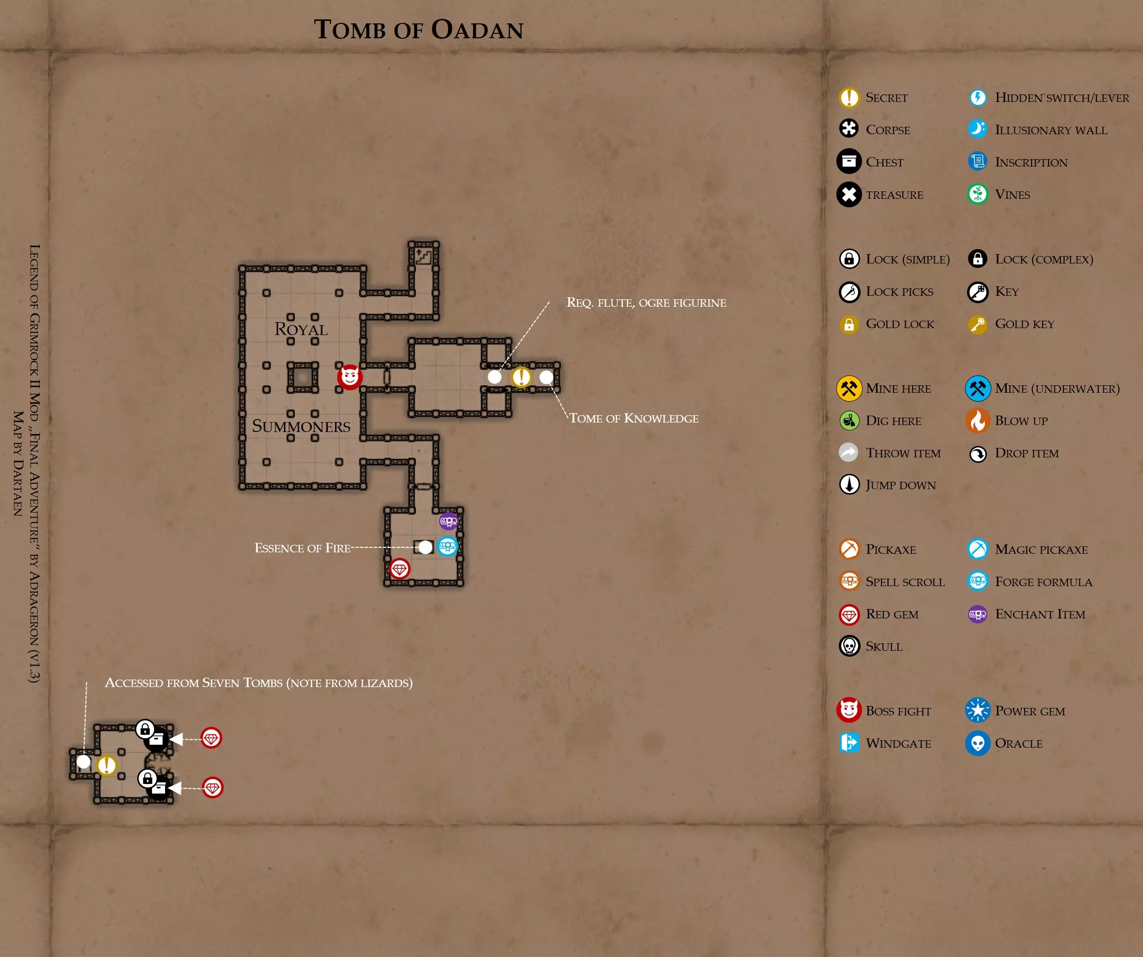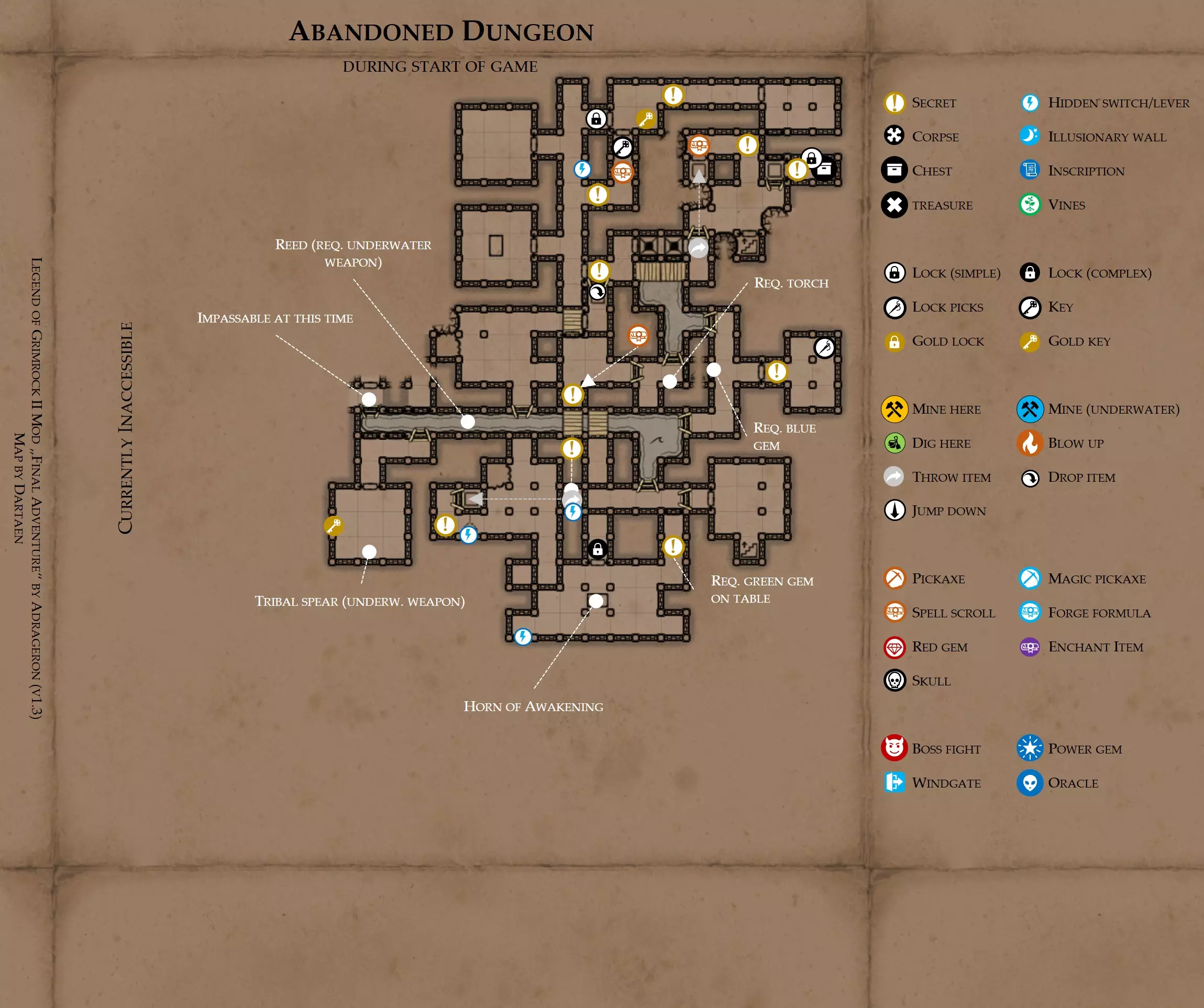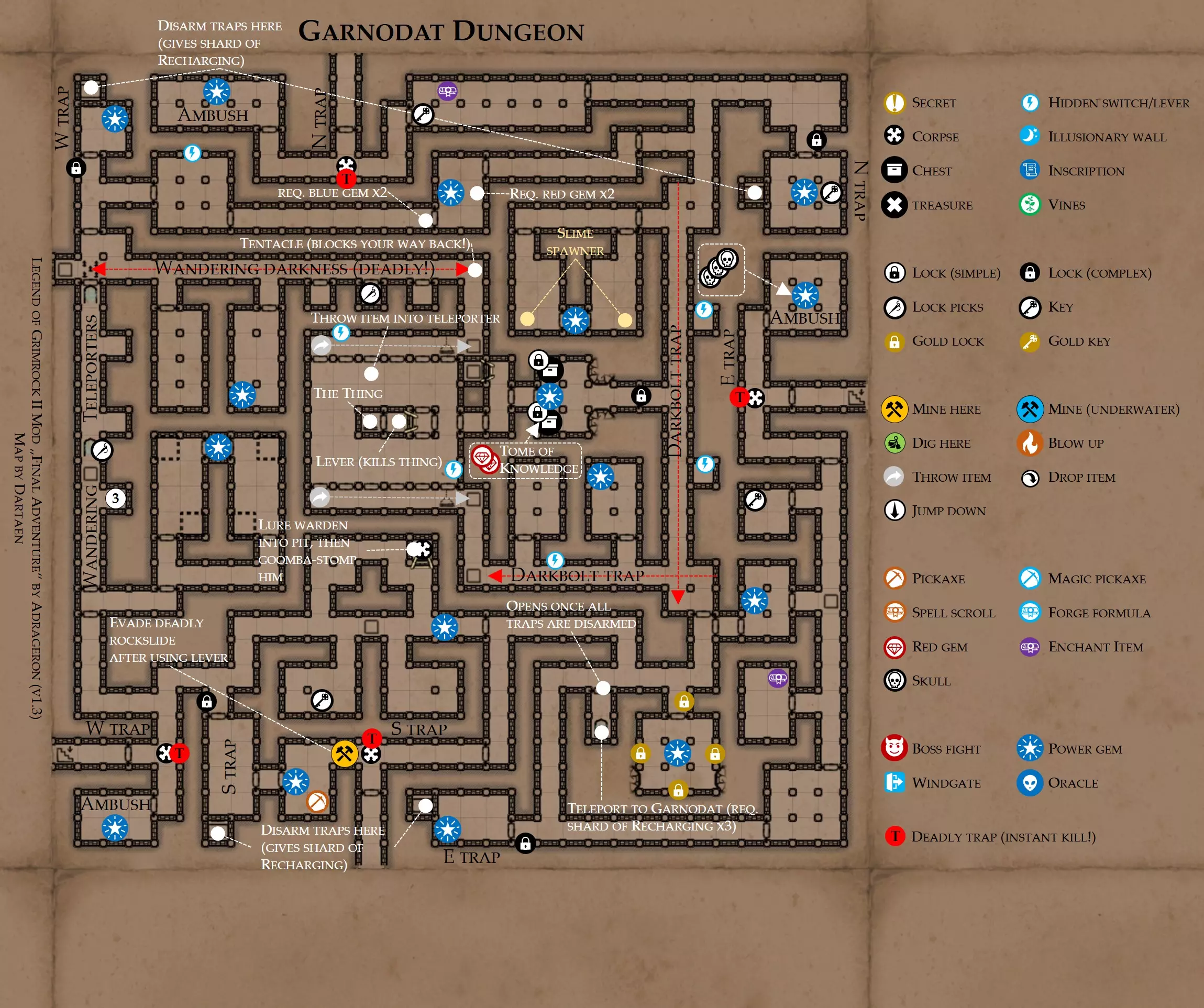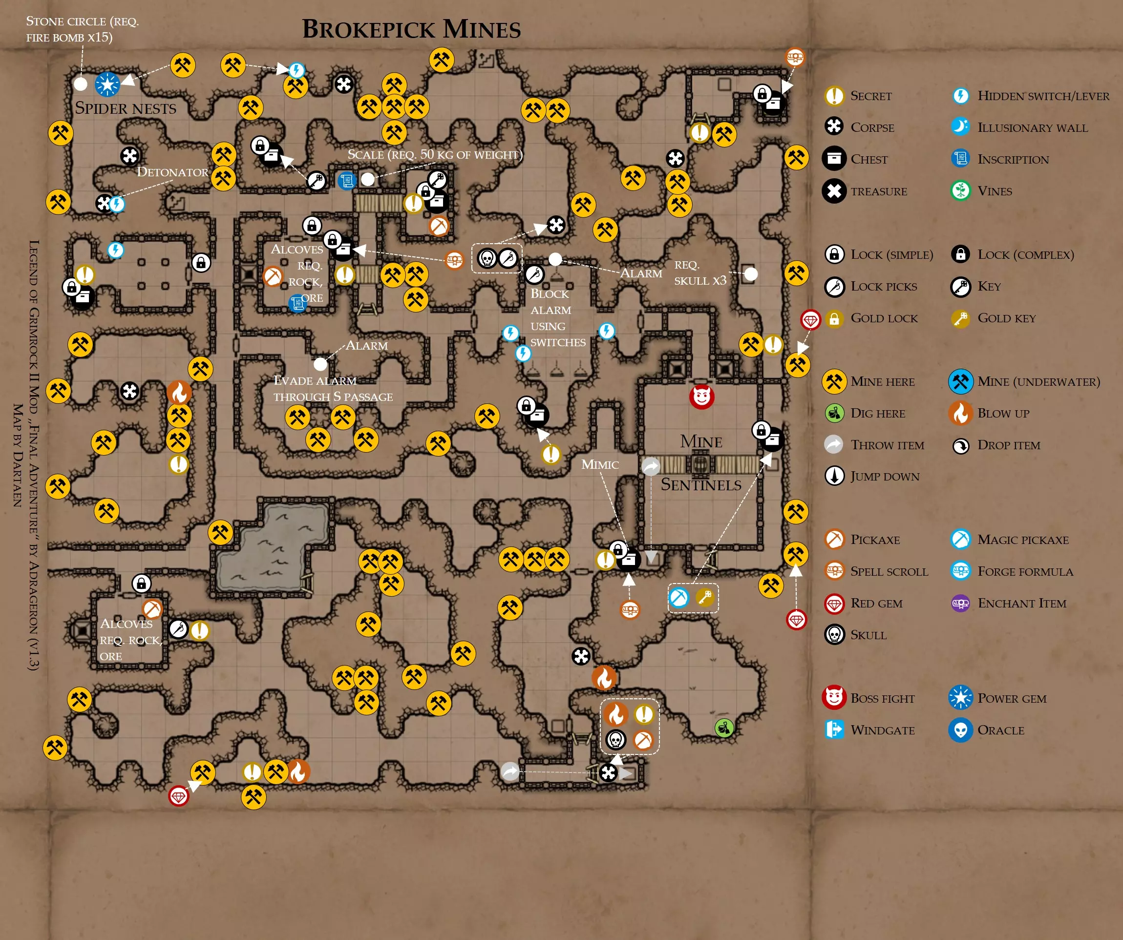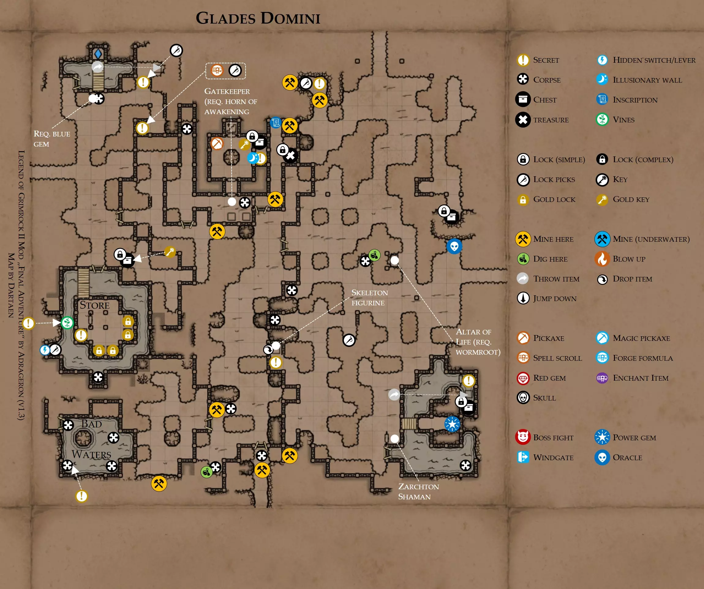《魔岩山传说2》模组“最终冒险”(版本1.3)攻略与策略指南(含地图) 通用提示 关于本模组 “最终冒险”是Steam用户兼《魔岩山传说2》爱好者Adrageron制作的第三个模组(前两个为“失落之城”和“守护者”)。许多人(包括我在内)认为他的模组优于《魔岩山传说2》原版战役,因此我强烈推荐你也尝试一下这些模组。 与原版游戏相比的新概念和改动 本模组包含一些《魔岩山传说2》原版中没有的独特概念。部分现有概念也进行了重大改动。 分数与成就:完成游戏后会获得分数,同时还有多项成就可供解锁。难度越高、完成速度越快,获得的分数就越高。学习法术卷轴:角色必须先从法术卷轴中学习法术才能施展,因此必须先找到(或购买)卷轴。学习时卷轴会被消耗,所以每个角色需要一份卷轴。部分法术现在仅特定职业可学习。 烹饪食物:所有食物必须先在烹饪工具中烹饪后才能安全食用。像海龟、战狼等怪物只会掉落生食材。 采矿与爆破:可以使用镐头破坏岩石和部分墙壁,使用燃烧瓶引爆塌方。 物品打造:可以使用锻造配方和打造材料打造并升级物品(包括整套装备)。 物品附魔:可以使用物品附魔卷轴强化物品,例如为武器提升伤害,为盔甲增强防护,或加快法杖的冷却速度。 货币与商人:你可以用美元(纸币)从商人处购买装备,也可以出售不再需要的物品换取美元,美元可通过游戏中的战利品获取。和原版游戏一样,你也可以使用金钥匙开启特定的宝藏。 改进的 firearms:所有 firearms 伤害提升,且现在会从敏捷属性获得额外伤害加成。 重做的技能与特性选择。 新的法术、增益效果和负面状态。 新的和重新平衡的角色职业。 新的食物、饮品和药水配方。 新物品,包括新的套装及套装加成。 新的和重做的怪物,大多数比原版游戏显著更难。角色创建时需注意事项 部分高阶法术仅特定职业可施展。若条件允许,至少培养一名能施展自然系和奥术系法术的角色。神圣系法术虽有帮助,但并非必需。 即使没有施法者也能通关游戏,因为你会找到一些可施展这些法术的遗物。不过,这些遗物每使用几次就需用充能碎片进行充能。 若你在较高难度下游玩,后期怪物造成的伤害极高,护甲几乎失去作用。此时,极高的闪避率是更好的选择,因此不要吝啬前线战士的敏捷属性。游戏过程中需要注意的事项 部分游戏后期的敌人非常强大,因此尽量将最强力的增益道具留到后期使用(如治愈水晶碎片、 rage potions、 Force traps、冰霜炸弹等)。 游戏内所有商店会在每周第7天的午夜刷新随机物品库存。如果对新物品不满意,可以存档后重新加载。 遇到以下物品打折时务必购买:蜥蜴串(至少需要一个来解锁某个秘密,最好买两个以便尽早获取)和palenuts(用于为装备附加闪避 enchantment)。 如果可能,为每个魔法学派(通用、神圣、自然和奥术)保留一张法术卷轴,不要学习它们。在燃烧沙地下方的七座古墓中解谜时会需要这些卷轴(之后可以再学习)。否则,你就必须从商人或图书馆购买缺失的卷轴。 你需要镐来开采(即击碎)岩石,需要开锁器来打开上锁的箱子和铁锁。游戏过程中你会找到一些,但要敲碎每块石头、掠夺每个箱子,就需要购买一些。你可以在加诺达特用蓝宝石购买开锁器,在芝士堡用美元购买。镐可以在加诺达特或地下商店以每把蓝宝石的价格购买。地下商店还提供魔法镐,售价为绿宝石,其耐用度是普通镐的三倍,且可在水下使用。 你可以在地下商店购买一本提升采矿技能的书,以及另一本能让你的燃烧瓶清除塌方的书。牧人小村有一本提升烹饪技能的书。一旦你获得了【复杂开锁】特性(该特性允许你使用2-4根开锁器打开大多数锁),开始保存每种类型的钥匙(黄铜钥匙、骷髅钥匙、华丽钥匙等)。你在金字塔的某个谜题中会需要这些钥匙。 如果你计划出售多余物品换取金钱,建议事先在【芝士汉堡镇】购买【交易的艺术】卷轴。花费500金币购买后,你出售物品的价格将提高约15%。 你会找到数量有限的【物品附魔】卷轴(以及【次级物品附魔】卷轴)。这些卷轴非常强大,但使用后会消耗,且每件物品只能附魔一次。因此,在找到游戏末期前你能使用的最强大装备之前,不要使用它们。当你到达水晶湖时,你还能在那里获得一本【附魔强化宝典】,它可以提升你的附魔威力。 完成游戏的方式: 1. 为贝雷斯找到所有力量宝石和元素精华。他会在起始位置附近开启一个传送门,将你送回冒险者公会。这种方式可能会让你错过模组的大部分后期内容,而且结局也有些平淡,所以除非你在进行速通,否则不推荐这种做法。 2. 使用【毁灭之杖】(在乌尔霍尔德地牢中找到)、16颗力量宝石和【平衡精华】完全修复【外堡】。这样你不会错过游戏的后期部分,但也不会触发 boss 战。 3.在为贝莱思找到力量宝石和精华后,与活石守望者结盟,从加诺达特地牢获取新的力量宝石,重新创造元素精华,并在贝莱思的住处将其击杀。本攻略将按照此流程进行。 地图 - 游戏开始 此处行动指南 穿过传送门前往湿地,开始你的游戏。 你当前的目标是找到雇佣你的法师贝莱思。他位于东边的加诺达特城堡。要打开通往加诺达特的道路,你需要觉醒号角,它被锁在下方的废弃地牢中。 在湿地,你必须先找到铁锁的钥匙,这样才能进入下方的废弃地牢。这样你就能拿到湿地南部的头骨钥匙,这把钥匙是获取
