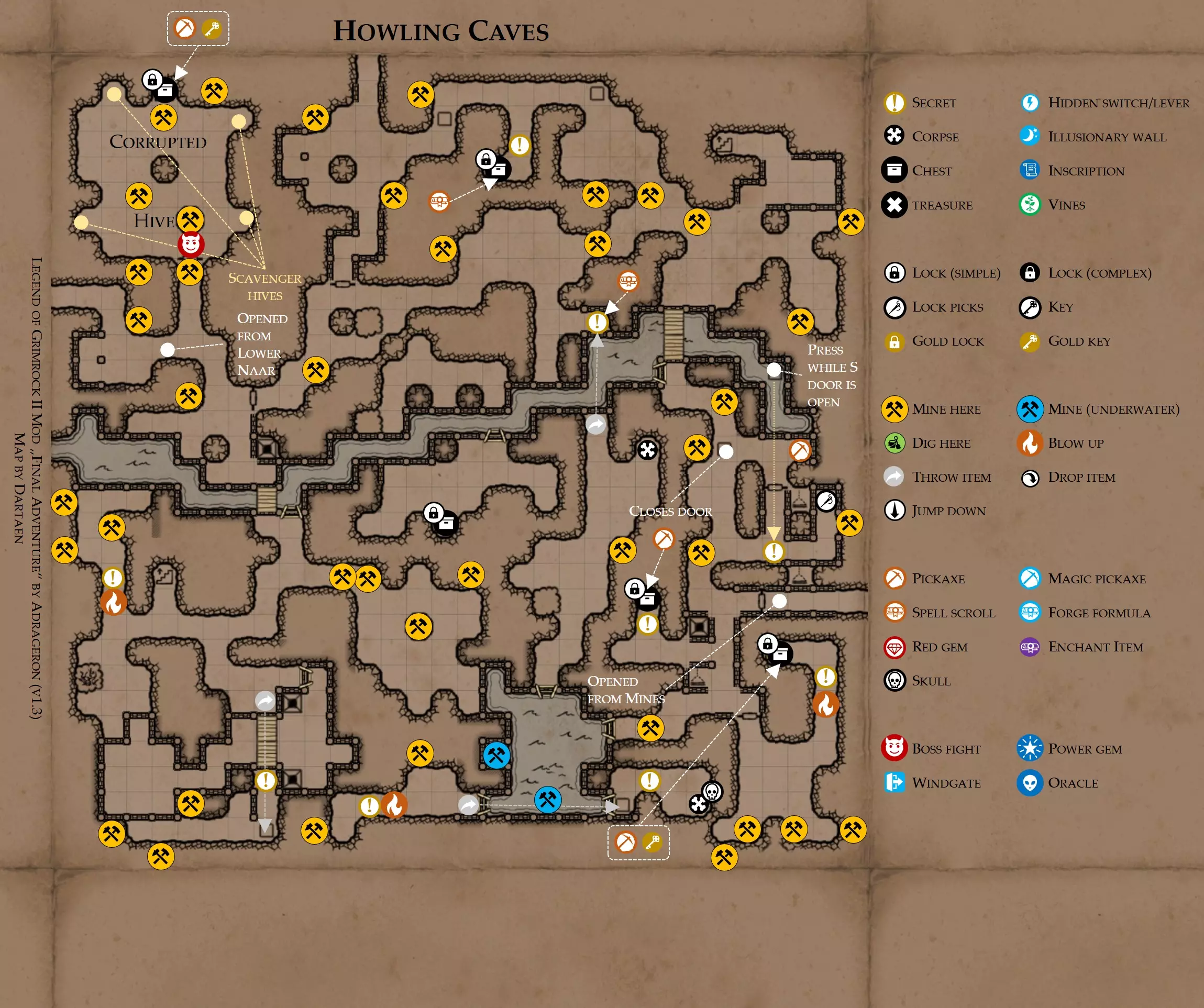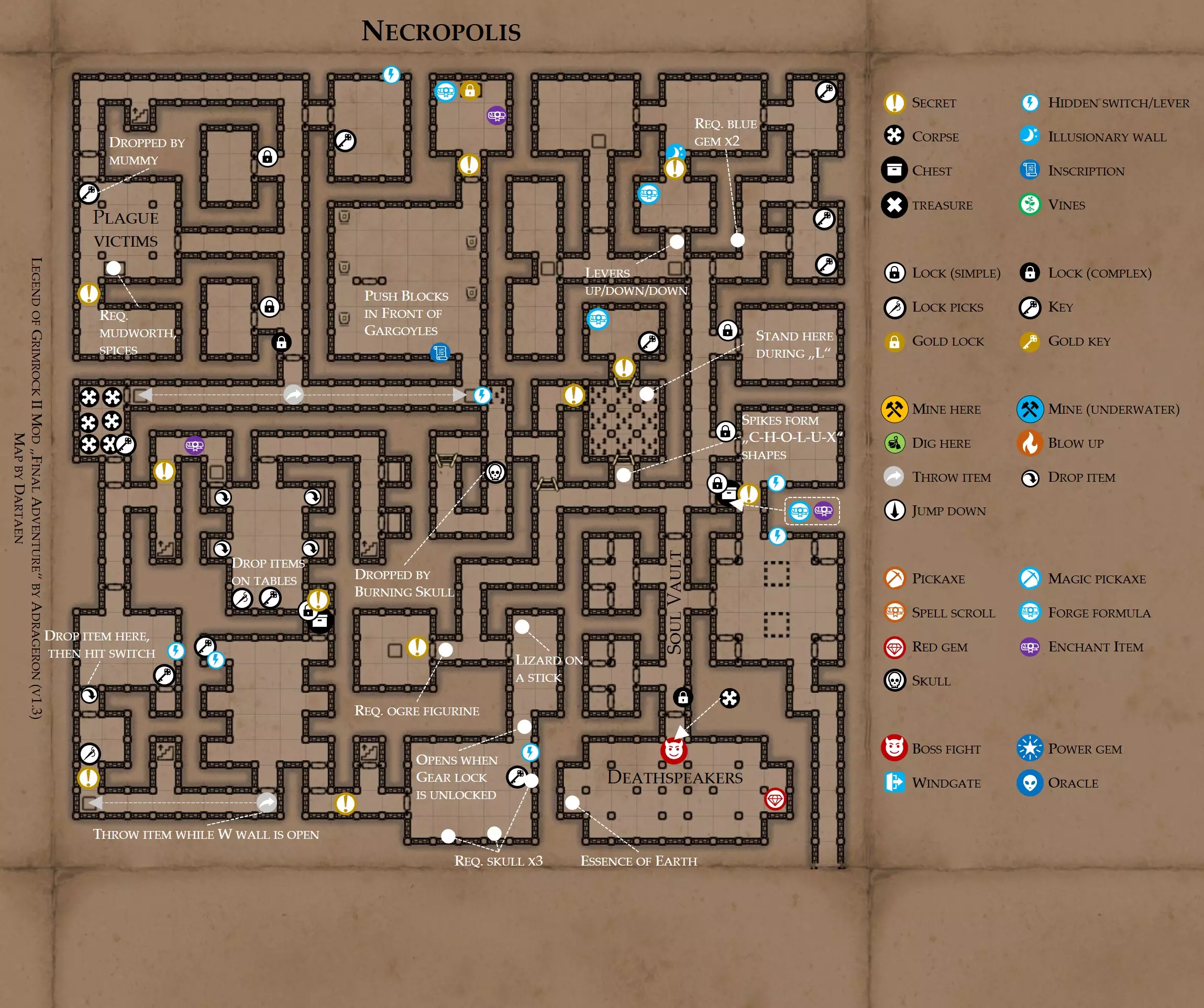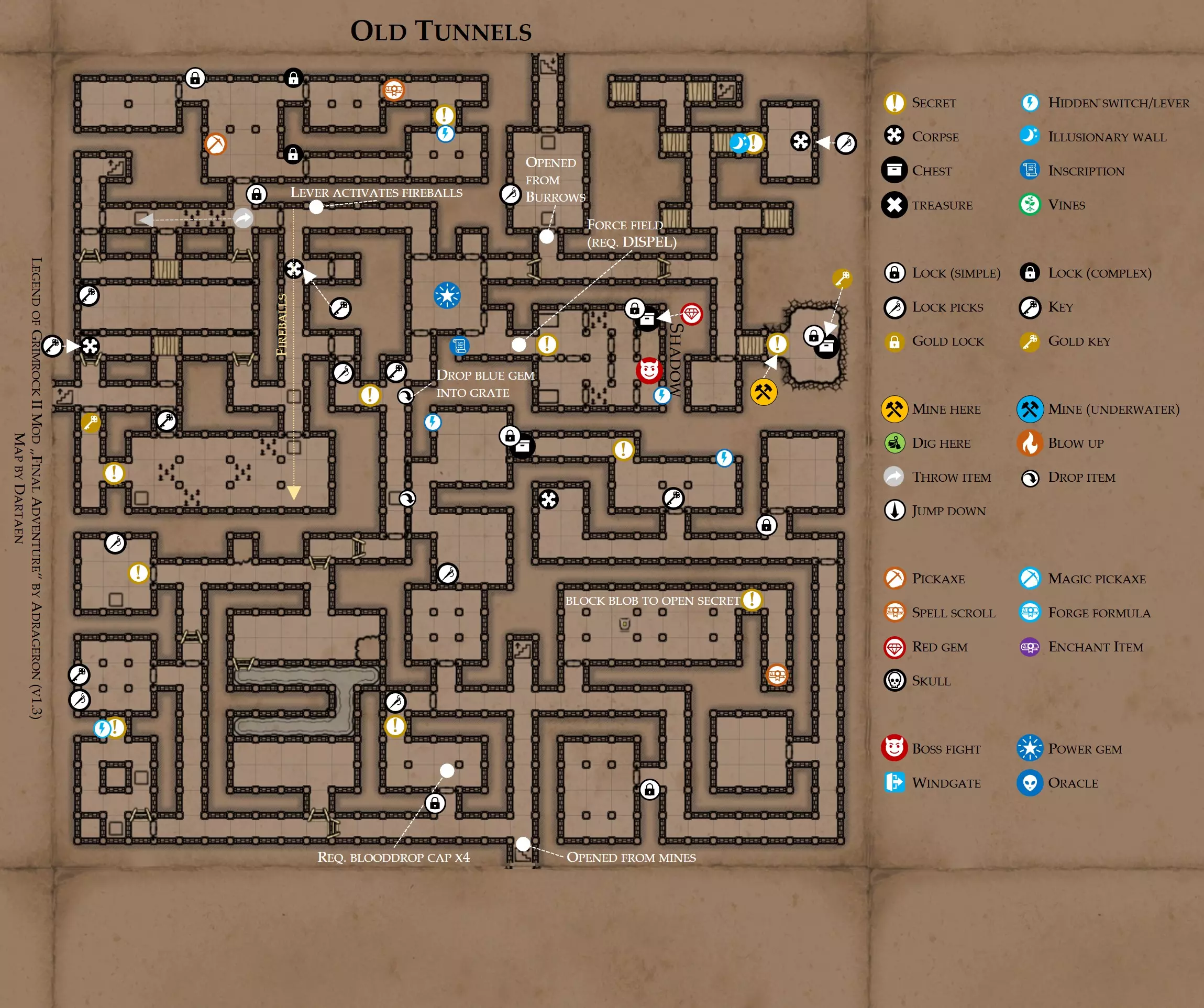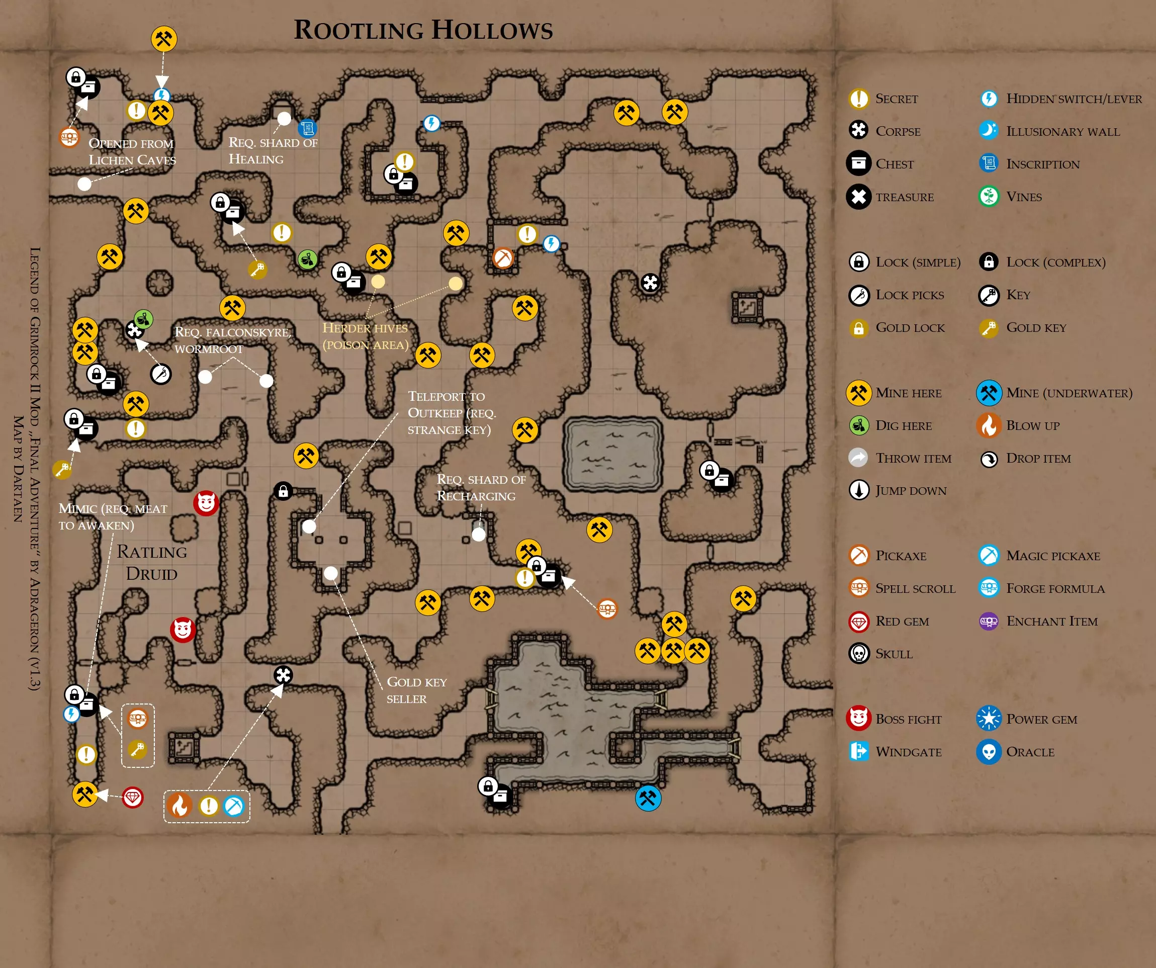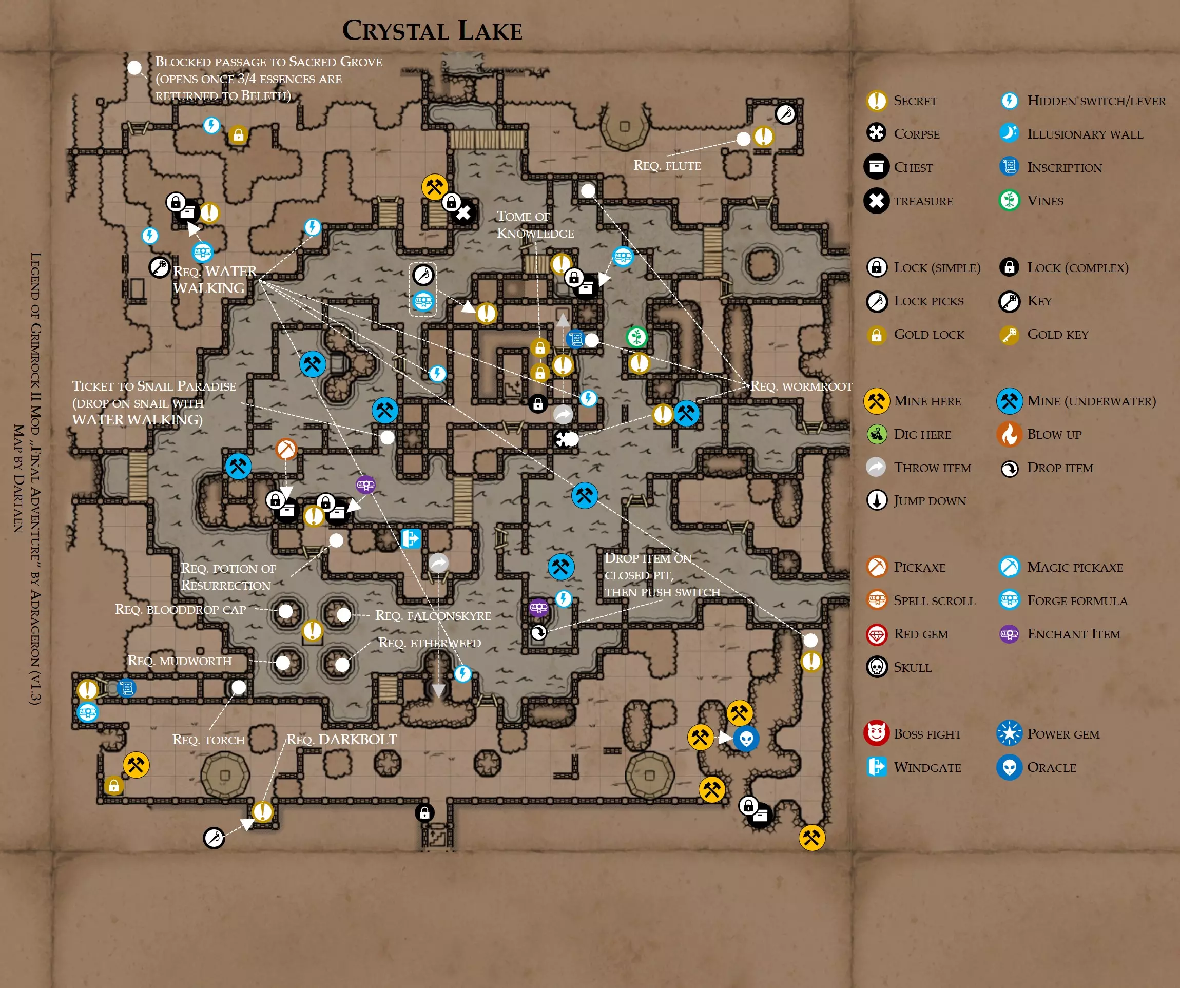 《魔岩山传说2》模组“最终冒险”(版本1.3)攻略与策略指南(含地图) 通用提示 关于本模组 “最终冒险”是Steam用户兼《魔岩山传说2》爱好者Adrageron制作的第三个模组(前两个为“失落之城”和“守护者”)。许多人(包括我在内)认为他的模组优于《魔岩山传说2》原版战役,因此我强烈推荐你也尝试一下这些模组。 与原版游戏相比的新概念和改动 本模组包含一些《魔岩山传说2》原版中没有的独特概念。部分现有概念也进行了重大改动。 分数与成就:完成游戏后会获得分数,同时还有多项成就可供解锁。难度越高、完成速度越快,获得的分数就越高。学习法术卷轴:角色必须先从法术卷轴中学习法术才能施展,因此必须先找到(或购买)卷轴。学习时卷轴会被消耗,所以每个角色需要一份卷轴。部分法术现在仅特定职业可学习。 烹饪食物:所有食物必须先在烹饪工具中烹饪后才能安全食用。像海龟、战狼等怪物只会掉落生食材。 采矿与爆破:可以使用镐头破坏岩石和部分墙壁,使用燃烧瓶引爆塌方。 物品打造:可以使用锻造配方和打造材料打造并升级物品(包括整套装备)。 物品附魔:可以使用物品附魔卷轴强化物品,例如为武器提升伤害,为盔甲增强防护,或加快法杖的冷却速度。 货币与商人:你可以用美元(纸币)从商人处购买装备,也可以出售不再需要的物品换取美元,美元可通过游戏中的战利品获取。和原版游戏一样,你也可以使用金钥匙开启特定的宝藏。 改进的 firearms:所有 firearms 伤害提升,且现在会从敏捷属性获得额外伤害加成。 重做的技能与特性选择。 新的法术、增益效果和负面状态。 新的和重新平衡的角色职业。 新的食物、饮品和药水配方。 新物品,包括新的套装及套装加成。 新的和重做的怪物,大多数比原版游戏显著更难。角色创建时需注意事项 部分高阶法术仅特定职业可施展。若条件允许,至少培养一名能施展自然系和奥术系法术的角色。神圣系法术虽有帮助,但并非必需。 即使没有施法者也能通关游戏,因为你会找到一些可施展这些法术的遗物。不过,这些遗物每使用几次就需用充能碎片进行充能。 若你在较高难度下游玩,后期怪物造成的伤害极高,护甲几乎失去作用。此时,极高的闪避率是更好的选择,因此不要吝啬前线战士的敏捷属性。游戏过程中需要注意的事项 部分游戏后期的敌人非常强大,因此尽量将最强力的增益道具留到后期使用(如治愈水晶碎片、 rage potions、 Force traps、冰霜炸弹等)。 游戏内所有商店会在每周第7天的午夜刷新随机物品库存。如果对新物品不满意,可以存档后重新加载。 遇到以下物品打折时务必购买:蜥蜴串(至少需要一个来解锁某个秘密,最好买两个以便尽早获取)和palenuts(用于为装备附加闪避 enchantment)。 如果可能,为每个魔法学派(通用、神圣、自然和奥术)保留一张法术卷轴,不要学习它们。在燃烧沙地下方的七座古墓中解谜时会需要这些卷轴(之后可以再学习)。否则,你就必须从商人或图书馆购买缺失的卷轴。 你需要镐来开采(即击碎)岩石,需要开锁器来打开上锁的箱子和铁锁。游戏过程中你会找到一些,但要敲碎每块石头、掠夺每个箱子,就需要购买一些。你可以在加诺达特用蓝宝石购买开锁器,在芝士堡用美元购买。镐可以在加诺达特或地下商店以每把蓝宝石的价格购买。地下商店还提供魔法镐,售价为绿宝石,其耐用度是普通镐的三倍,且可在水下使用。 你可以在地下商店购买一本提升采矿技能的书,以及另一本能让你的燃烧瓶清除塌方的书。牧人小村有一本提升烹饪技能的书。一旦你获得了【复杂开锁】特性(该特性允许你使用2-4根开锁器打开大多数锁),开始保存每种类型的钥匙(黄铜钥匙、骷髅钥匙、华丽钥匙等)。你在金字塔的某个谜题中会需要这些钥匙。 如果你计划出售多余物品换取金钱,建议事先在【芝士汉堡镇】购买【交易的艺术】卷轴。花费500金币购买后,你出售物品的价格将提高约15%。 你会找到数量有限的【物品附魔】卷轴(以及【次级物品附魔】卷轴)。这些卷轴非常强大,但使用后会消耗,且每件物品只能附魔一次。因此,在找到游戏末期前你能使用的最强大装备之前,不要使用它们。当你到达水晶湖时,你还能在那里获得一本【附魔强化宝典】,它可以提升你的附魔威力。 完成游戏的方式: 1. 为贝雷斯找到所有力量宝石和元素精华。他会在起始位置附近开启一个传送门,将你送回冒险者公会。这种方式可能会让你错过模组的大部分后期内容,而且结局也有些平淡,所以除非你在进行速通,否则不推荐这种做法。 2. 使用【毁灭之杖】(在乌尔霍尔德地牢中找到)、16颗力量宝石和【平衡精华】完全修复【外堡】。这样你不会错过游戏的后期部分,但也不会触发 boss 战。 3.在为贝莱思找到力量宝石和精华后,与活石守望者结盟,从加诺达特地牢获取新的力量宝石,重新创造元素精华,并在贝莱思的住处将其击杀。本攻略将按照此流程进行。 地图 - 游戏开始 此处行动指南 穿过传送门前往湿地,开始你的游戏。 你当前的目标是找到雇佣你的法师贝莱思。他位于东边的加诺达特城堡。要打开通往加诺达特的道路,你需要觉醒号角,它被锁在下方的废弃地牢中。 在湿地,你必须先找到铁锁的钥匙,这样才能进入下方的废弃地牢。这样你就能拿到湿地南部的头骨钥匙,这把钥匙是获取