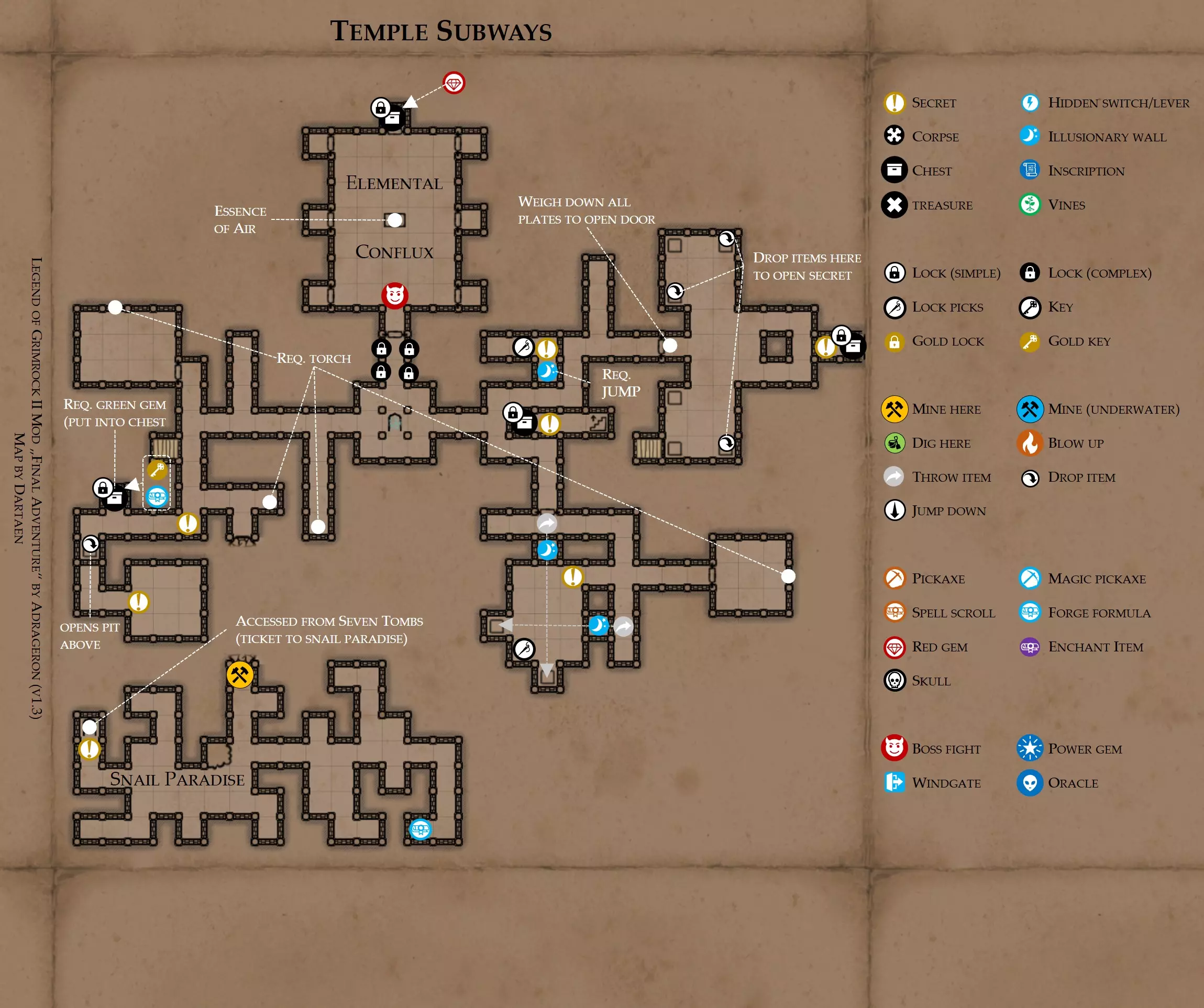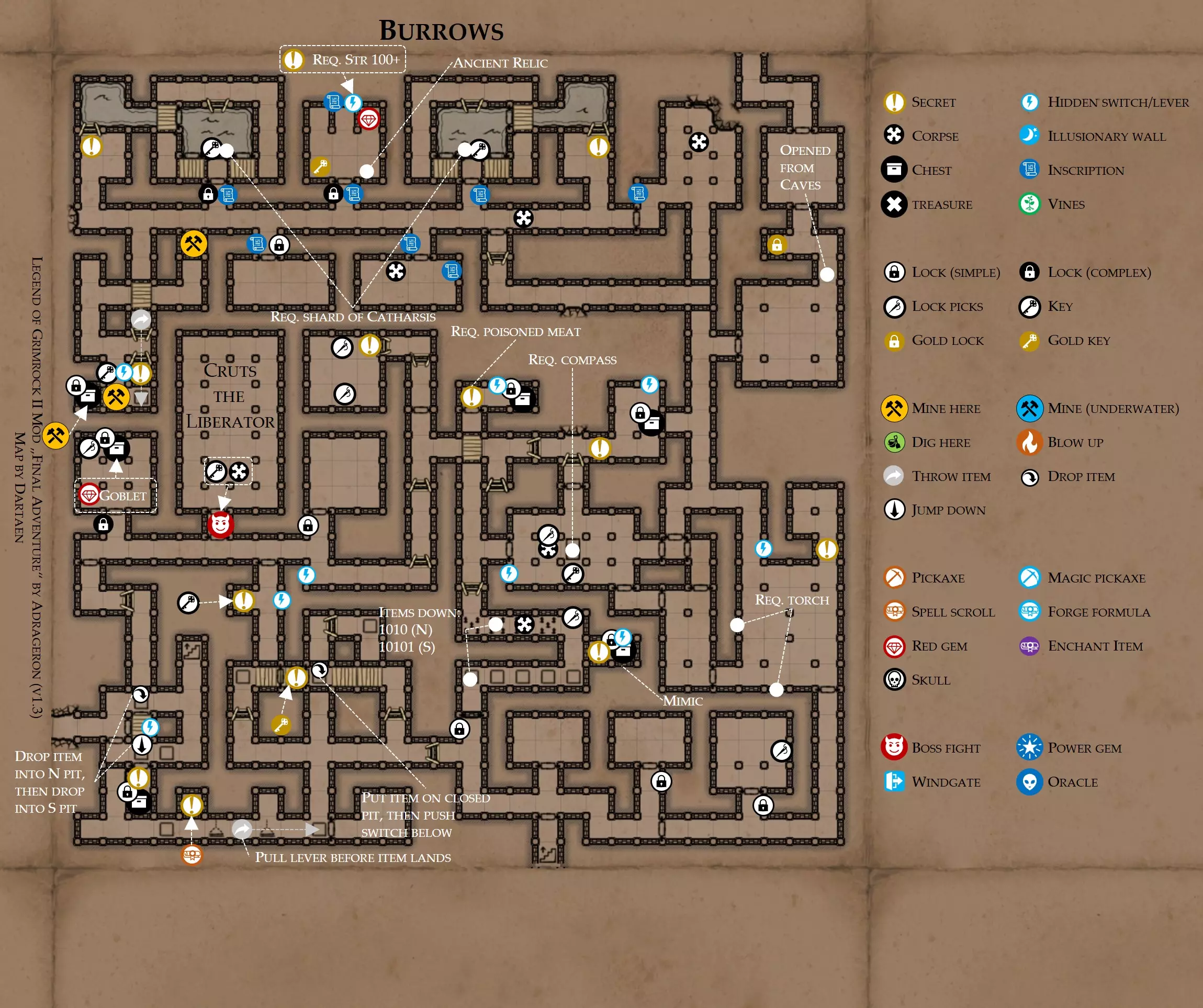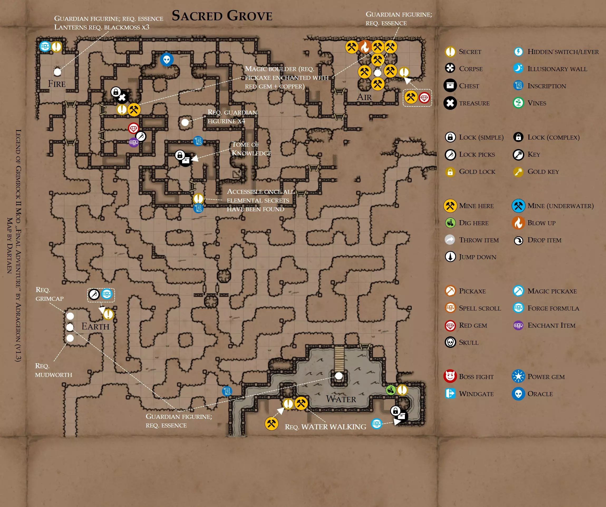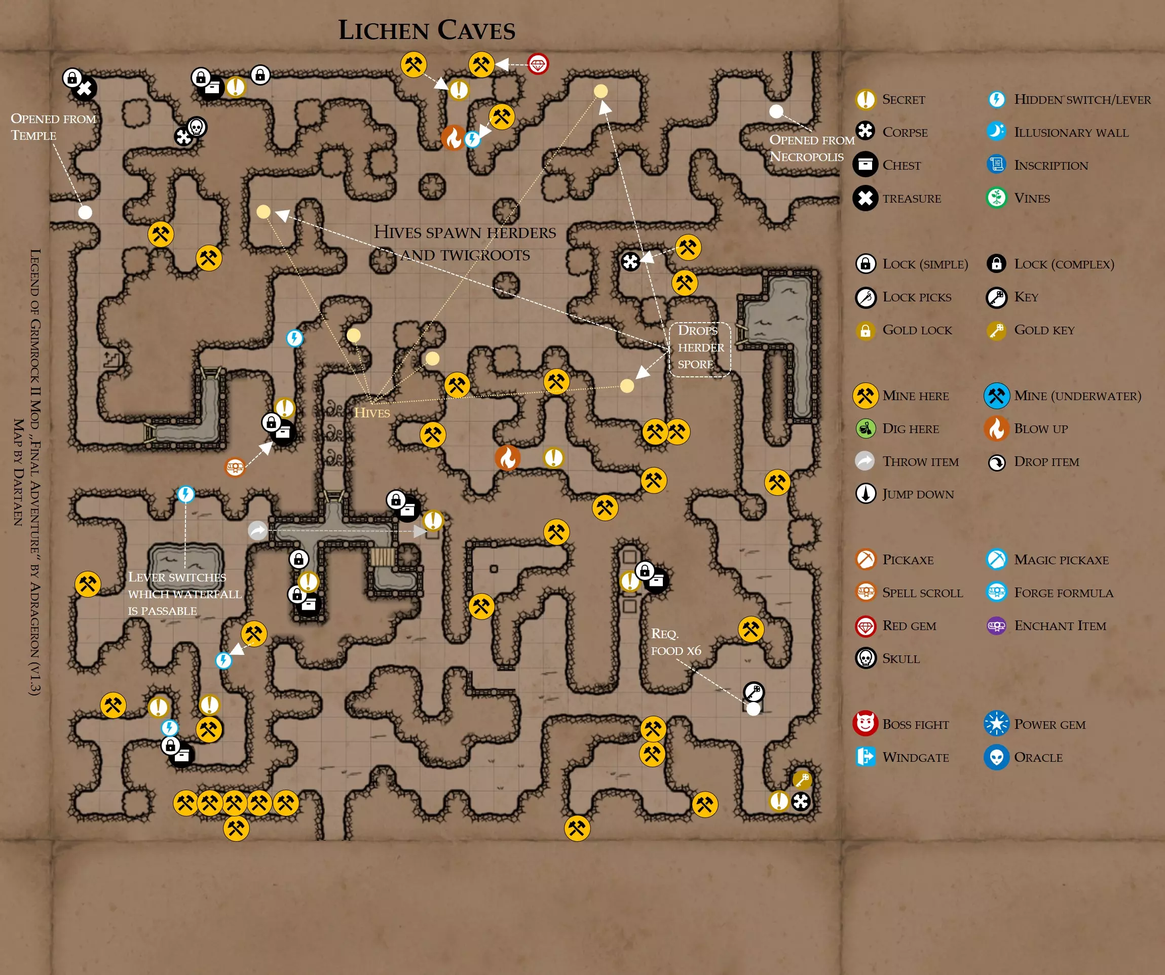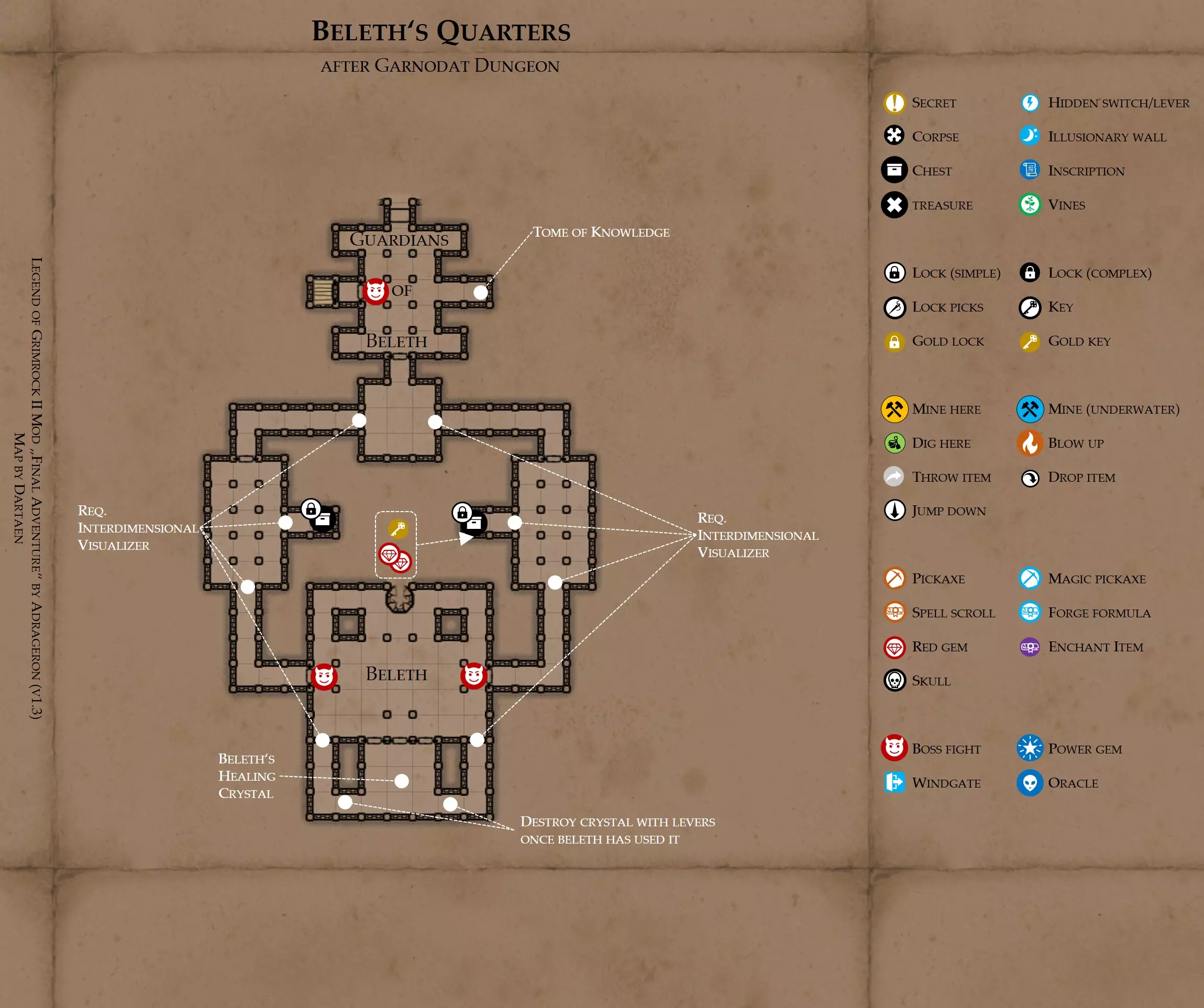 《魔岩山传说2》模组“最终冒险”(版本1.3)攻略与策略指南(含地图) 通用提示 关于本模组 “最终冒险”是Steam用户兼《魔岩山传说2》爱好者Adrageron制作的第三个模组(前两个为“失落之城”和“守护者”)。许多人(包括我在内)认为他的模组优于《魔岩山传说2》原版战役,因此我强烈推荐你也尝试一下这些模组。 与原版游戏相比的新概念和改动 本模组包含一些《魔岩山传说2》原版中没有的独特概念。部分现有概念也进行了重大改动。 分数与成就:完成游戏后会获得分数,同时还有多项成就可供解锁。难度越高、完成速度越快,获得的分数就越高。学习法术卷轴:角色必须先从法术卷轴中学习法术才能施展,因此必须先找到(或购买)卷轴。学习时卷轴会被消耗,所以每个角色需要一份卷轴。部分法术现在仅特定职业可学习。 烹饪食物:所有食物必须先在烹饪工具中烹饪后才能安全食用。像海龟、战狼等怪物只会掉落生食材。 采矿与爆破:可以使用镐头破坏岩石和部分墙壁,使用燃烧瓶引爆塌方。 物品打造:可以使用锻造配方和打造材料打造并升级物品(包括整套装备)。 物品附魔:可以使用物品附魔卷轴强化物品,例如为武器提升伤害,为盔甲增强防护,或加快法杖的冷却速度。 货币与商人:你可以用美元(纸币)从商人处购买装备,也可以出售不再需要的物品换取美元,美元可通过游戏中的战利品获取。和原版游戏一样,你也可以使用金钥匙开启特定的宝藏。 改进的 firearms:所有 firearms 伤害提升,且现在会从敏捷属性获得额外伤害加成。 重做的技能与特性选择。 新的法术、增益效果和负面状态。 新的和重新平衡的角色职业。 新的食物、饮品和药水配方。 新物品,包括新的套装及套装加成。 新的和重做的怪物,大多数比原版游戏显著更难。角色创建时需注意事项 部分高阶法术仅特定职业可施展。若条件允许,至少培养一名能施展自然系和奥术系法术的角色。神圣系法术虽有帮助,但并非必需。 即使没有施法者也能通关游戏,因为你会找到一些可施展这些法术的遗物。不过,这些遗物每使用几次就需用充能碎片进行充能。 若你在较高难度下游玩,后期怪物造成的伤害极高,护甲几乎失去作用。此时,极高的闪避率是更好的选择,因此不要吝啬前线战士的敏捷属性。游戏过程中需要注意的事项 部分游戏后期的敌人非常强大,因此尽量将最强力的增益道具留到后期使用(如治愈水晶碎片、 rage potions、 Force traps、冰霜炸弹等)。 游戏内所有商店会在每周第7天的午夜刷新随机物品库存。如果对新物品不满意,可以存档后重新加载。 遇到以下物品打折时务必购买:蜥蜴串(至少需要一个来解锁某个秘密,最好买两个以便尽早获取)和palenuts(用于为装备附加闪避 enchantment)。 如果可能,为每个魔法学派(通用、神圣、自然和奥术)保留一张法术卷轴,不要学习它们。在燃烧沙地下方的七座古墓中解谜时会需要这些卷轴(之后可以再学习)。否则,你就必须从商人或图书馆购买缺失的卷轴。 你需要镐来开采(即击碎)岩石,需要开锁器来打开上锁的箱子和铁锁。游戏过程中你会找到一些,但要敲碎每块石头、掠夺每个箱子,就需要购买一些。你可以在加诺达特用蓝宝石购买开锁器,在芝士堡用美元购买。镐可以在加诺达特或地下商店以每把蓝宝石的价格购买。地下商店还提供魔法镐,售价为绿宝石,其耐用度是普通镐的三倍,且可在水下使用。 你可以在地下商店购买一本提升采矿技能的书,以及另一本能让你的燃烧瓶清除塌方的书。牧人小村有一本提升烹饪技能的书。一旦你获得了【复杂开锁】特性(该特性允许你使用2-4根开锁器打开大多数锁),开始保存每种类型的钥匙(黄铜钥匙、骷髅钥匙、华丽钥匙等)。你在金字塔的某个谜题中会需要这些钥匙。 如果你计划出售多余物品换取金钱,建议事先在【芝士汉堡镇】购买【交易的艺术】卷轴。花费500金币购买后,你出售物品的价格将提高约15%。 你会找到数量有限的【物品附魔】卷轴(以及【次级物品附魔】卷轴)。这些卷轴非常强大,但使用后会消耗,且每件物品只能附魔一次。因此,在找到游戏末期前你能使用的最强大装备之前,不要使用它们。当你到达水晶湖时,你还能在那里获得一本【附魔强化宝典】,它可以提升你的附魔威力。 完成游戏的方式: 1. 为贝雷斯找到所有力量宝石和元素精华。他会在起始位置附近开启一个传送门,将你送回冒险者公会。这种方式可能会让你错过模组的大部分后期内容,而且结局也有些平淡,所以除非你在进行速通,否则不推荐这种做法。 2. 使用【毁灭之杖】(在乌尔霍尔德地牢中找到)、16颗力量宝石和【平衡精华】完全修复【外堡】。这样你不会错过游戏的后期部分,但也不会触发 boss 战。 3.在为贝莱思找到力量宝石和精华后,与活石守望者结盟,从加诺达特地牢获取新的力量宝石,重新创造元素精华,并在贝莱思的住处将其击杀。本攻略将按照此流程进行。 地图 - 游戏开始 此处行动指南 穿过传送门前往湿地,开始你的游戏。 你当前的目标是找到雇佣你的法师贝莱思。他位于东边的加诺达特城堡。要打开通往加诺达特的道路,你需要觉醒号角,它被锁在下方的废弃地牢中。 在湿地,你必须先找到铁锁的钥匙,这样才能进入下方的废弃地牢。这样你就能拿到湿地南部的头骨钥匙,这把钥匙是获取