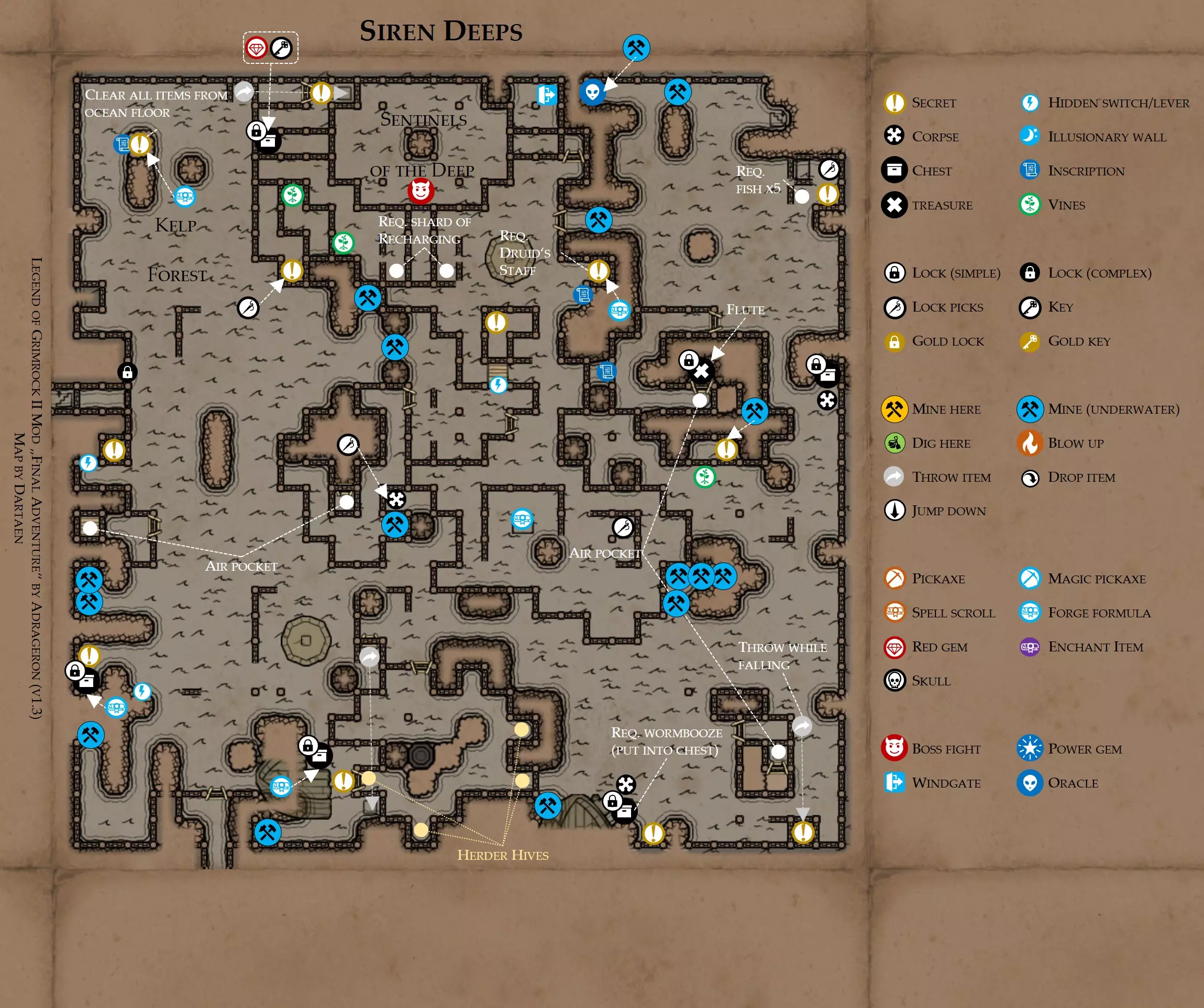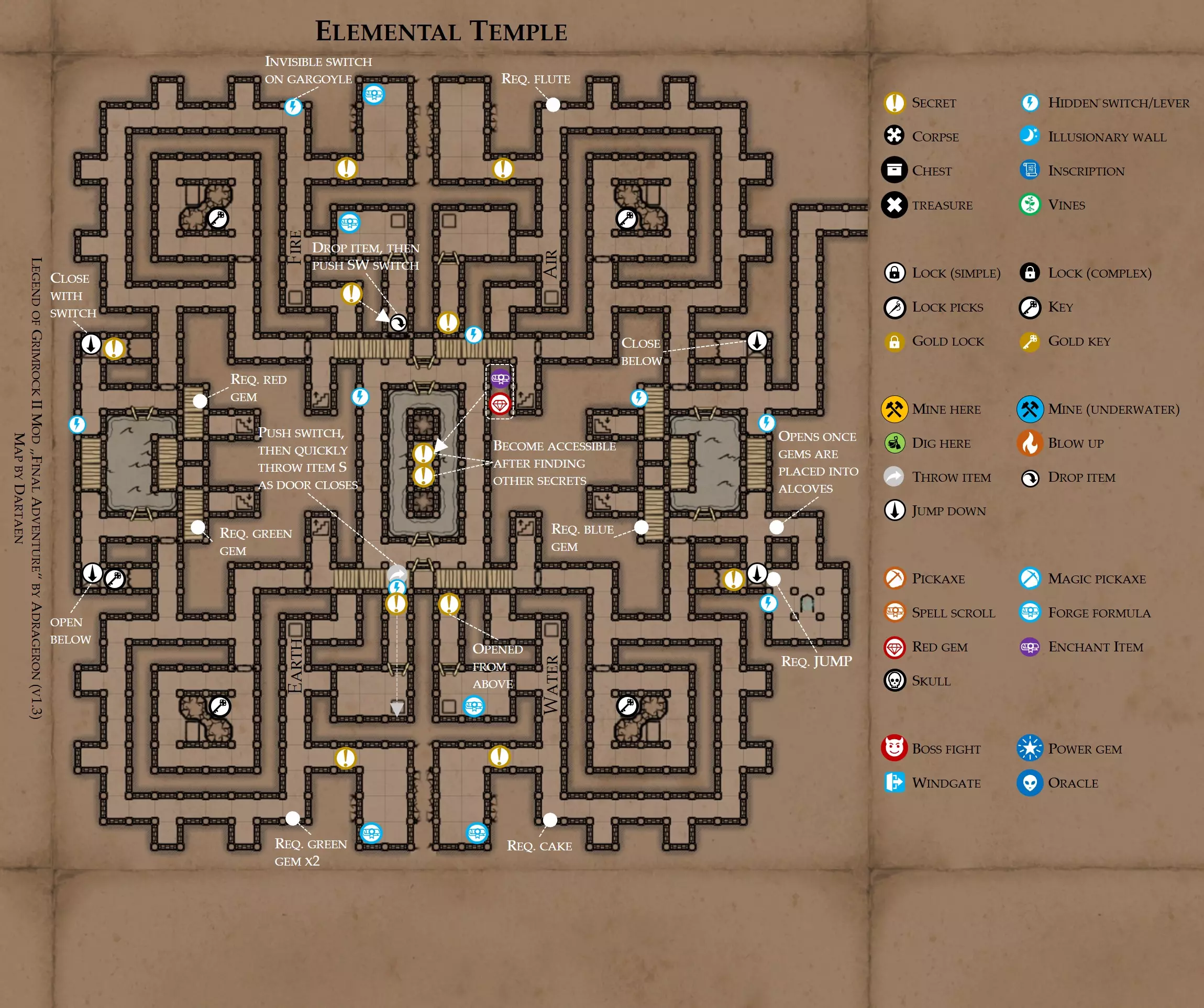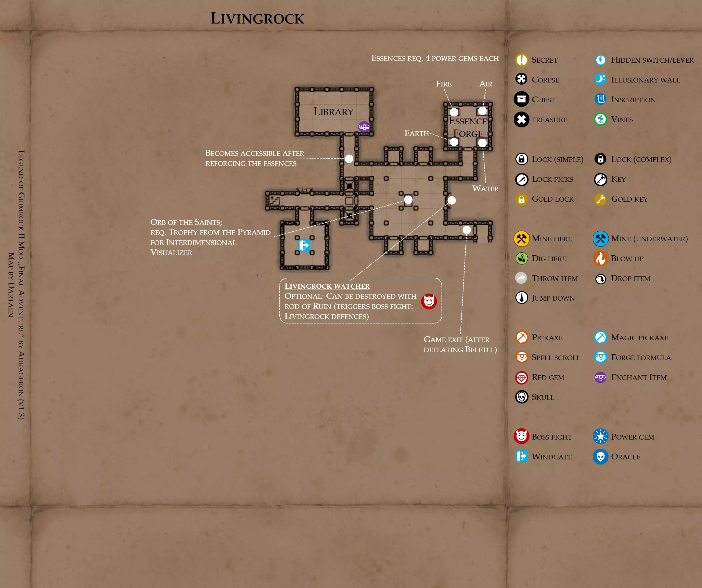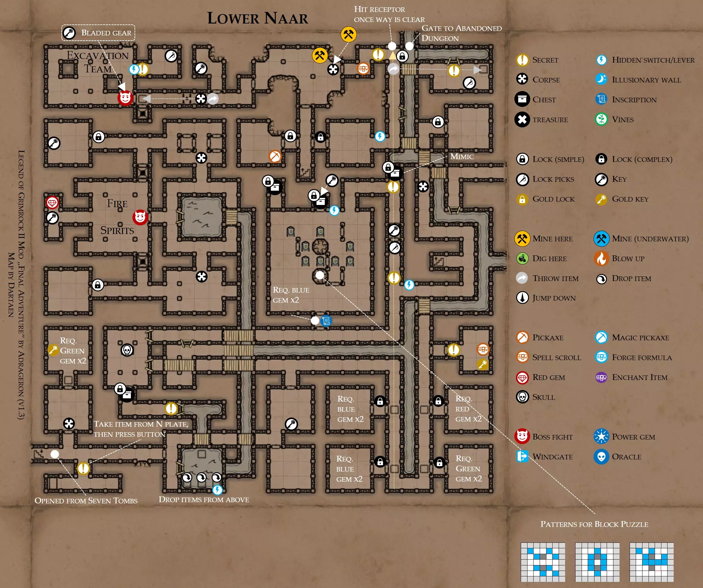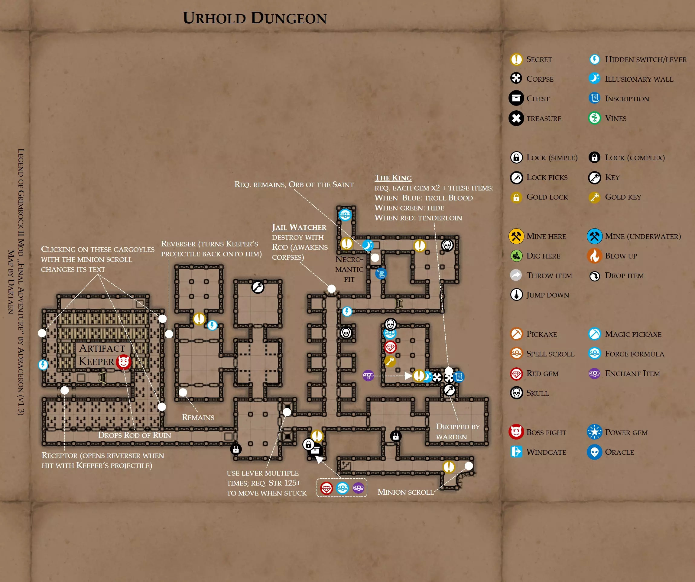 《魔岩山传说2》模组“最终冒险”(版本1.3)攻略与策略指南(含地图) 通用提示 关于本模组 “最终冒险”是Steam用户兼《魔岩山传说2》爱好者Adrageron制作的第三个模组(前两个为“失落之城”和“守护者”)。许多人(包括我在内)认为他的模组优于《魔岩山传说2》原版战役,因此我强烈推荐你也尝试一下这些模组。 与原版游戏相比的新概念和改动 本模组包含一些《魔岩山传说2》原版中没有的独特概念。部分现有概念也进行了重大改动。 分数与成就:完成游戏后会获得分数,同时还有多项成就可供解锁。难度越高、完成速度越快,获得的分数就越高。学习法术卷轴:角色必须先从法术卷轴中学习法术才能施展,因此必须先找到(或购买)卷轴。学习时卷轴会被消耗,所以每个角色需要一份卷轴。部分法术现在仅特定职业可学习。 烹饪食物:所有食物必须先在烹饪工具中烹饪后才能安全食用。像海龟、战狼等怪物只会掉落生食材。 采矿与爆破:可以使用镐头破坏岩石和部分墙壁,使用燃烧瓶引爆塌方。 物品打造:可以使用锻造配方和打造材料打造并升级物品(包括整套装备)。 物品附魔:可以使用物品附魔卷轴强化物品,例如为武器提升伤害,为盔甲增强防护,或加快法杖的冷却速度。 货币与商人:你可以用美元(纸币)从商人处购买装备,也可以出售不再需要的物品换取美元,美元可通过游戏中的战利品获取。和原版游戏一样,你也可以使用金钥匙开启特定的宝藏。 改进的 firearms:所有 firearms 伤害提升,且现在会从敏捷属性获得额外伤害加成。 重做的技能与特性选择。 新的法术、增益效果和负面状态。 新的和重新平衡的角色职业。 新的食物、饮品和药水配方。 新物品,包括新的套装及套装加成。 新的和重做的怪物,大多数比原版游戏显著更难。角色创建时需注意事项 部分高阶法术仅特定职业可施展。若条件允许,至少培养一名能施展自然系和奥术系法术的角色。神圣系法术虽有帮助,但并非必需。 即使没有施法者也能通关游戏,因为你会找到一些可施展这些法术的遗物。不过,这些遗物每使用几次就需用充能碎片进行充能。 若你在较高难度下游玩,后期怪物造成的伤害极高,护甲几乎失去作用。此时,极高的闪避率是更好的选择,因此不要吝啬前线战士的敏捷属性。游戏过程中需要注意的事项 部分游戏后期的敌人非常强大,因此尽量将最强力的增益道具留到后期使用(如治愈水晶碎片、 rage potions、 Force traps、冰霜炸弹等)。 游戏内所有商店会在每周第7天的午夜刷新随机物品库存。如果对新物品不满意,可以存档后重新加载。 遇到以下物品打折时务必购买:蜥蜴串(至少需要一个来解锁某个秘密,最好买两个以便尽早获取)和palenuts(用于为装备附加闪避 enchantment)。 如果可能,为每个魔法学派(通用、神圣、自然和奥术)保留一张法术卷轴,不要学习它们。在燃烧沙地下方的七座古墓中解谜时会需要这些卷轴(之后可以再学习)。否则,你就必须从商人或图书馆购买缺失的卷轴。 你需要镐来开采(即击碎)岩石,需要开锁器来打开上锁的箱子和铁锁。游戏过程中你会找到一些,但要敲碎每块石头、掠夺每个箱子,就需要购买一些。你可以在加诺达特用蓝宝石购买开锁器,在芝士堡用美元购买。镐可以在加诺达特或地下商店以每把蓝宝石的价格购买。地下商店还提供魔法镐,售价为绿宝石,其耐用度是普通镐的三倍,且可在水下使用。 你可以在地下商店购买一本提升采矿技能的书,以及另一本能让你的燃烧瓶清除塌方的书。牧人小村有一本提升烹饪技能的书。一旦你获得了【复杂开锁】特性(该特性允许你使用2-4根开锁器打开大多数锁),开始保存每种类型的钥匙(黄铜钥匙、骷髅钥匙、华丽钥匙等)。你在金字塔的某个谜题中会需要这些钥匙。 如果你计划出售多余物品换取金钱,建议事先在【芝士汉堡镇】购买【交易的艺术】卷轴。花费500金币购买后,你出售物品的价格将提高约15%。 你会找到数量有限的【物品附魔】卷轴(以及【次级物品附魔】卷轴)。这些卷轴非常强大,但使用后会消耗,且每件物品只能附魔一次。因此,在找到游戏末期前你能使用的最强大装备之前,不要使用它们。当你到达水晶湖时,你还能在那里获得一本【附魔强化宝典】,它可以提升你的附魔威力。 完成游戏的方式: 1. 为贝雷斯找到所有力量宝石和元素精华。他会在起始位置附近开启一个传送门,将你送回冒险者公会。这种方式可能会让你错过模组的大部分后期内容,而且结局也有些平淡,所以除非你在进行速通,否则不推荐这种做法。 2. 使用【毁灭之杖】(在乌尔霍尔德地牢中找到)、16颗力量宝石和【平衡精华】完全修复【外堡】。这样你不会错过游戏的后期部分,但也不会触发 boss 战。 3.在为贝莱思找到力量宝石和精华后,与活石守望者结盟,从加诺达特地牢获取新的力量宝石,重新创造元素精华,并在贝莱思的住处将其击杀。本攻略将按照此流程进行。 地图 - 游戏开始 此处行动指南 穿过传送门前往湿地,开始你的游戏。 你当前的目标是找到雇佣你的法师贝莱思。他位于东边的加诺达特城堡。要打开通往加诺达特的道路,你需要觉醒号角,它被锁在下方的废弃地牢中。 在湿地,你必须先找到铁锁的钥匙,这样才能进入下方的废弃地牢。这样你就能拿到湿地南部的头骨钥匙,这把钥匙是获取