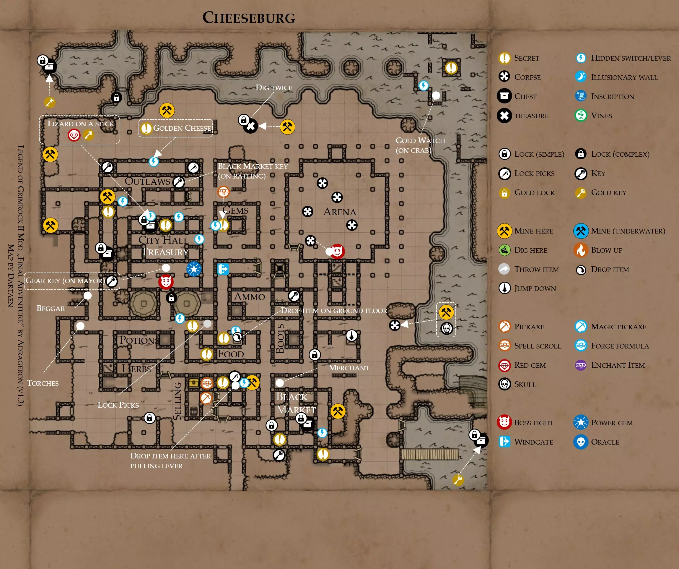 提示 若你想从格鲁肯斯皮尔手中夺取他的力量宝石,需向地图西北角的石圈中投入15个火焰炸弹,然后拉动附近的拉杆。你可以通过炼金术制作新的火焰炸弹,也可以在他自己的地下商店购买。 部分通道由守卫看守,这些守卫除非受到攻击或附近警报被触发,否则不会表现出敌意。最好逐个攻击它们,这样你就不必同时与两个守卫战斗。 地图 - 芝士堡与洞穴 此处行动指南 游戏中的大多数商人都位于芝士堡。在这里,你可以用美元购买食物、药水、宝石、火把和开锁器。和所有商人一样,他们会在每周开始时刷新(随机)库存。 芝士堡的市长拥有一颗力量宝石,只有当你为他完成一系列任务后,他才会交出宝石。你可以通过赢得八场难度递增的战斗成为芝士汉堡竞技场的冠军。击败每一层都会奖励你金钱(美元)和宝石,最终战斗还会奖励你一件第五力量套装的物品。如果你是第一次踏入芝士汉堡竞技场,你的实力可能不足以击败前四层以上的战斗。把最终战斗留到后期,它可能是游戏中最难的战斗。 芝士汉堡 关于这个区域 这座城市有多层结构。你可以在地面层、上层以及地下找到鼠人商人。 不要撬黑市的锁。你会在某个不法之徒身上找到钥匙。 你必须进行捐赠才能进入市政厅。在弄坏镇长的东西后,你必须先支付赔偿金,才能获得与他正式会面的机会。之后,你需要完成他的任务(找到他的金表、消灭不法之徒、击败地下洞穴中的 boss),才能和平获得力量宝石。 宝库只能用齿轮钥匙打开。你要到游戏后期才能找到齿轮钥匙,但如果你拥有撬复杂锁的能力(开锁商人出售相关技能书)且敏捷属性达到 5,也可以撬锁进入。 强行闯入宝库会使镇长和所有卫兵(但不包括商人)变为敌对状态。镇长会掉落一把齿轮钥匙,所以如果你用掉了一把钥匙打开宝库,现在就能得到一把新的。这也是不做镇长任务就能获得力量宝石的一种方法。